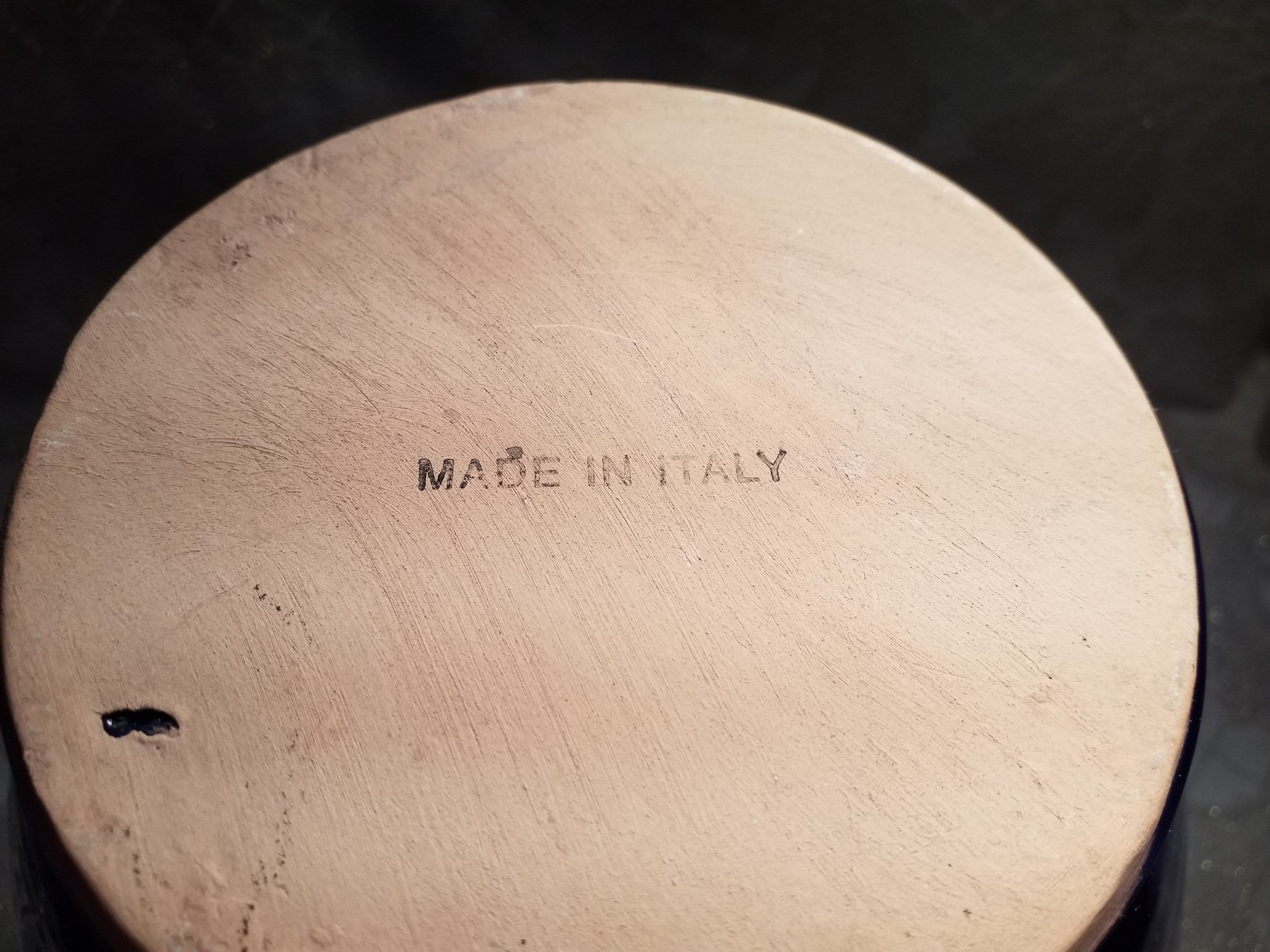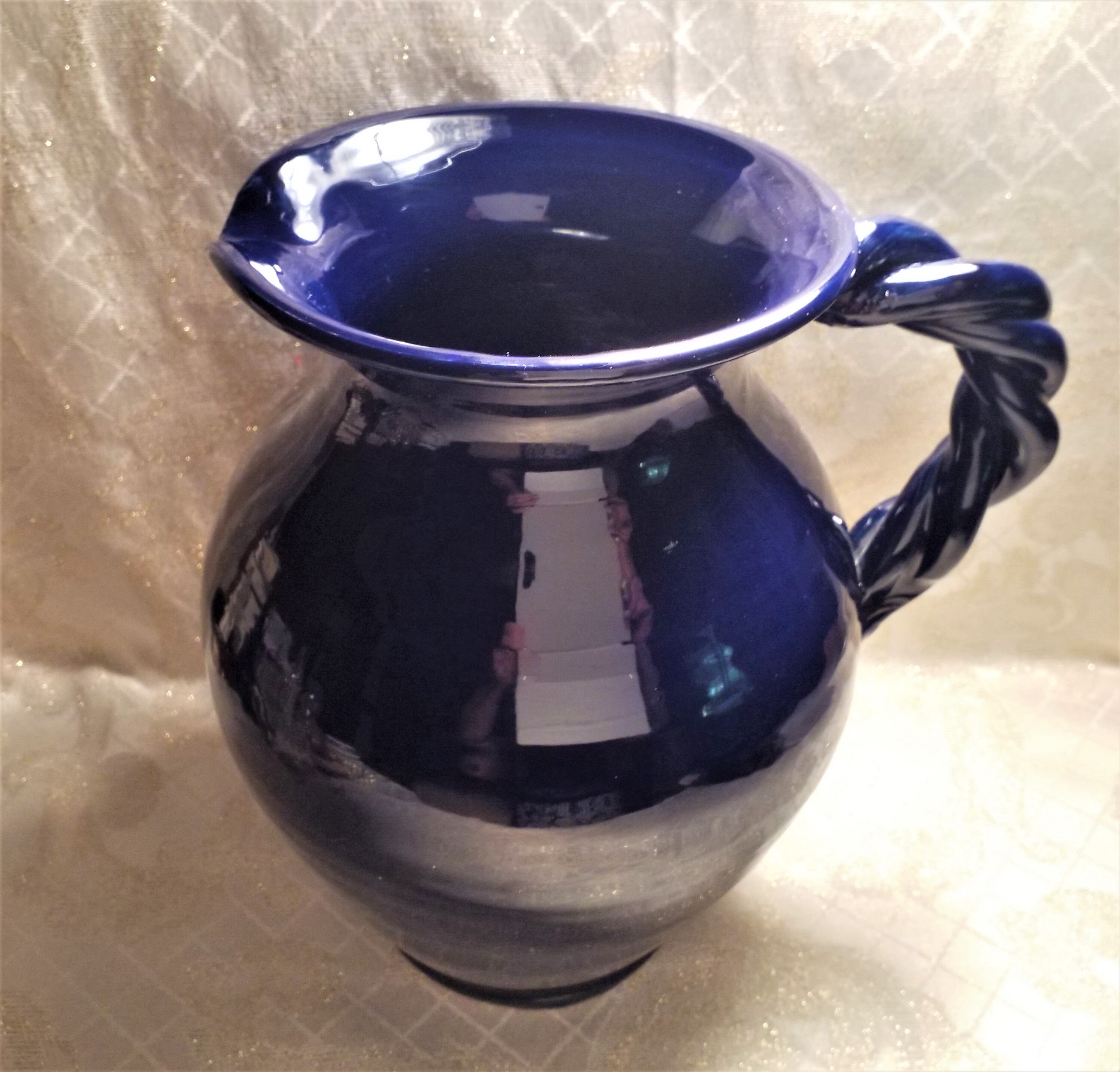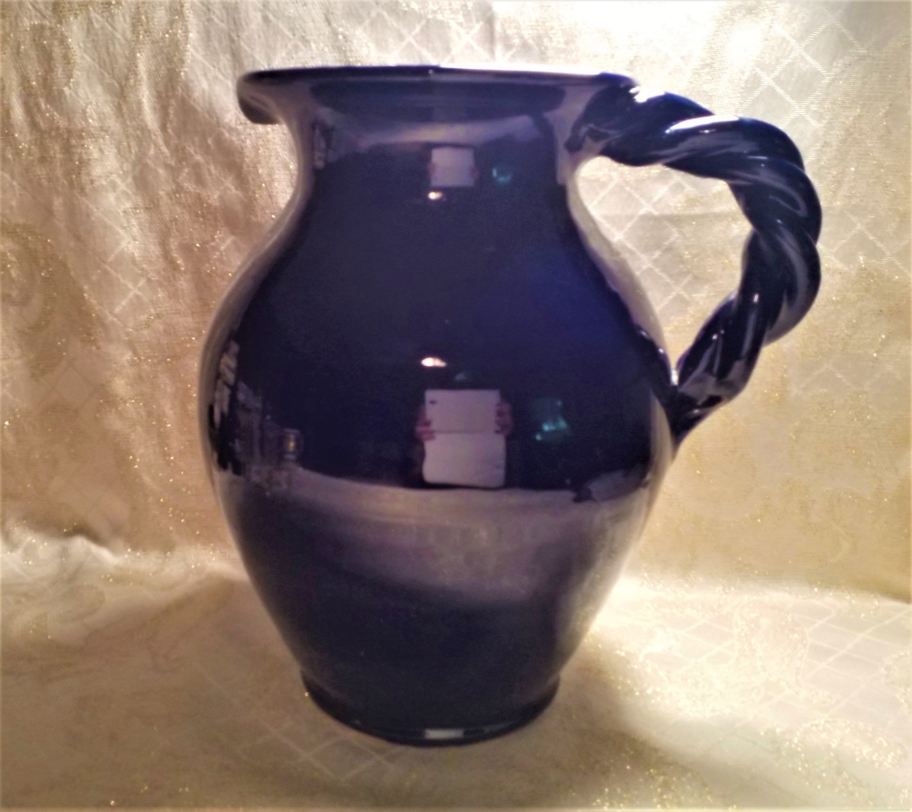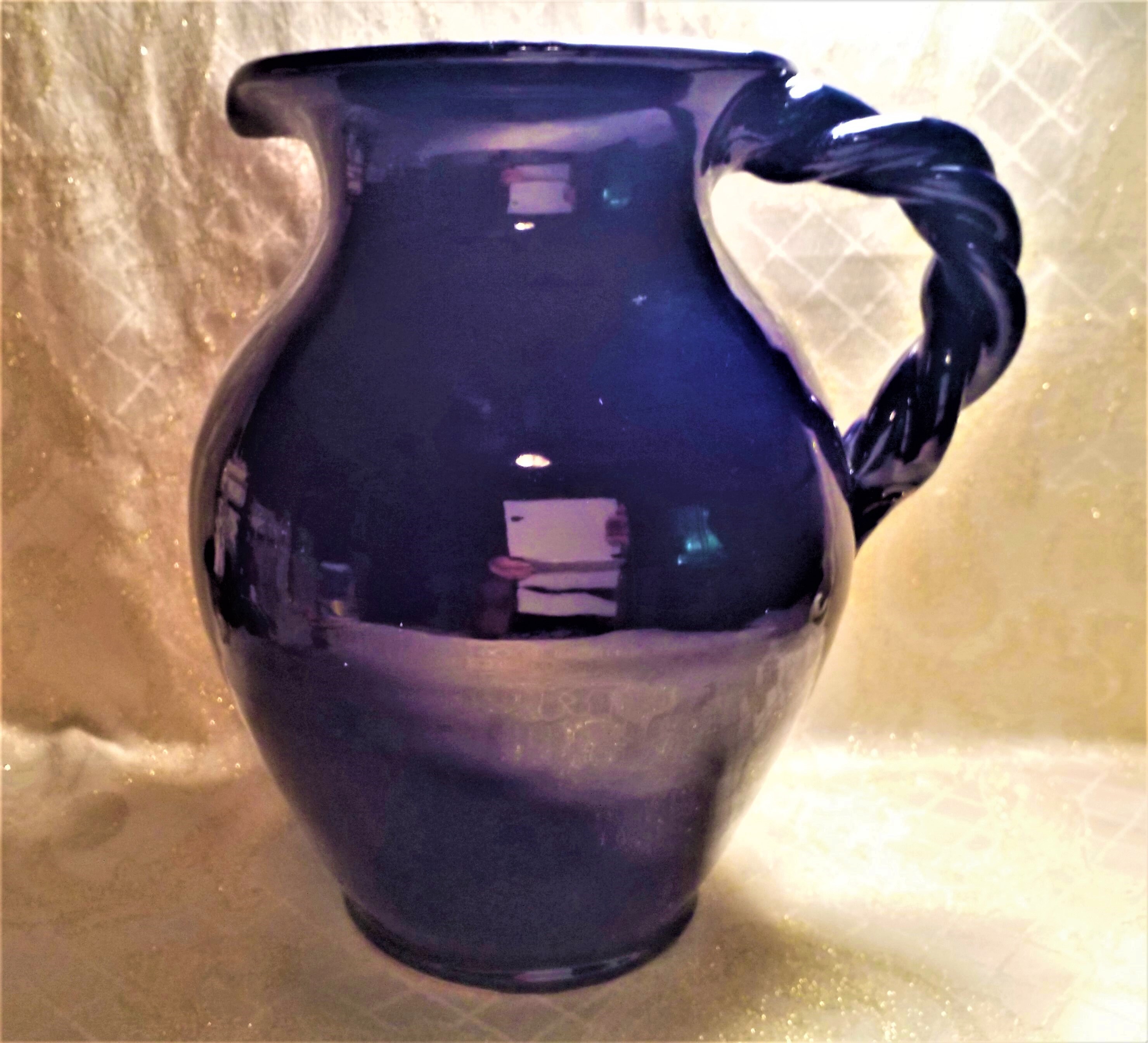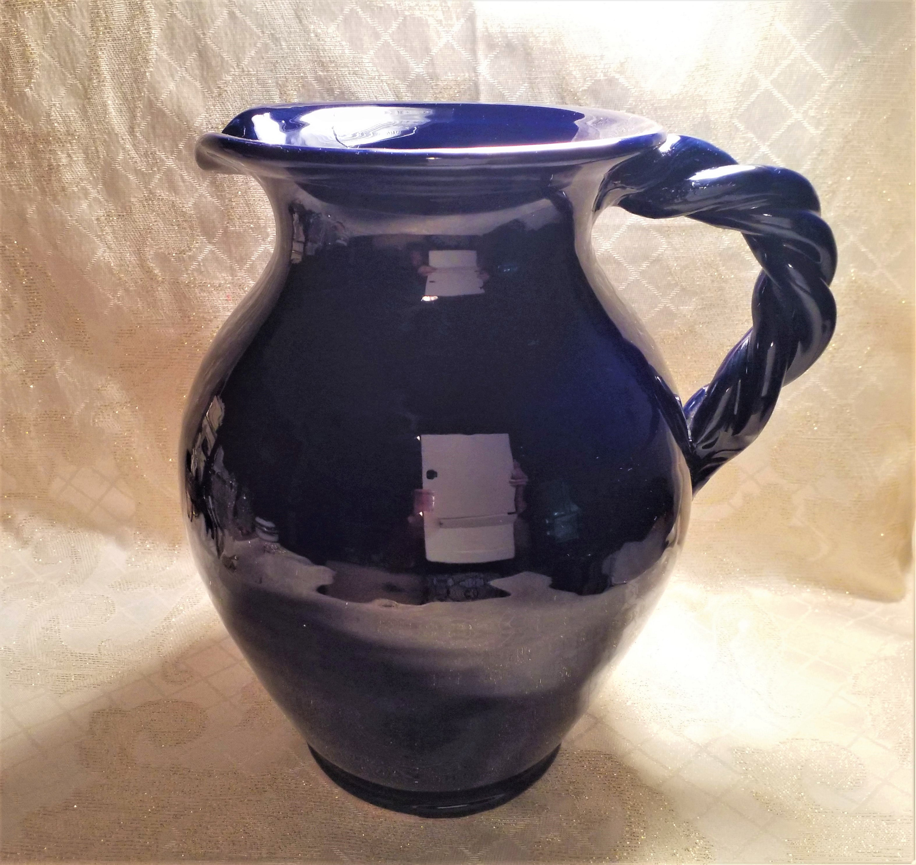 Beautiful cobalt blue extra large pitcher, made in Italy with a ornate twisted handle making it a focal point for centerpiece display. This pitcher is approximately 40 ounce size perfect for the largest bouquet. Measurements are 10 1/2 inches tall and 10 inches wide. Very pretty.