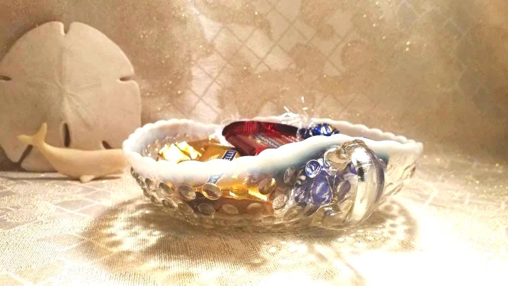 Beautiful vintage dish in an elegant design. Pretty white milk glass rim on a clear dotted glass heart shaped bowl with a fingertip handle. Exquisite display for candy, nuts or berries. Ideal wedding or special occasion gift. Measurements are 7 inches handle to spout 6 1/2 inches wide and 2 inches tall. Sorry candy not included.