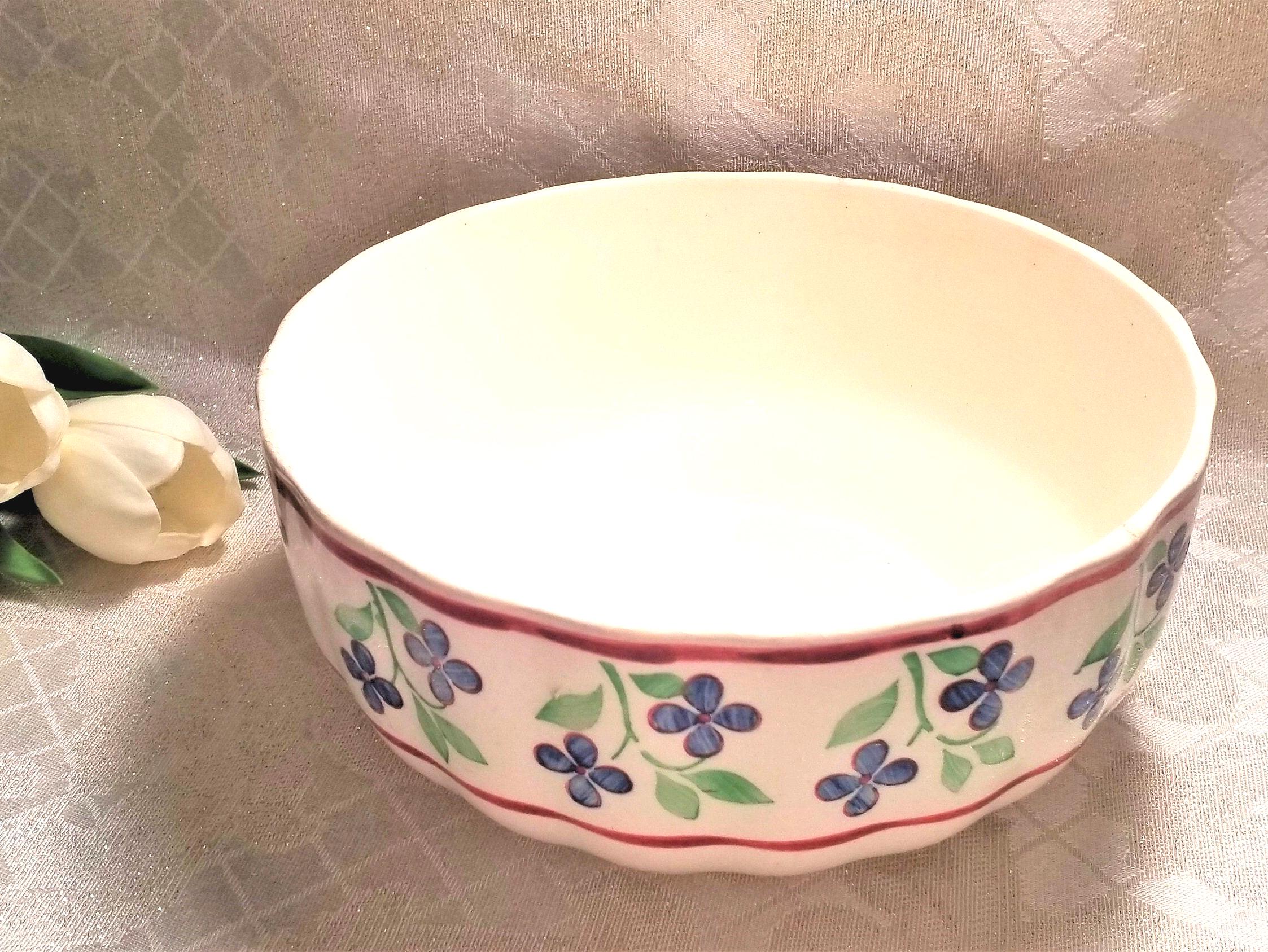 Listed for you here is a beautiful large vintage bowl. This bowl has a pretty and simple floral design. Made in Germany of fine quality porcelain. Hallmarked with origin and ID numbers on the bottom. This bowl is in excellent condition for age of the 1940s with only minor glazing and rough edges on bottom and a few small chips on the outside of the top rim, see the last two pictures for minor age-related wear, as part of the description. Measurements for this large bowl are 4"tall 8 1/4"wide. Perfect for kitchen use or to display with other antique kitchenalia in French country Kitchen decor.