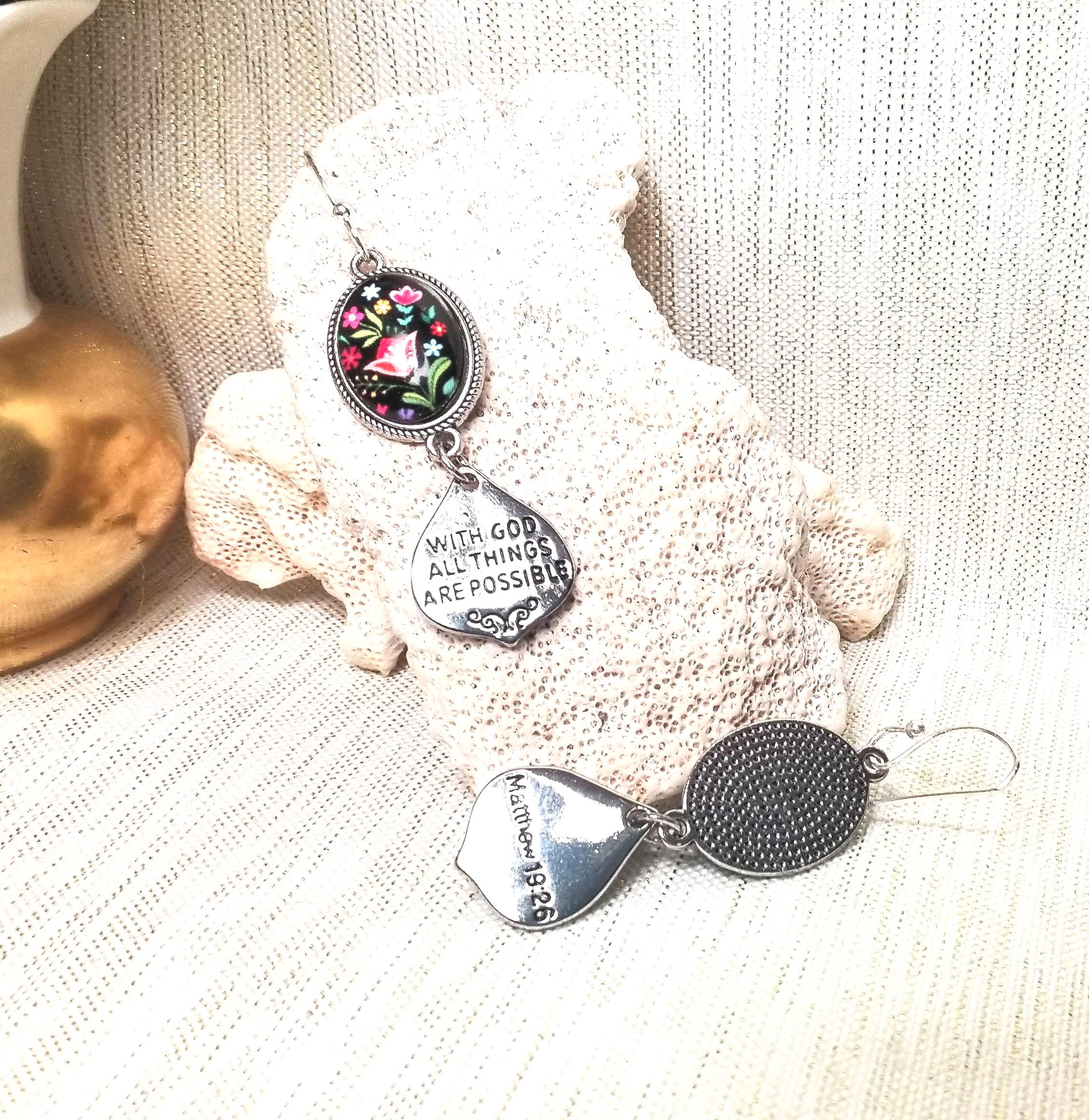 Beautiful handcrafted earrings with an exceptional design and special message from Mathew 19:26 inscribed on the back and on the front With God All Things Are Possible. Perfect for weddings and special occasions. Silverplated french earwires for comfort. Elegant hologram type floral cabochon as flowers glisten with changing light. Lightweight and measurements are 1/2 inches wide and approximately 1 1/2 inches long. Ideal for gift jewelry.