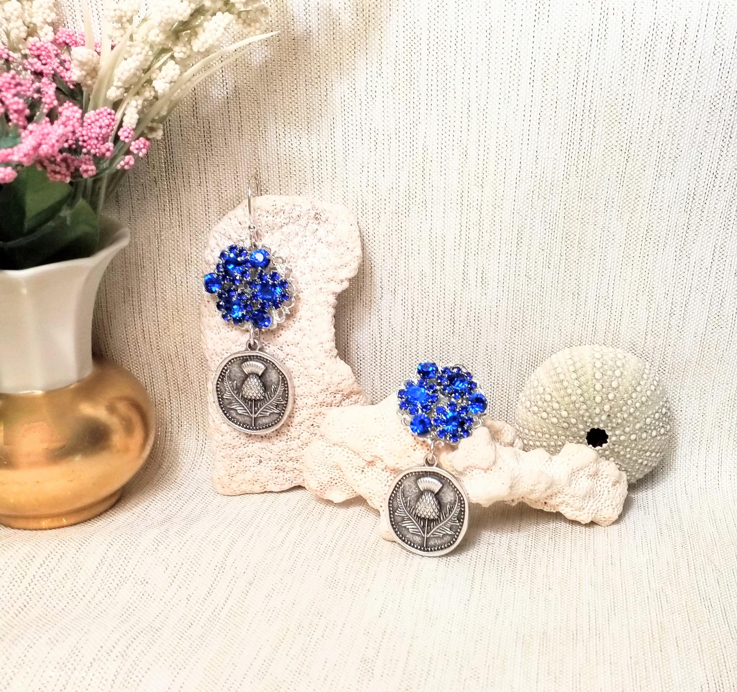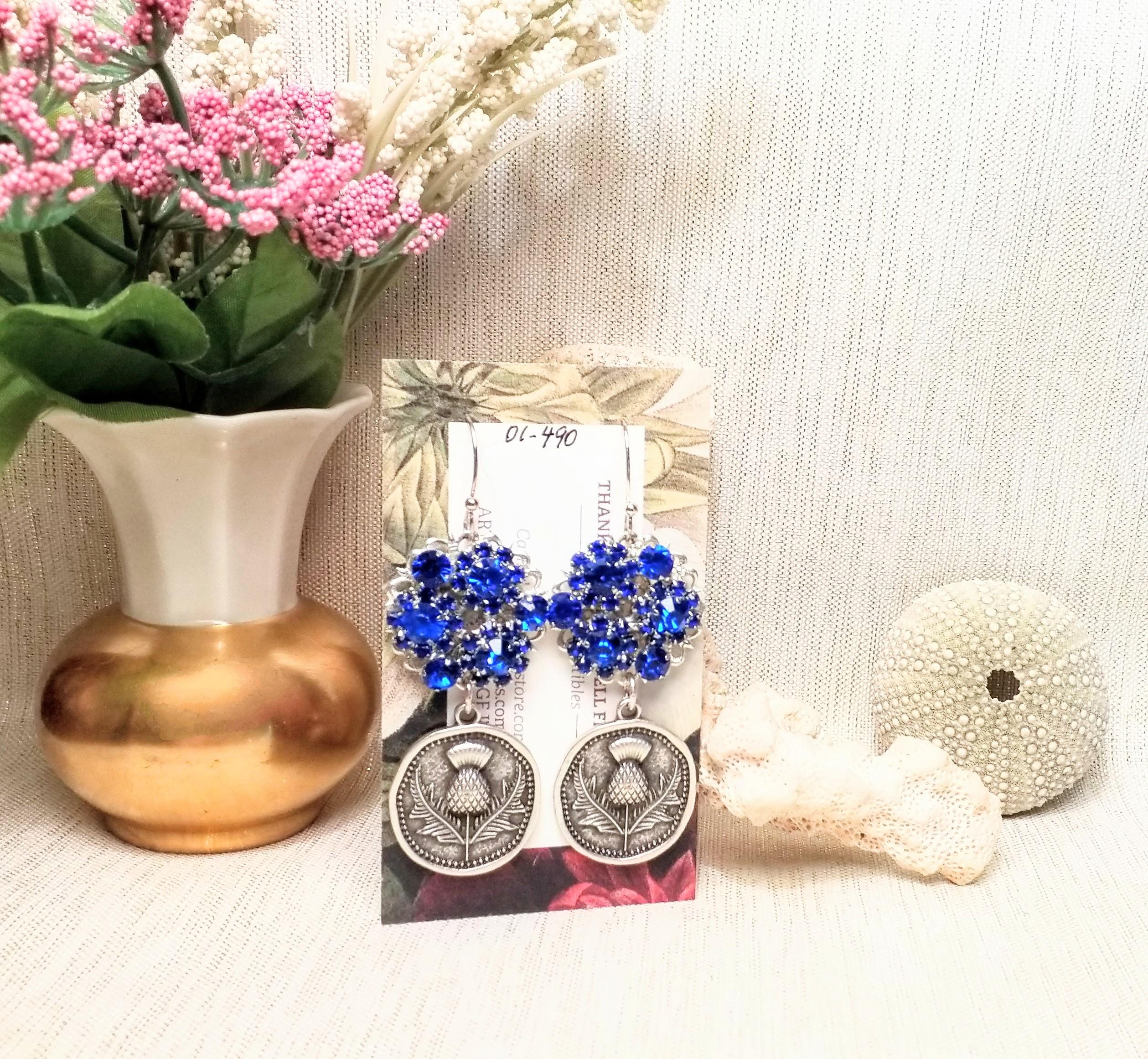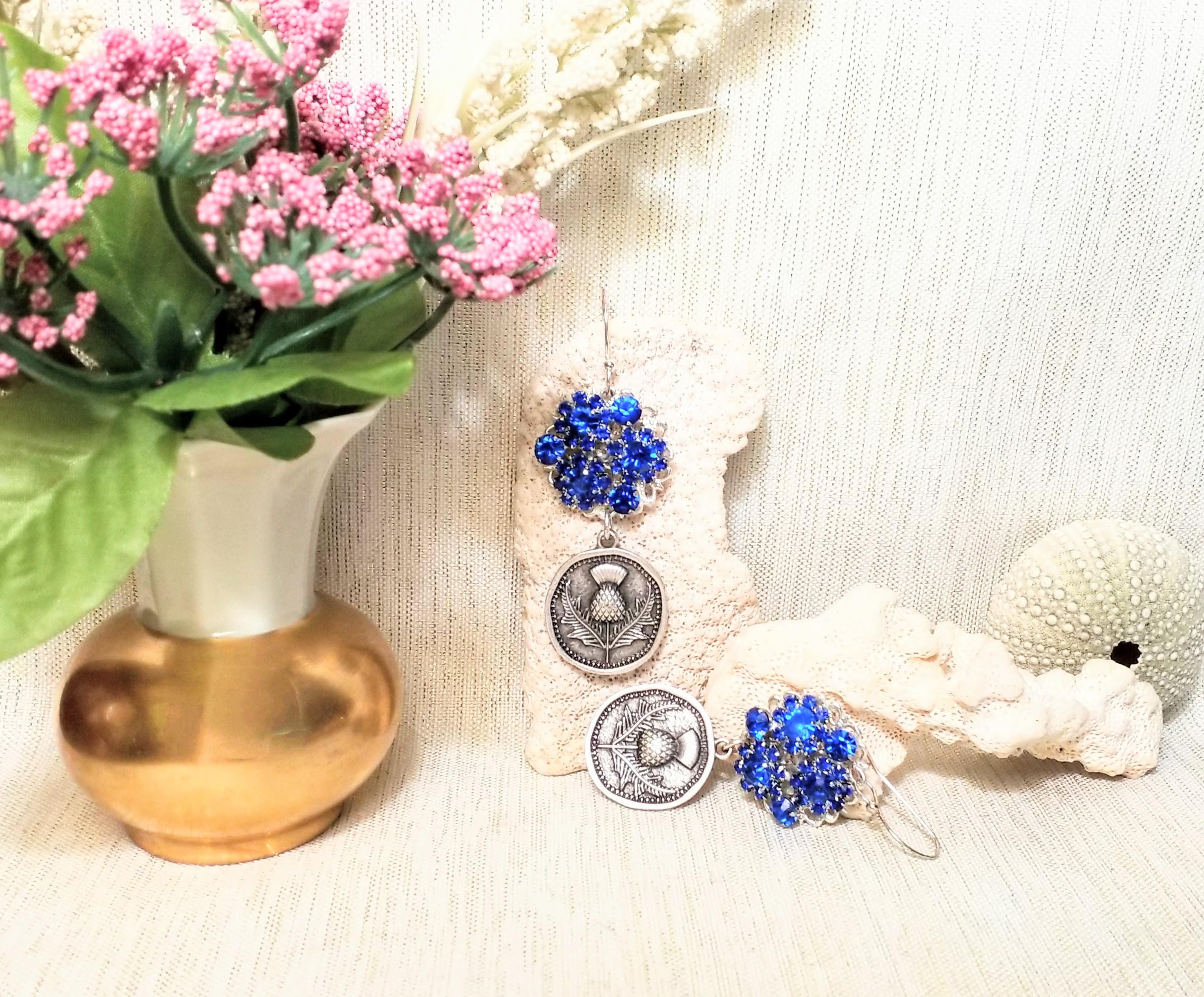 Earrings Handcrafted Beautiful and elegant Scottish style crafted for you by Carmel Collectibles. Gorgeous royal blue rhinestones and exceptional Thistle charms. Ideal gift jewelry. Measurements are 2 1/2 inches long and 1 inch wide. Lightweight and silverplated french earwires for comfort.