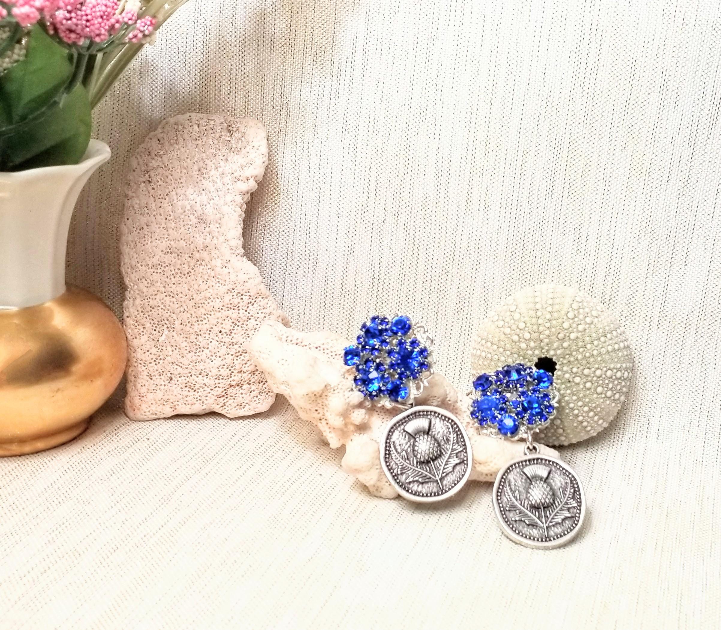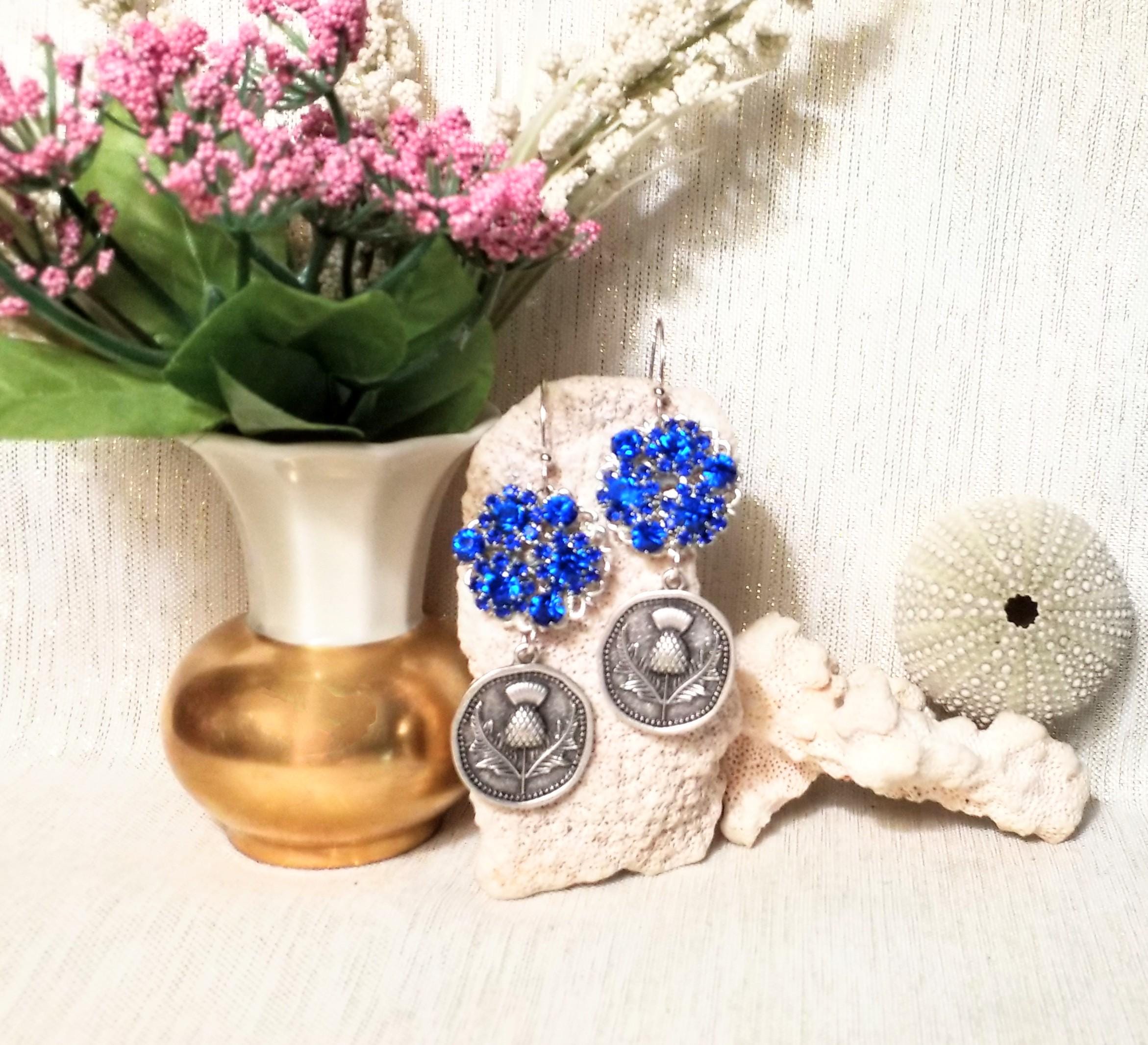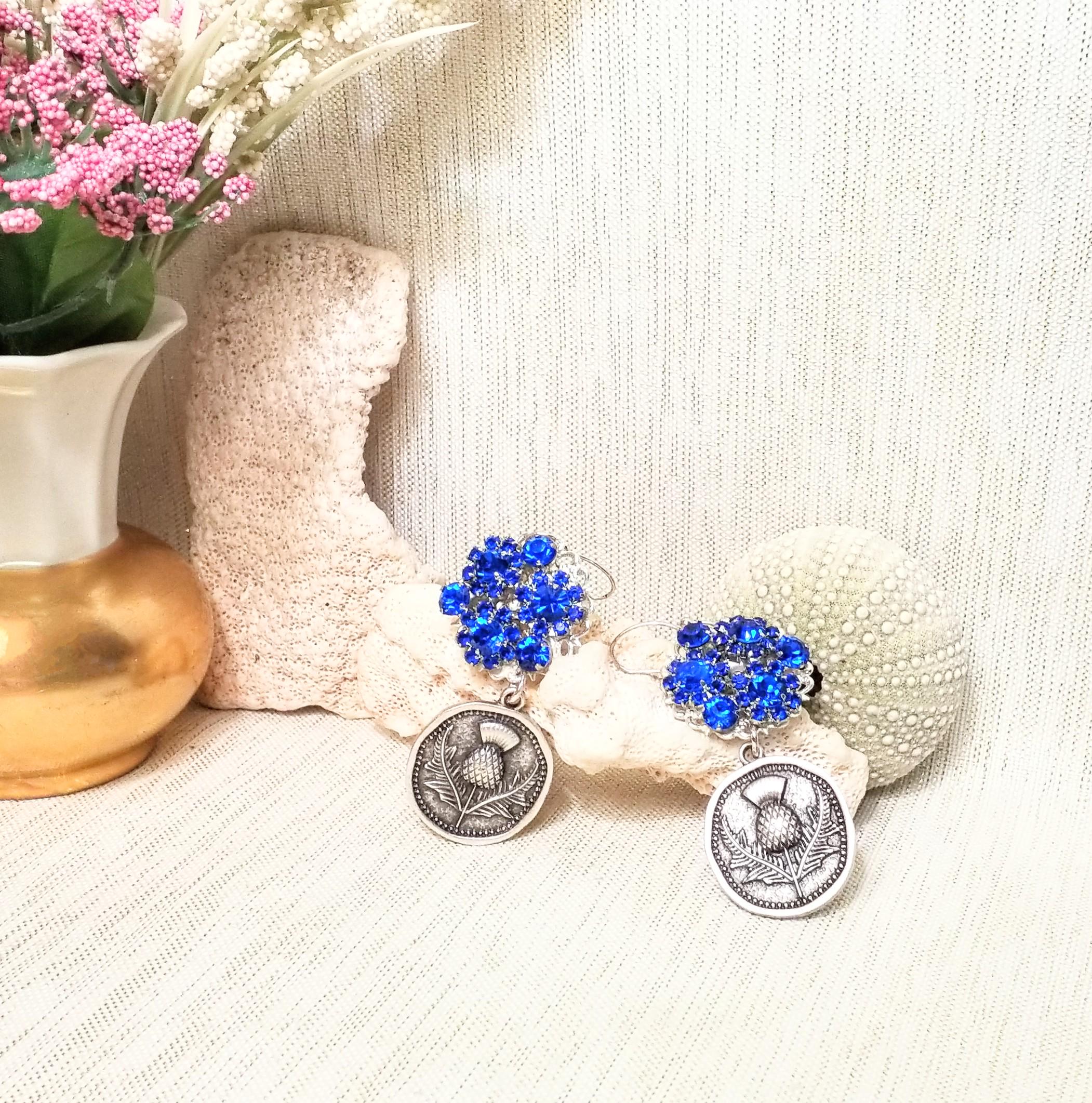 Earrings Handcrafted Beautiful and elegant Scottish style crafted for you by Carmel Collectibles. Gorgeous royal blue rhinestones and exceptional Thistle charms. Ideal gift jewelry. Measurements are 2 1/2 inches long and 1 inch wide. Lightweight and silverplated french earwires for comfort.