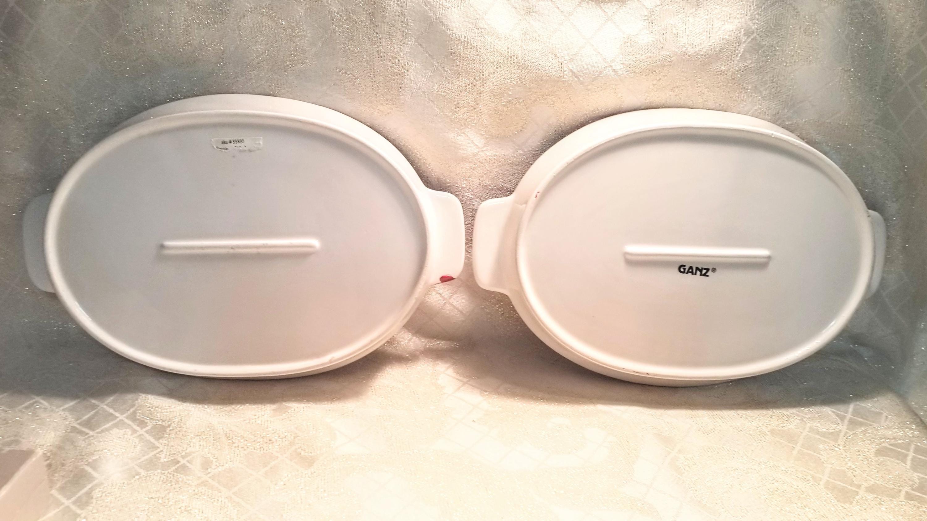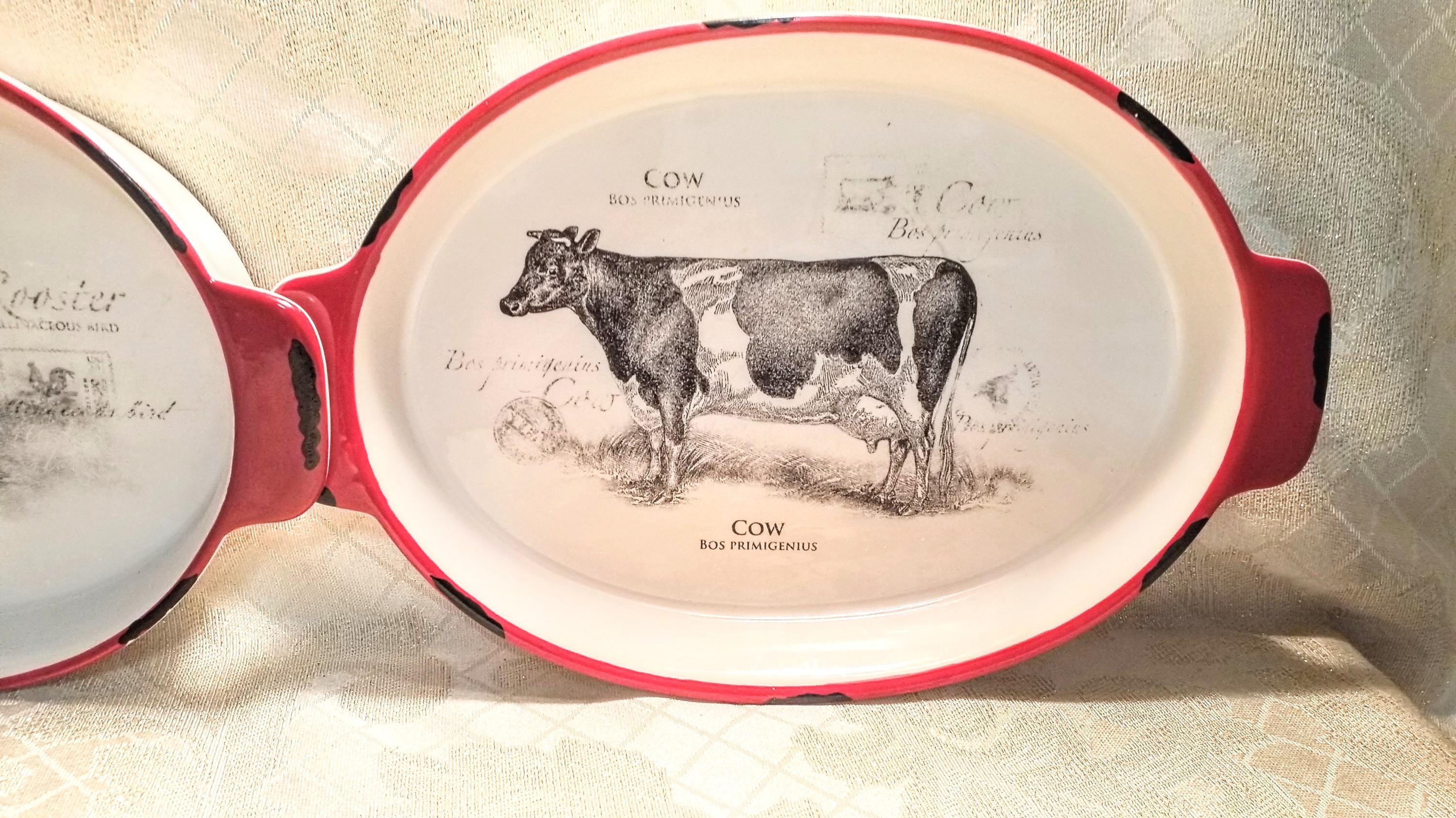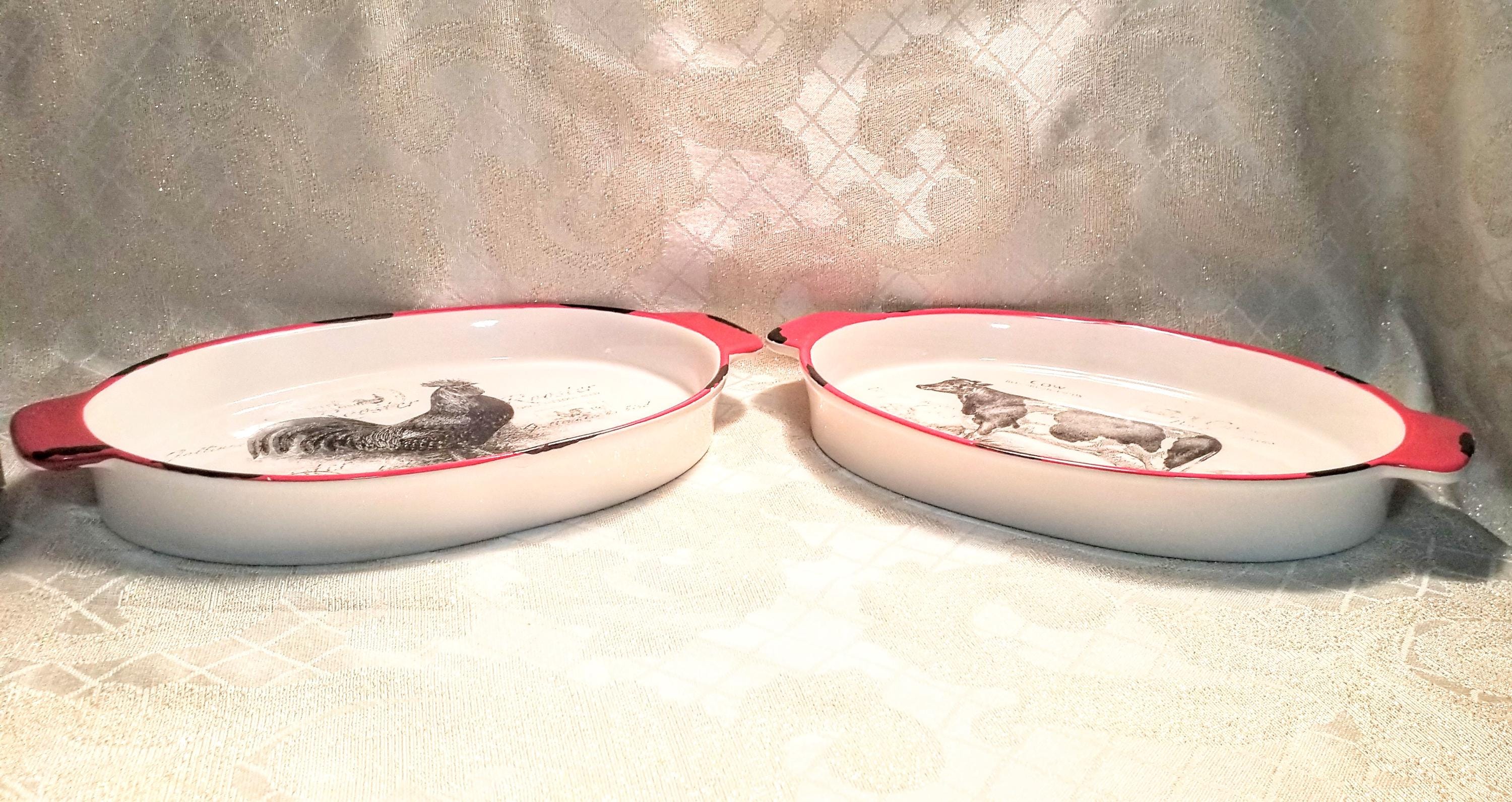 Ganz farmhouse decor casserole dishes with a classic country style. Detailed rooster and cow decorate these two dishes with a black and red trim on white background. Measurements are 11 1/2 inches long 8 inches wide and 1 1/2 inches tall. Excellent for elegant country decor.