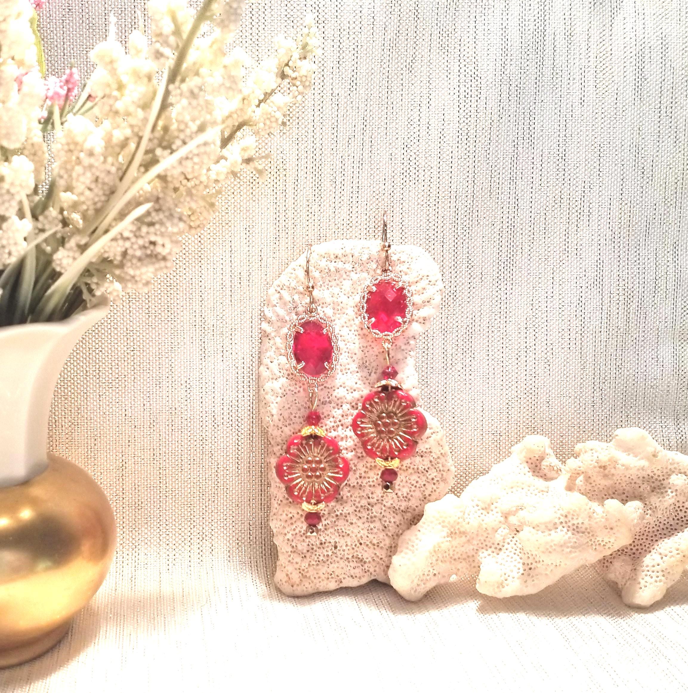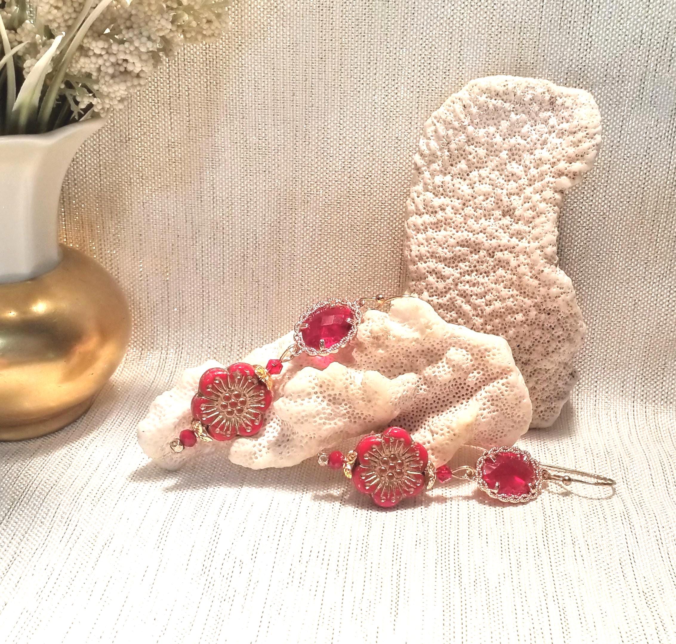 Elegant handcrafted earrings with beautiful style and design. Unique Czech red floral with crystal connectors. Gold plated french earwires for comfort. Measurements are 1 inch wide and 2 inches long. Ideal gift jewelry, perfect for holidays and special occasions.