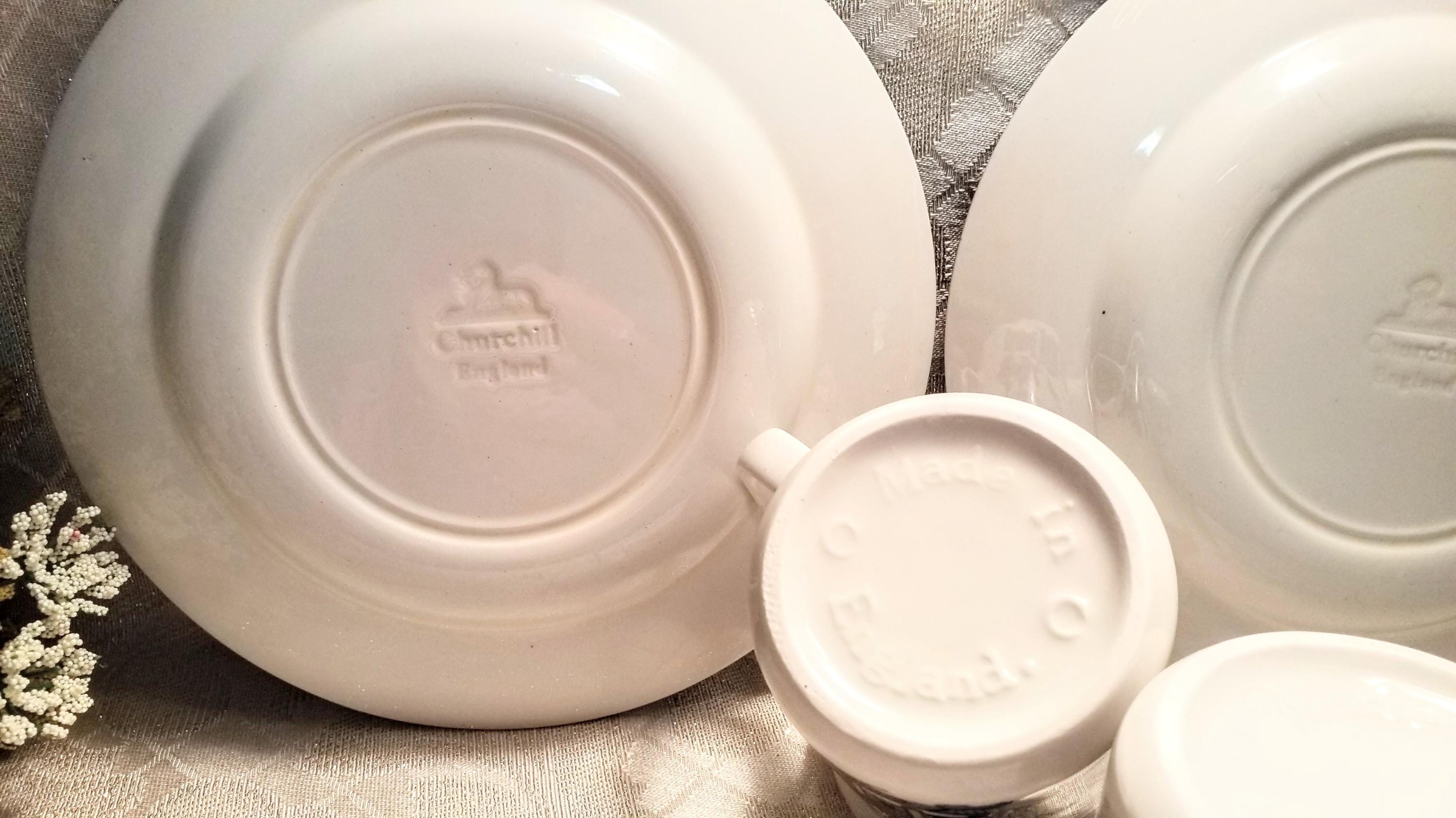 This beautiful vintage Blue Willow Ware Set by Churchill is exceptional for daily use or country decor. Perfect quality, ideal addition to blue and white decor. Holds up very well with heavy use and always keeps the new look. Made in England. Measurements are 8 inches for the two deep dish luncheon/dinner plates and 4 inches tall 3 inches wide at the top of the two 8 ounce mugs. Perfect vintage gift set.
