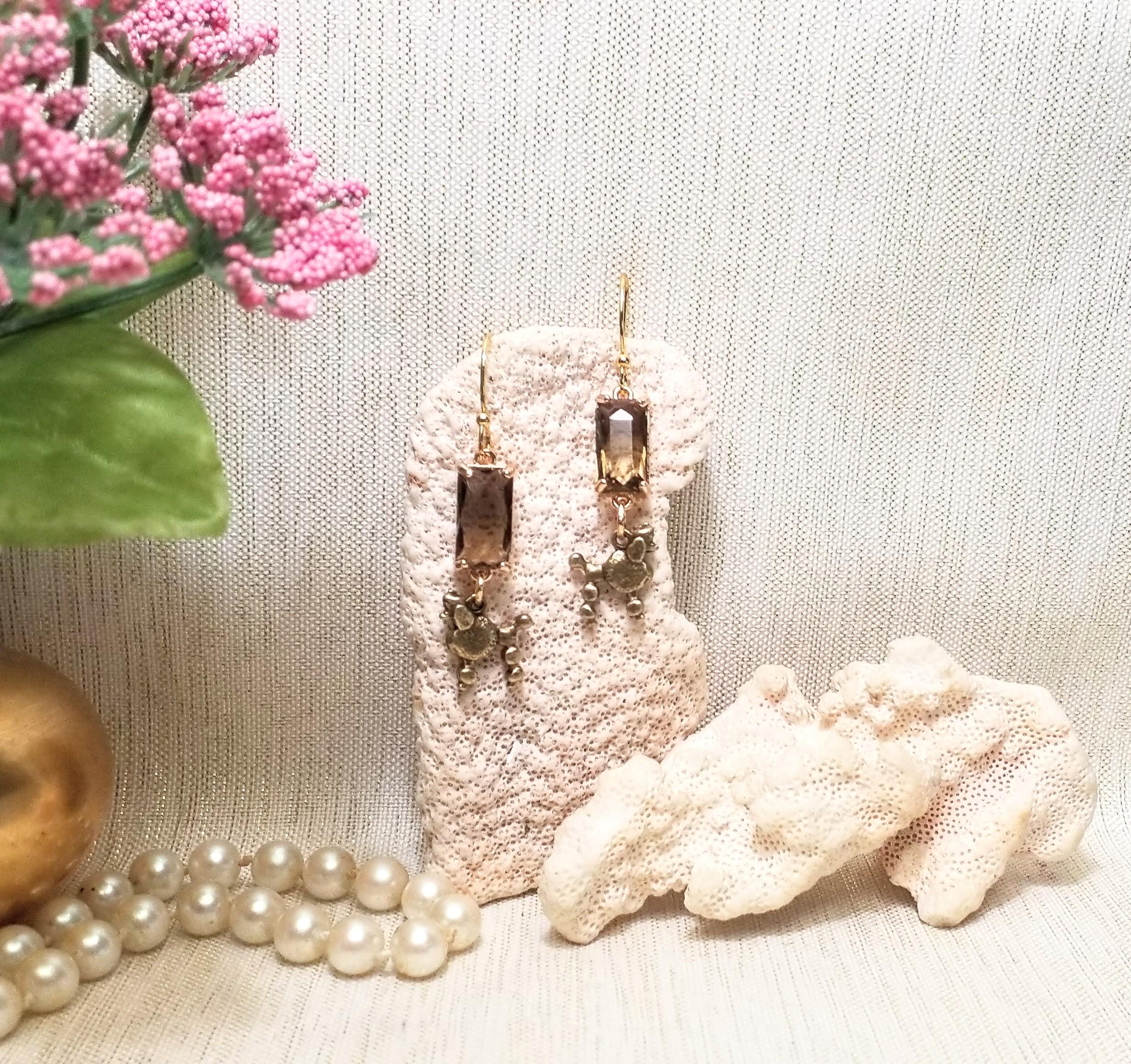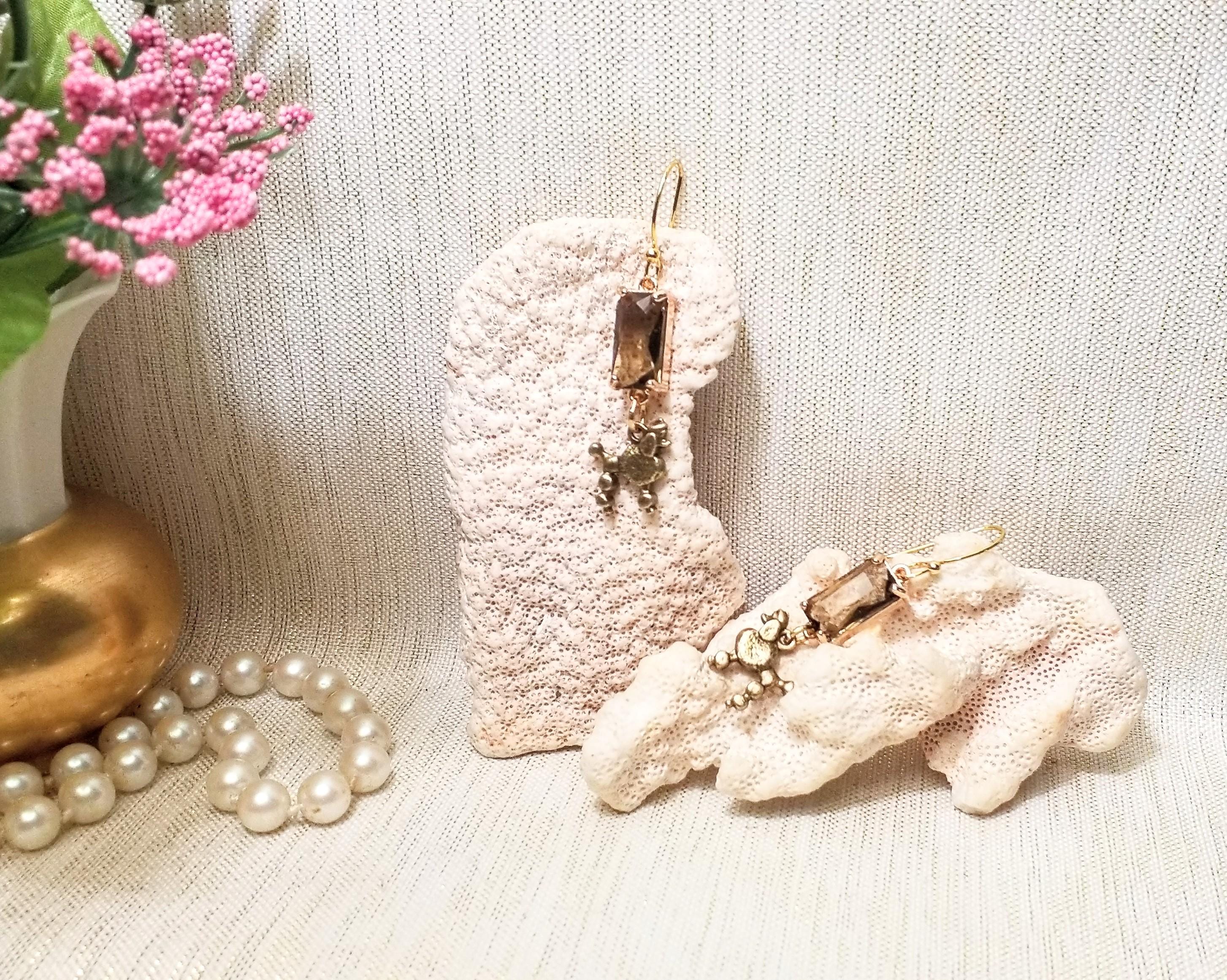 This is a beautiful elegant pair of handcrafted earrings with clear brown crystals and adorable little golden bronze poodle charms. Measurements are 1/2 inches wide and 1 1/2 inches long. Perfect for cute pet jewelry. Ideal gifts.