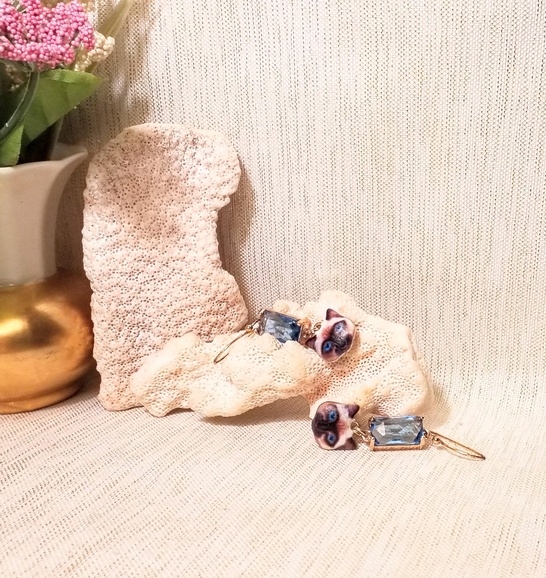 This pair of adorable handcrafted earrings are elegant with sky blue crystals and the cutest little Siamease faces with bright blue eyes. Measurements are 1/2 inches wide and 1 1/2 inches long. 18k gold plated earwires for comfort. Ideal gift jewelry.