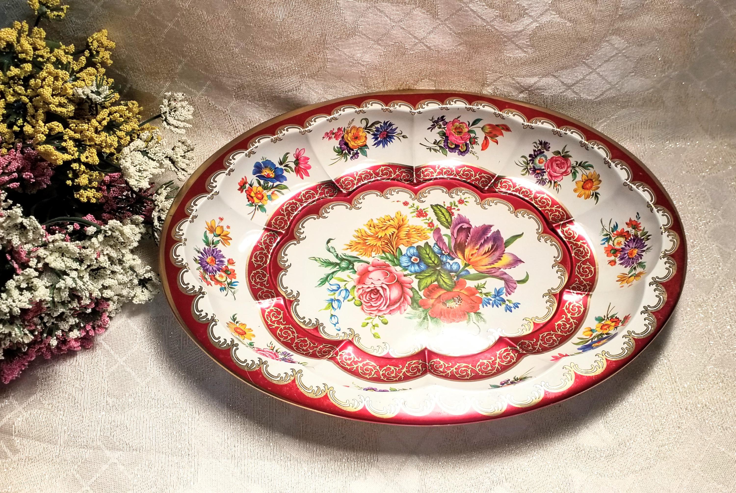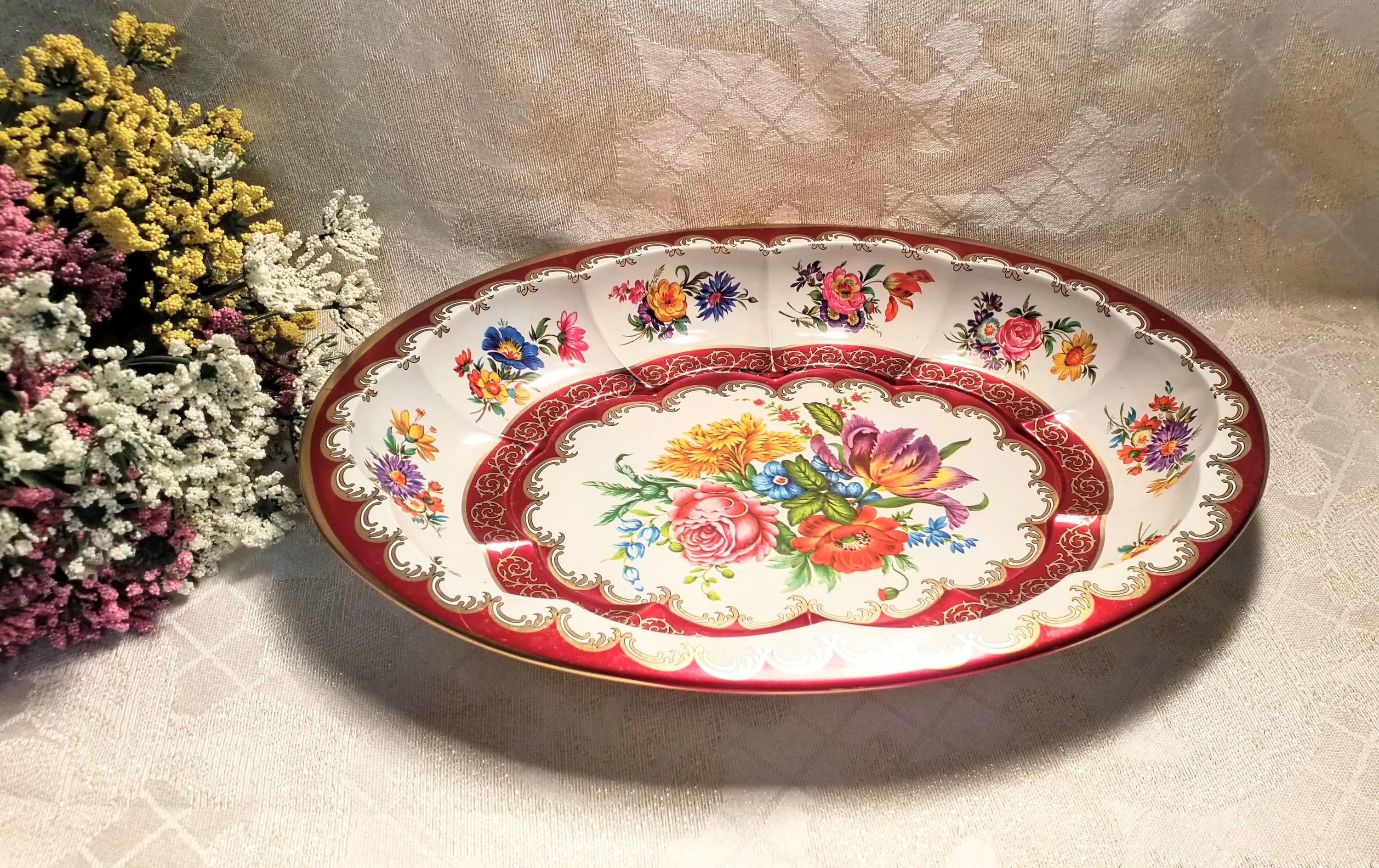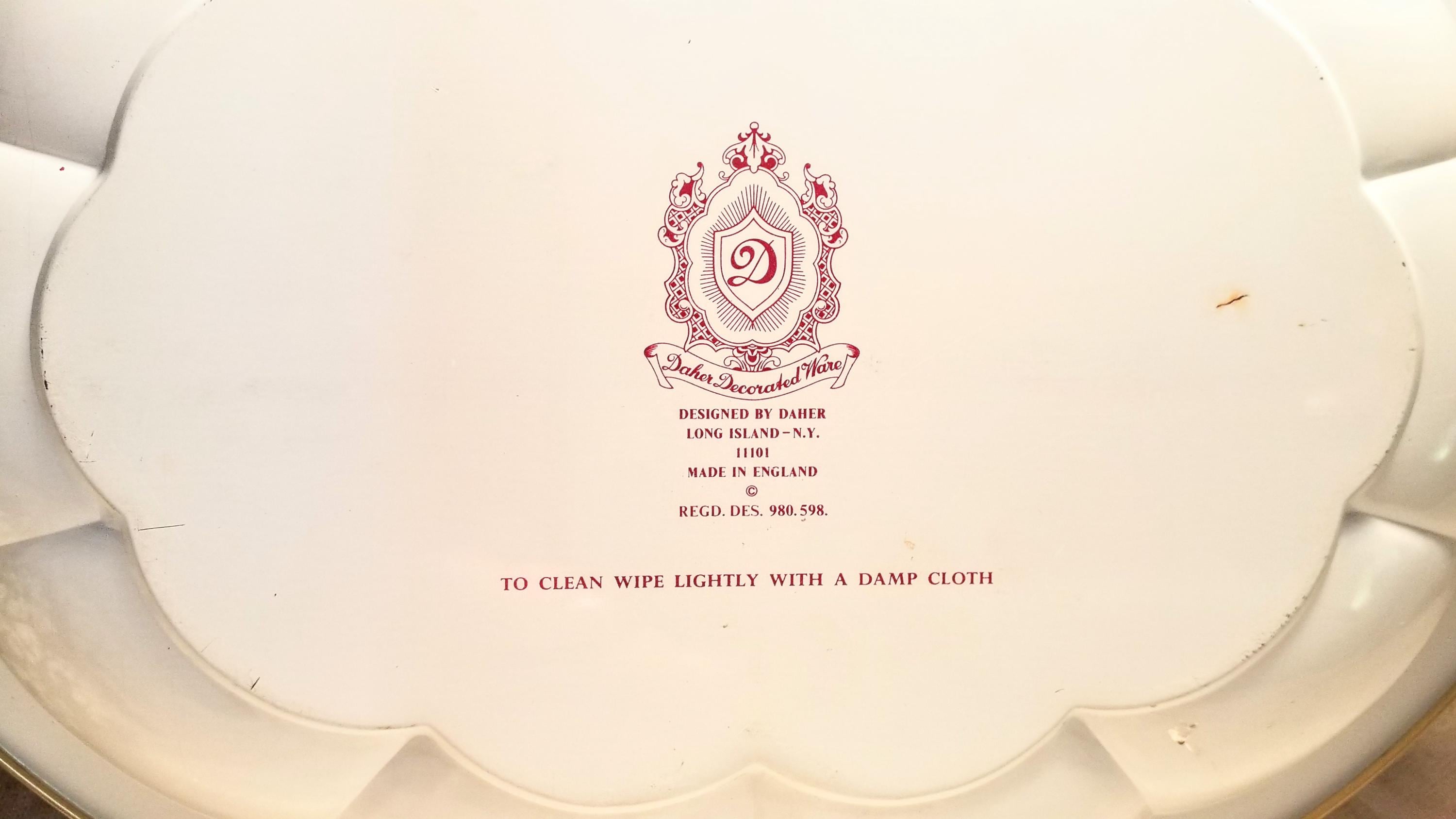 Beautiful Daher Ware large metal plate. Hallmarked on back. Made in England and decorated in Long Island, NY Measurements are 12 3/4 inches long 9 1/4 inches wide and 1 1/2 inches tall. Exceptional display decor.