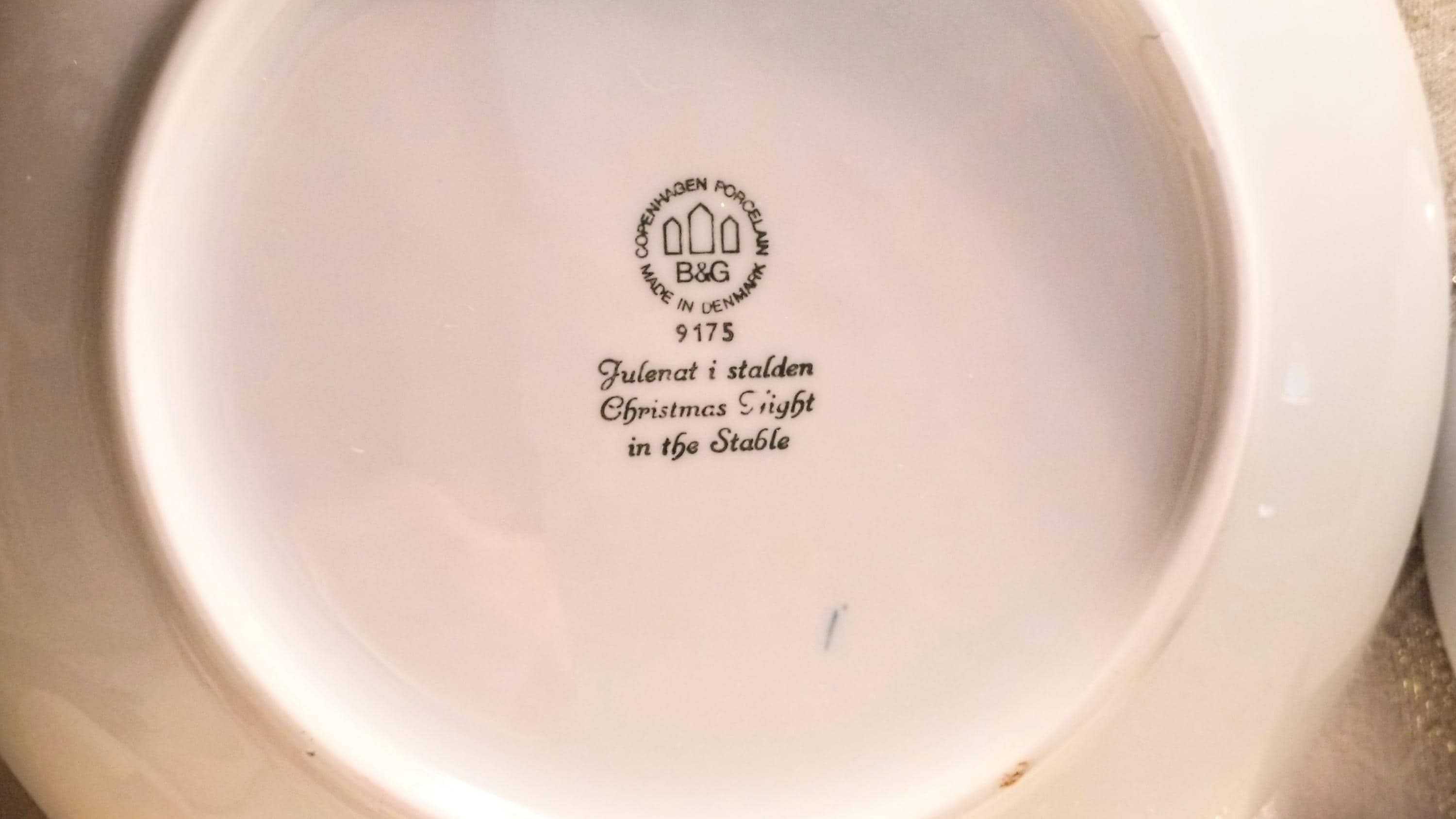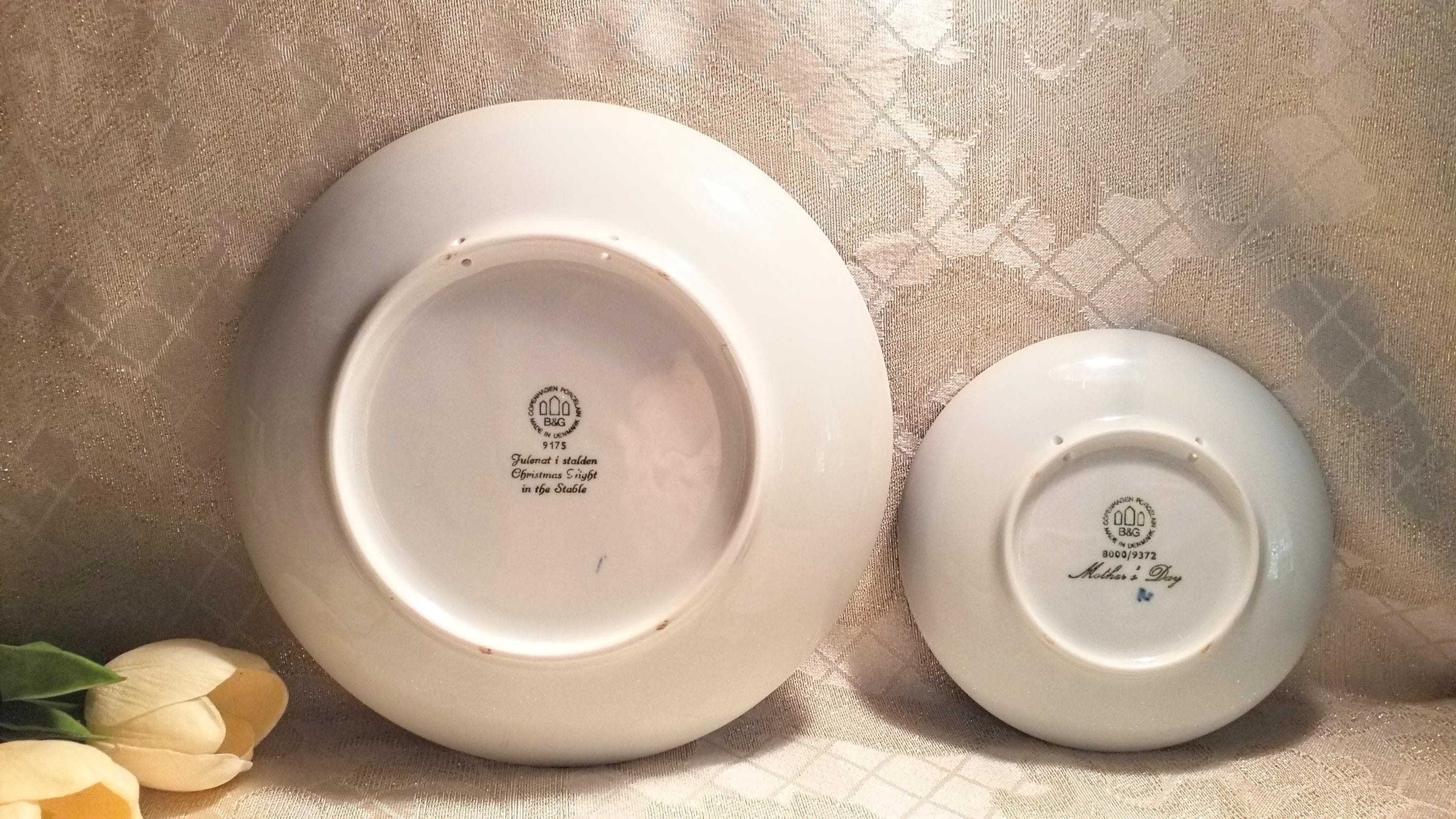 Exceptional set of Bing & Grondahl Horse Plates for decor only, holes in back for hanging. B & G founded in 1853 for excellent porcelain. Made in Denmark. Blue and white glaze. Large plate with two horses in the stable entitled 1895 Jule After 1975 Julen at i Stolden (Christmas night in the stable) measurements of 9 inches wide the smaller plate entitled Morse Dag 1972 (Mothers Day) with measurements of 6 inches wide. Both plates are exquisite for horse decor.