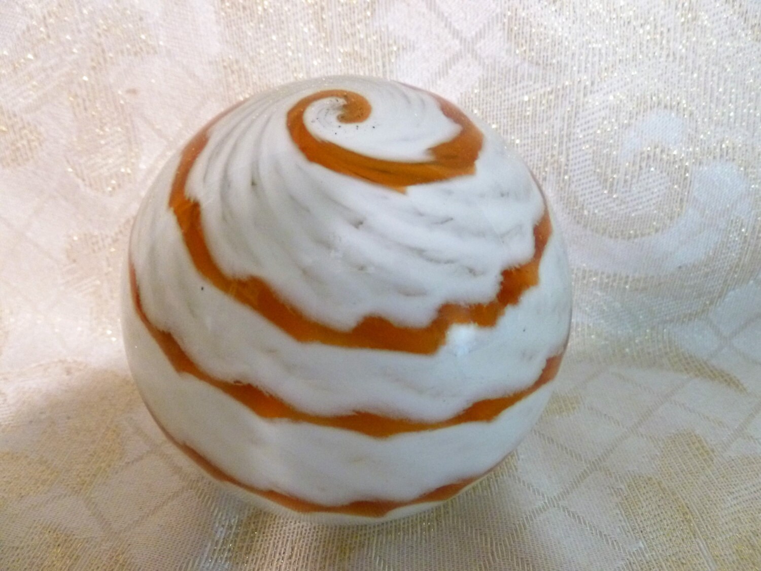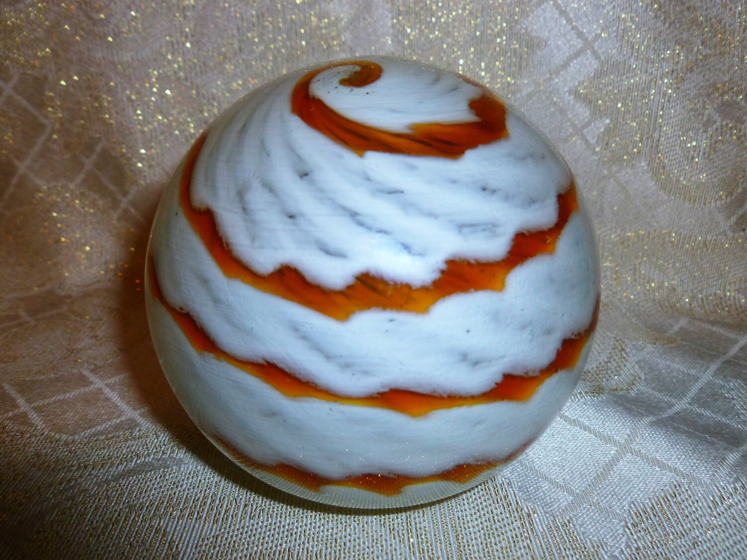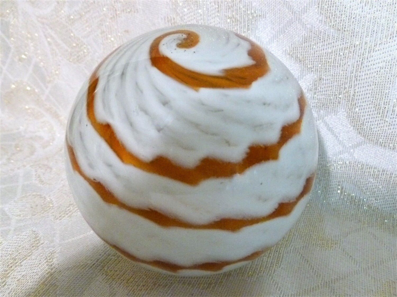 Listed for you here is an exceptional example of artistry from Fratelli Toso. In this hand blown heavy glass paperweight with a white cloud design and a clear caramel swirl, you can see the quality in detail. Peering into the finish hole on the bottom you can see small versions of the paperweight in the contained air bubbles, very unique and original. Heavy glass. Measurements are 3 1/2"tall 4"wide. Vintage collectible Italian art glass.