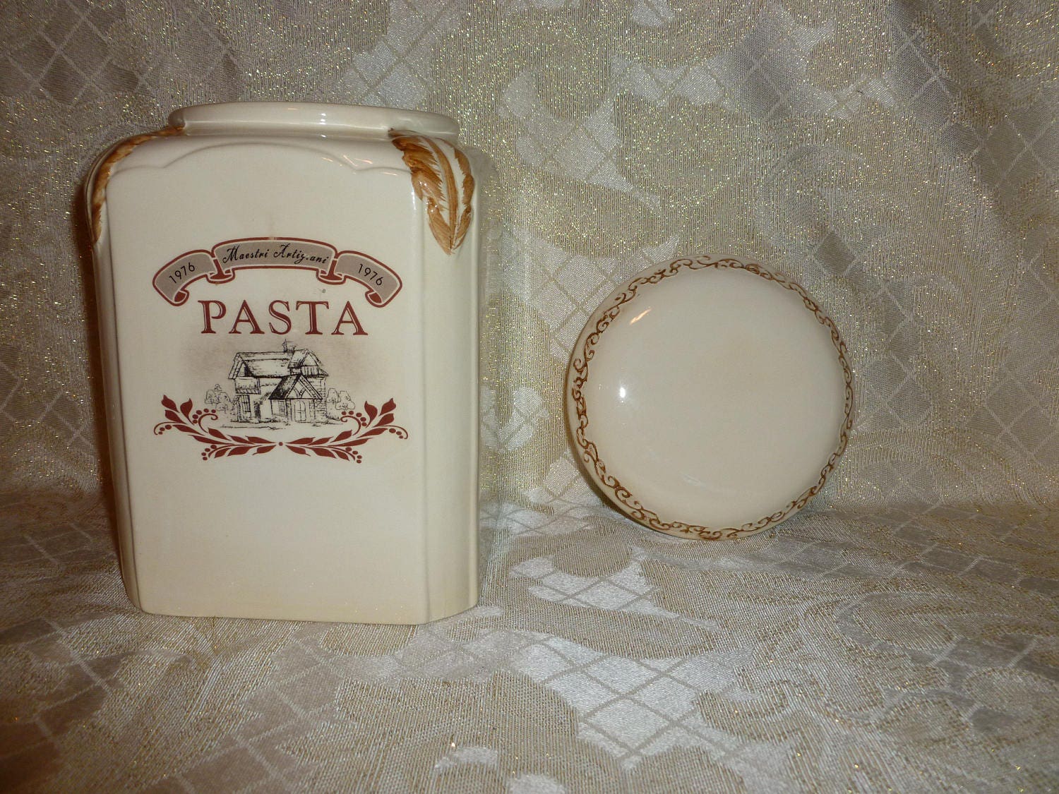 Listed for you here is a large pasta container with a pretty design on front. Beautiful for a vintage display. Made in Italy. Large wide mouth canister with lid. Measurements are 8 1/2"tall 5 1/2"wide.