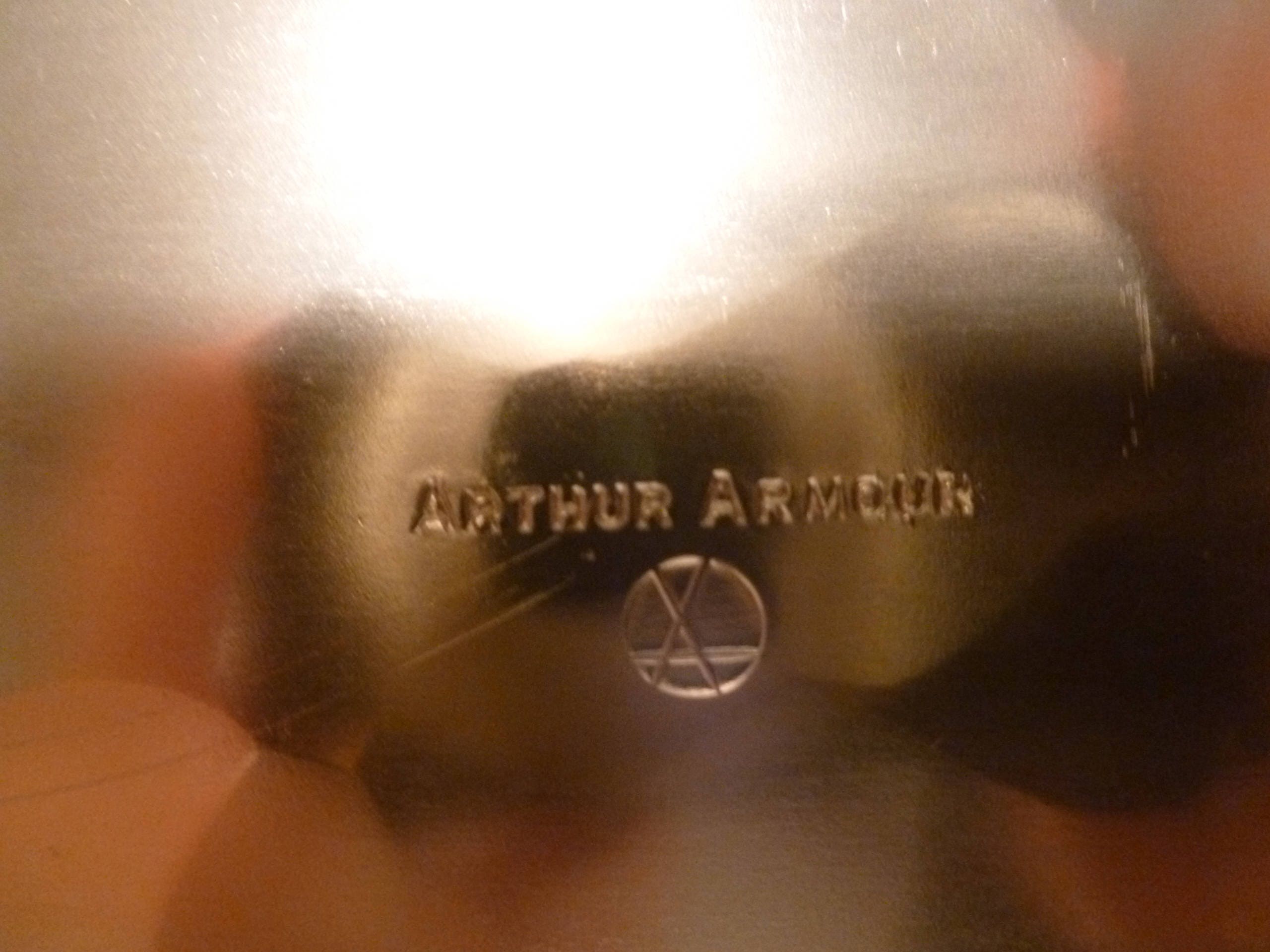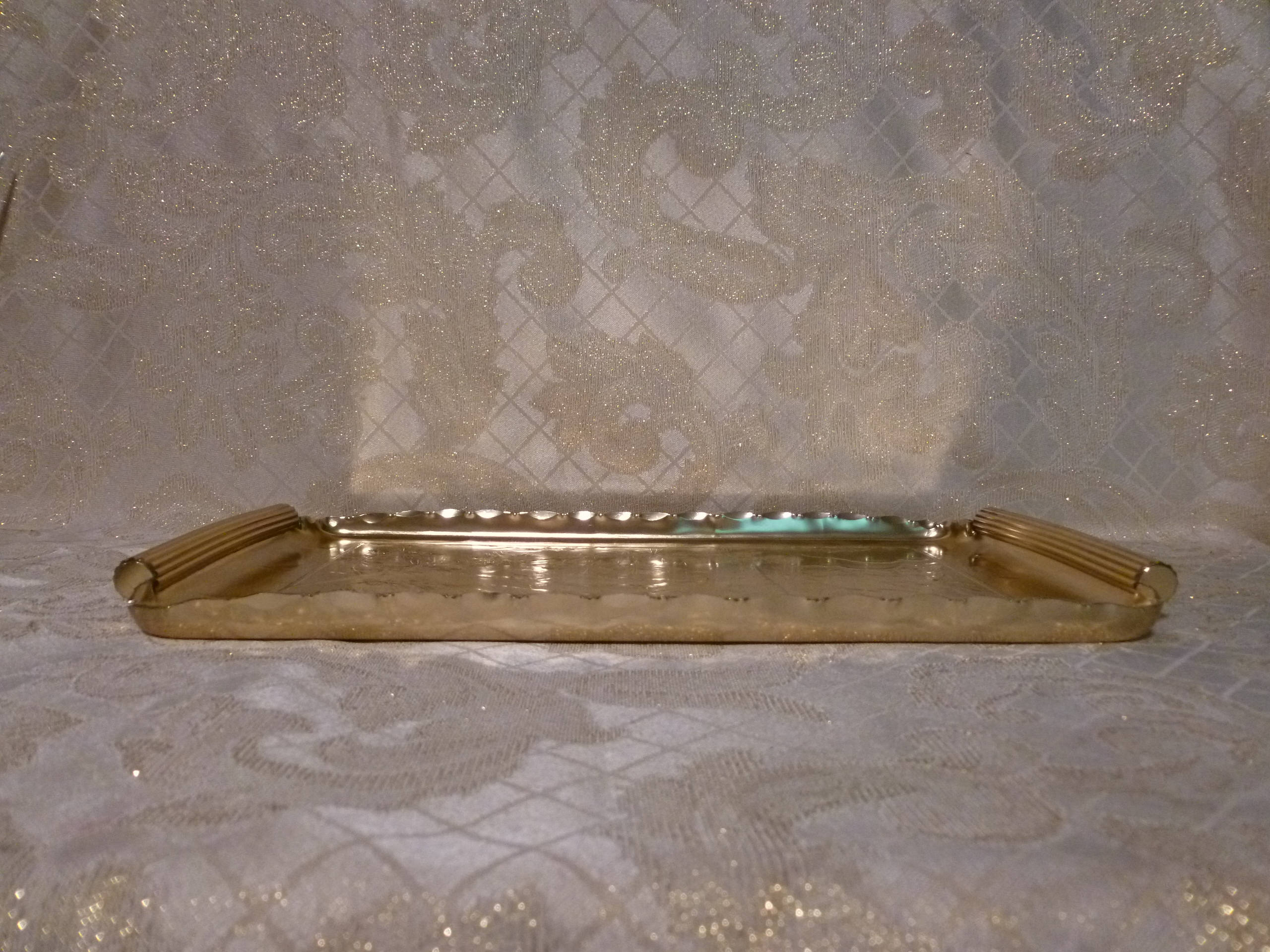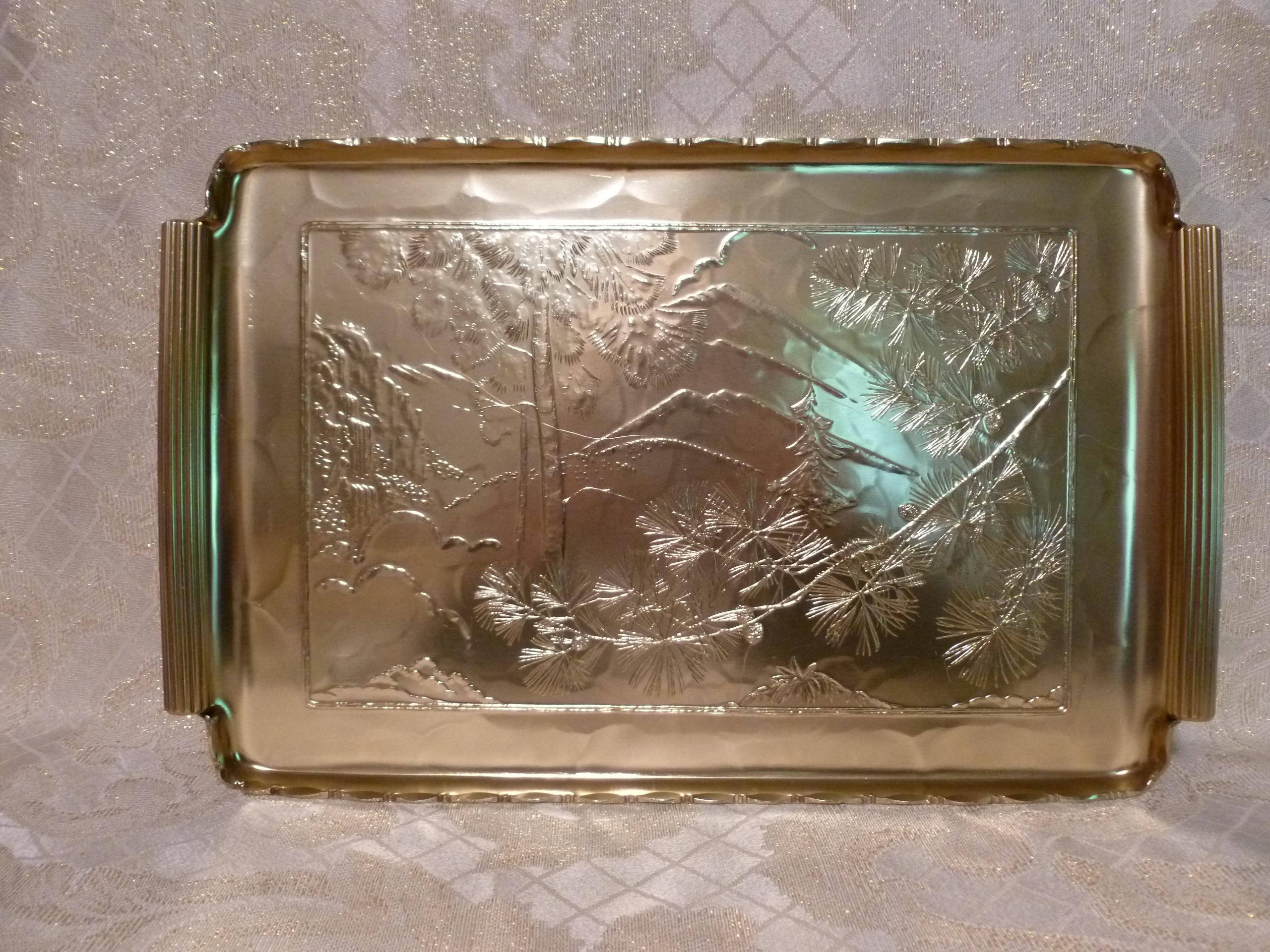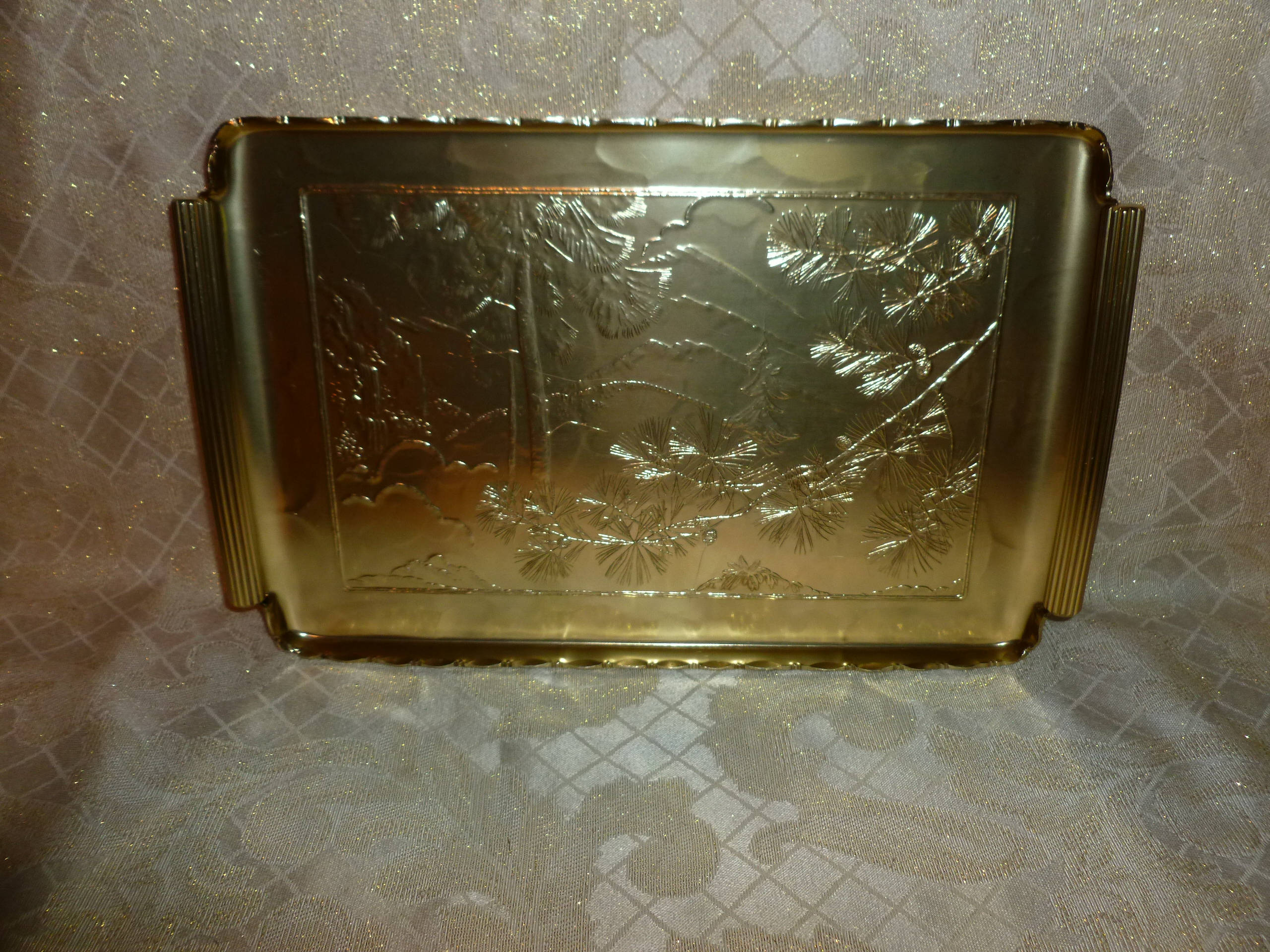 Listed for you here is a beautiful scalloped edge gold tray designed by Arthur Armour, with an exceptional detailed mountain scene. Measurements are 14 1/2"long 9"wide. Beautiful display when not in use.