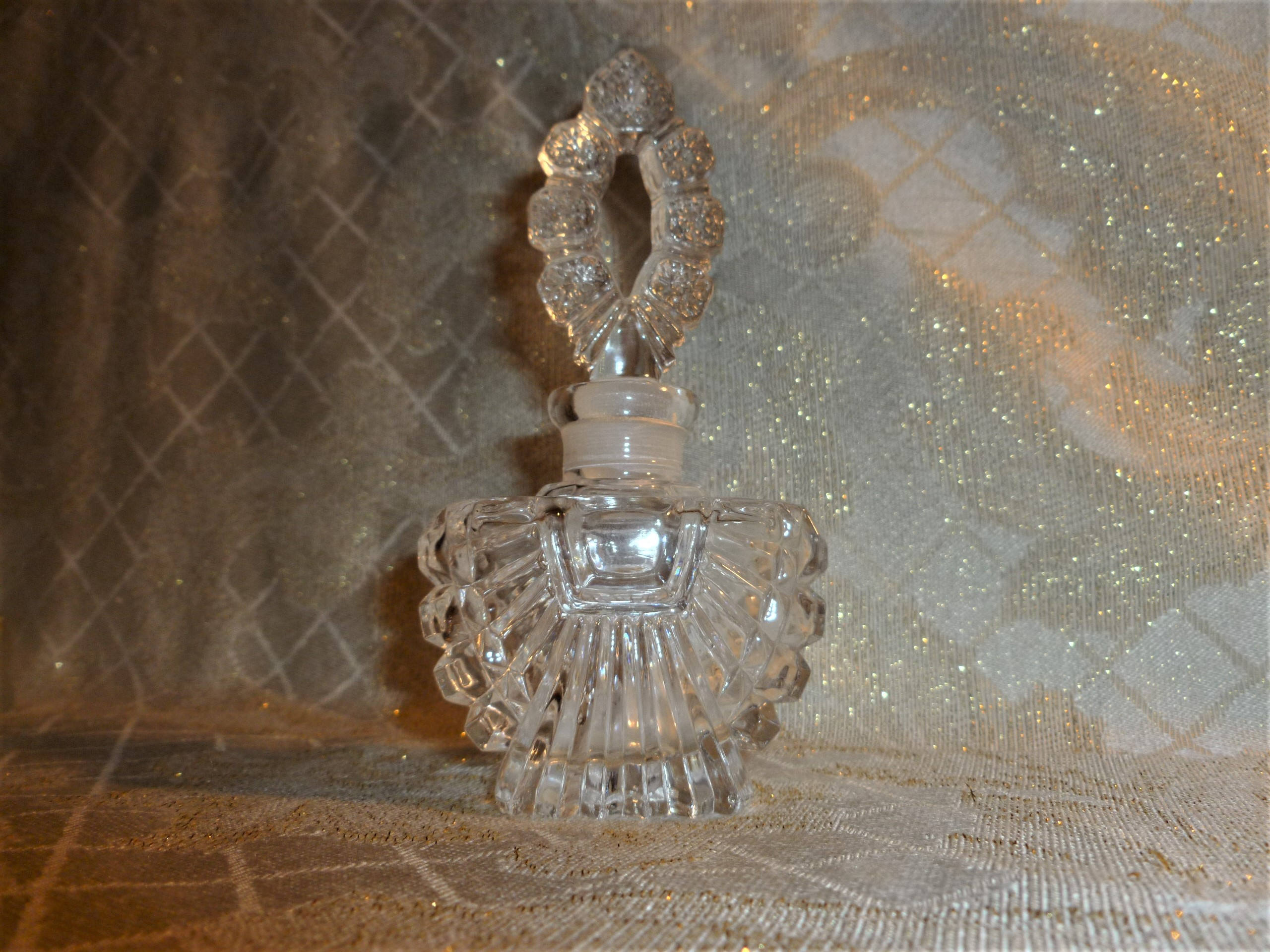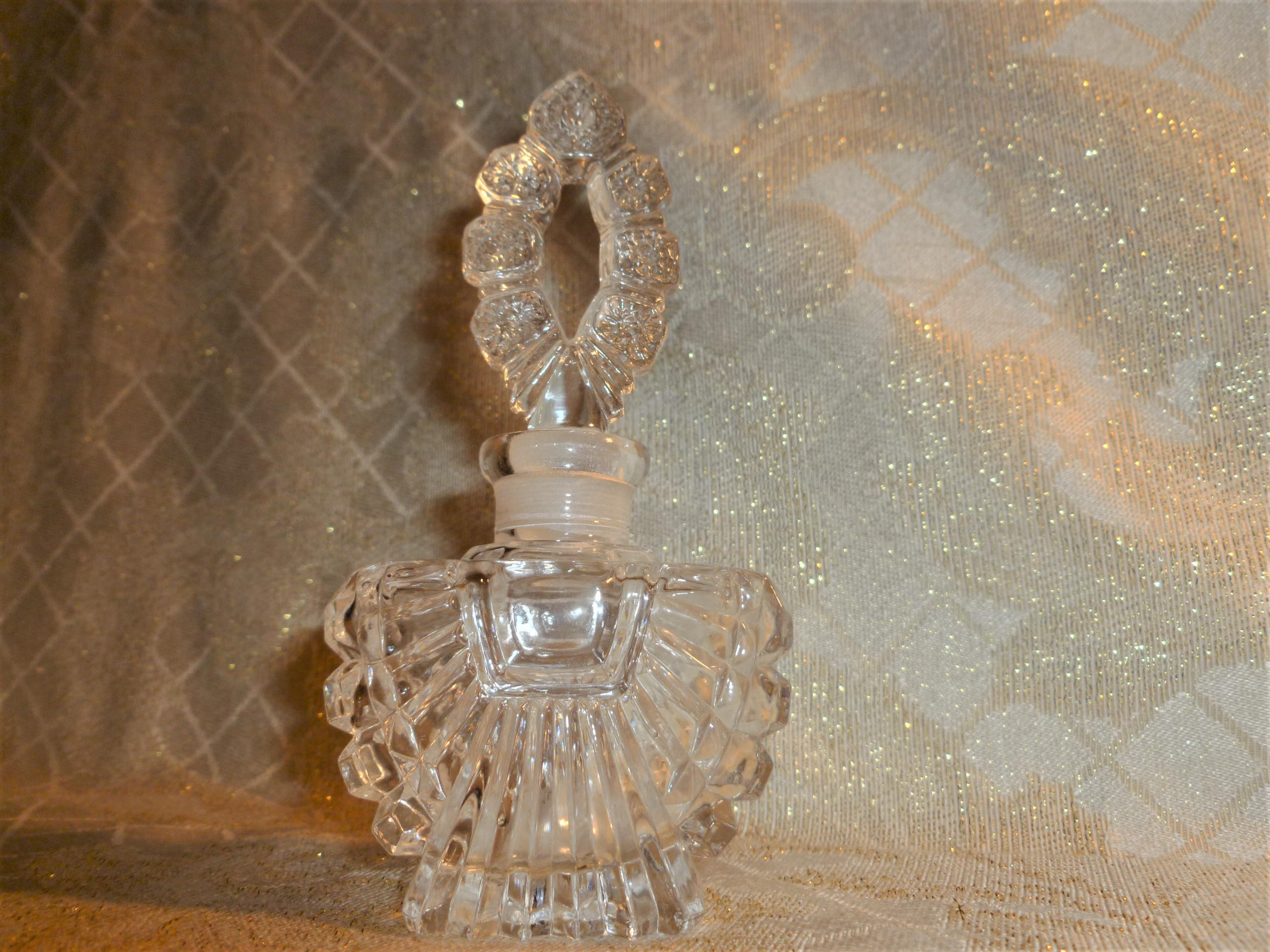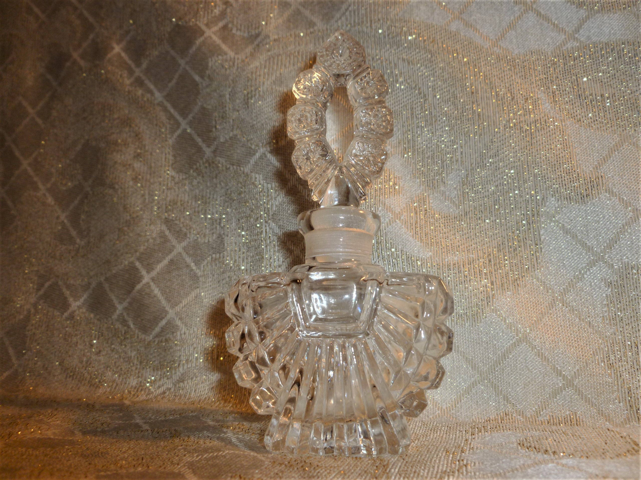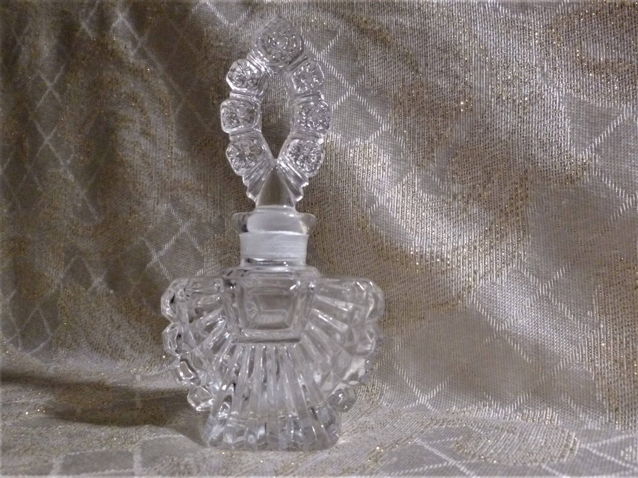 Listed for you here is a exquisite vintage perfume bottle with a tall floral stopper. Very pretty detailed design. Exceptional for dresser or vanity display. Excellent condition only tiny bit of wear to end of stopper, as shown in pictures. Fine design and detail in this vintage collectible. Measurements are 5 1/2"tall 2 1/2"long