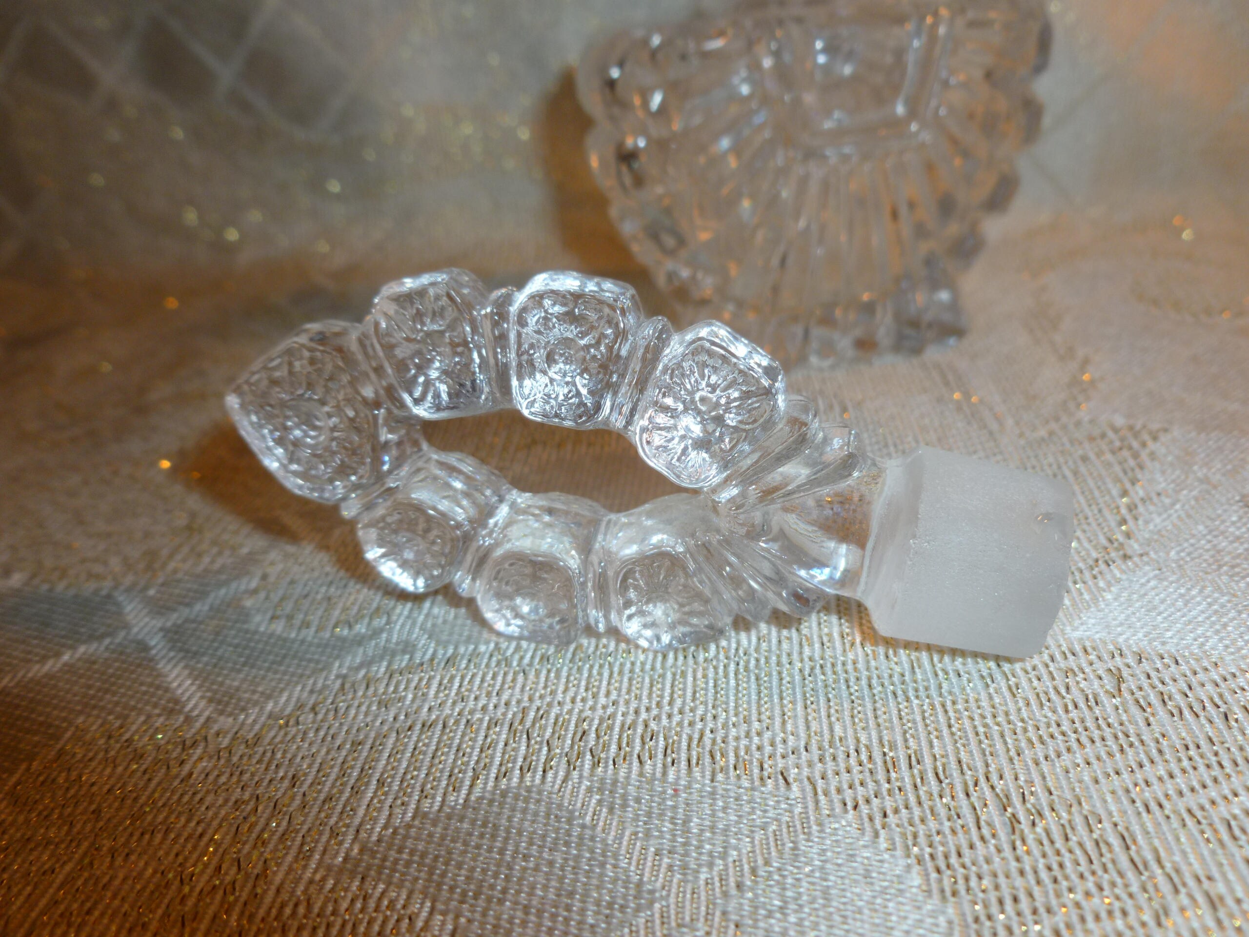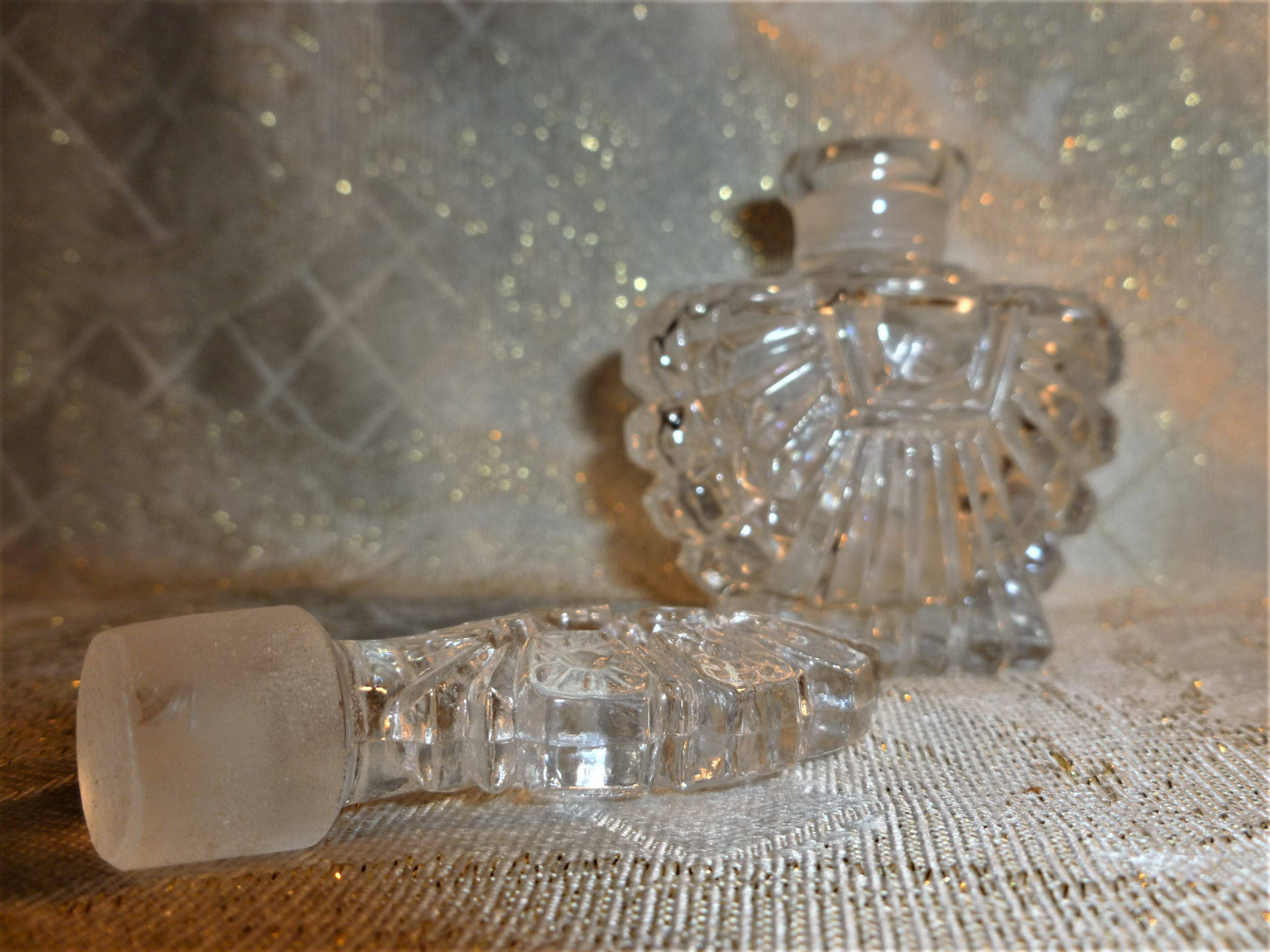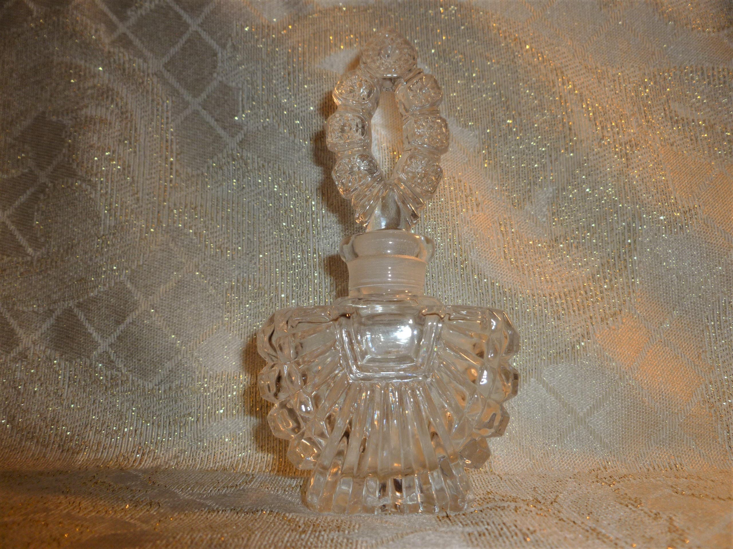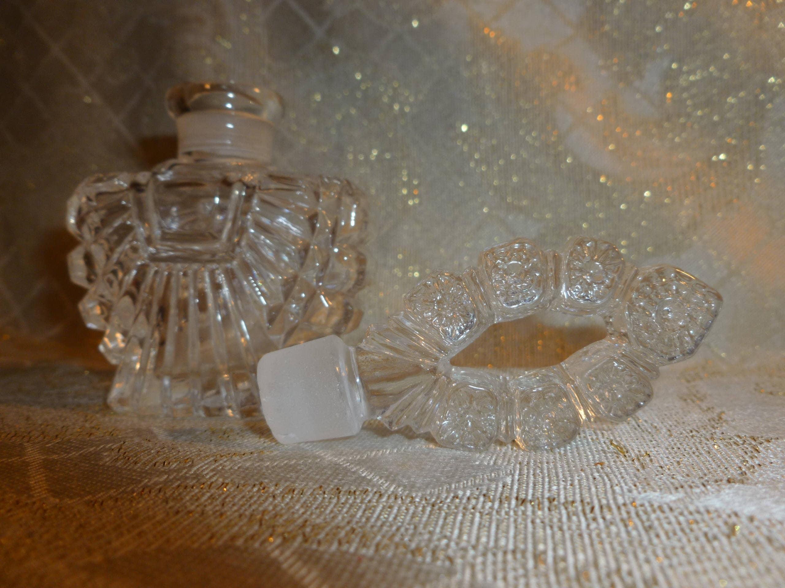 Listed for you here is a exquisite vintage perfume bottle with a tall floral stopper. Very pretty detailed design. Exceptional for dresser or vanity display. Excellent condition only tiny bit of wear to end of stopper, as shown in pictures. Fine design and detail in this vintage collectible. Measurements are 5 1/2"tall 2 1/2"long
