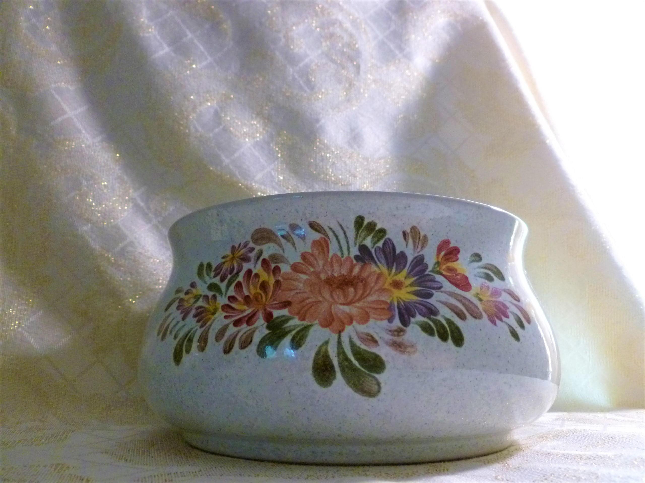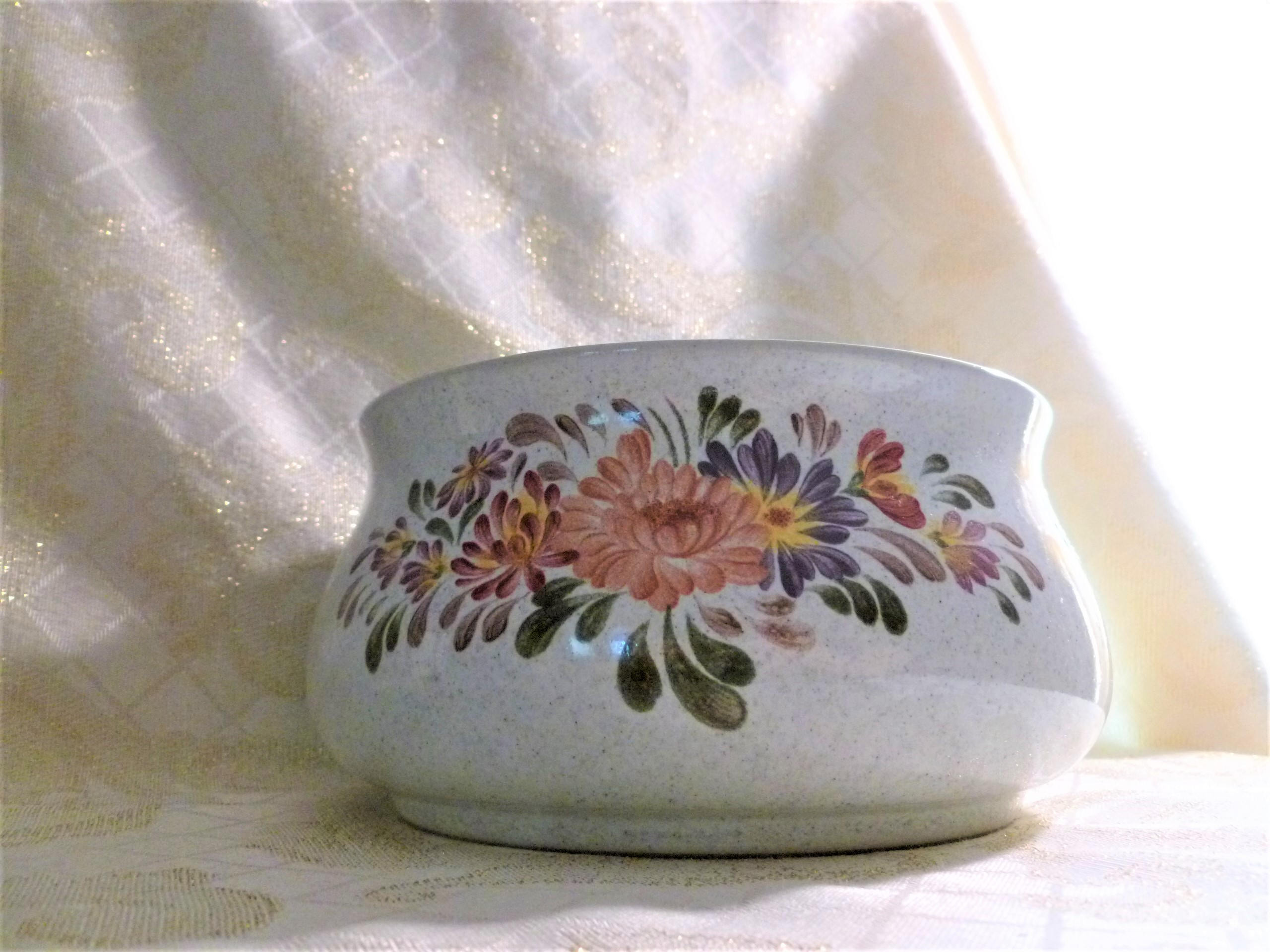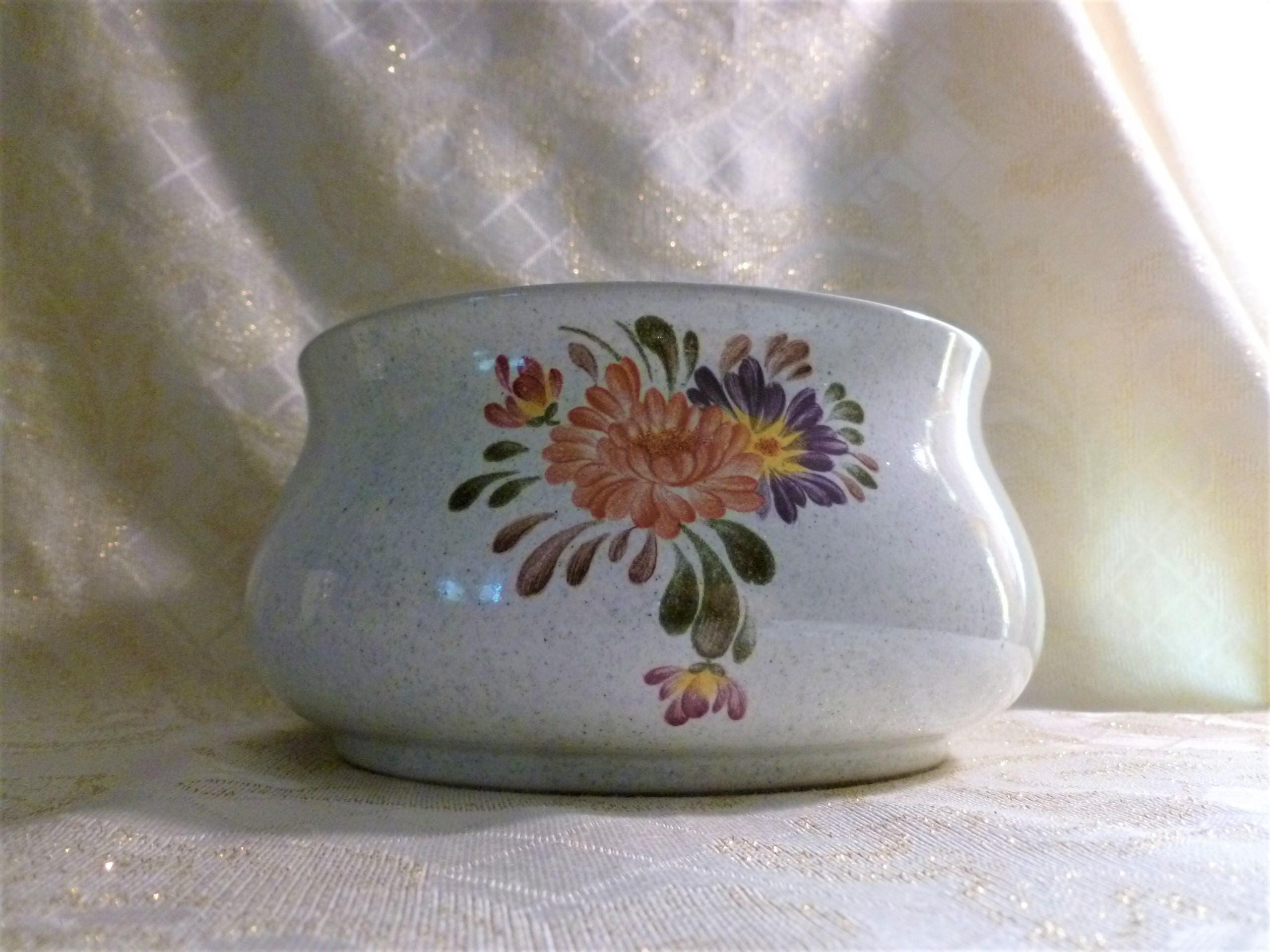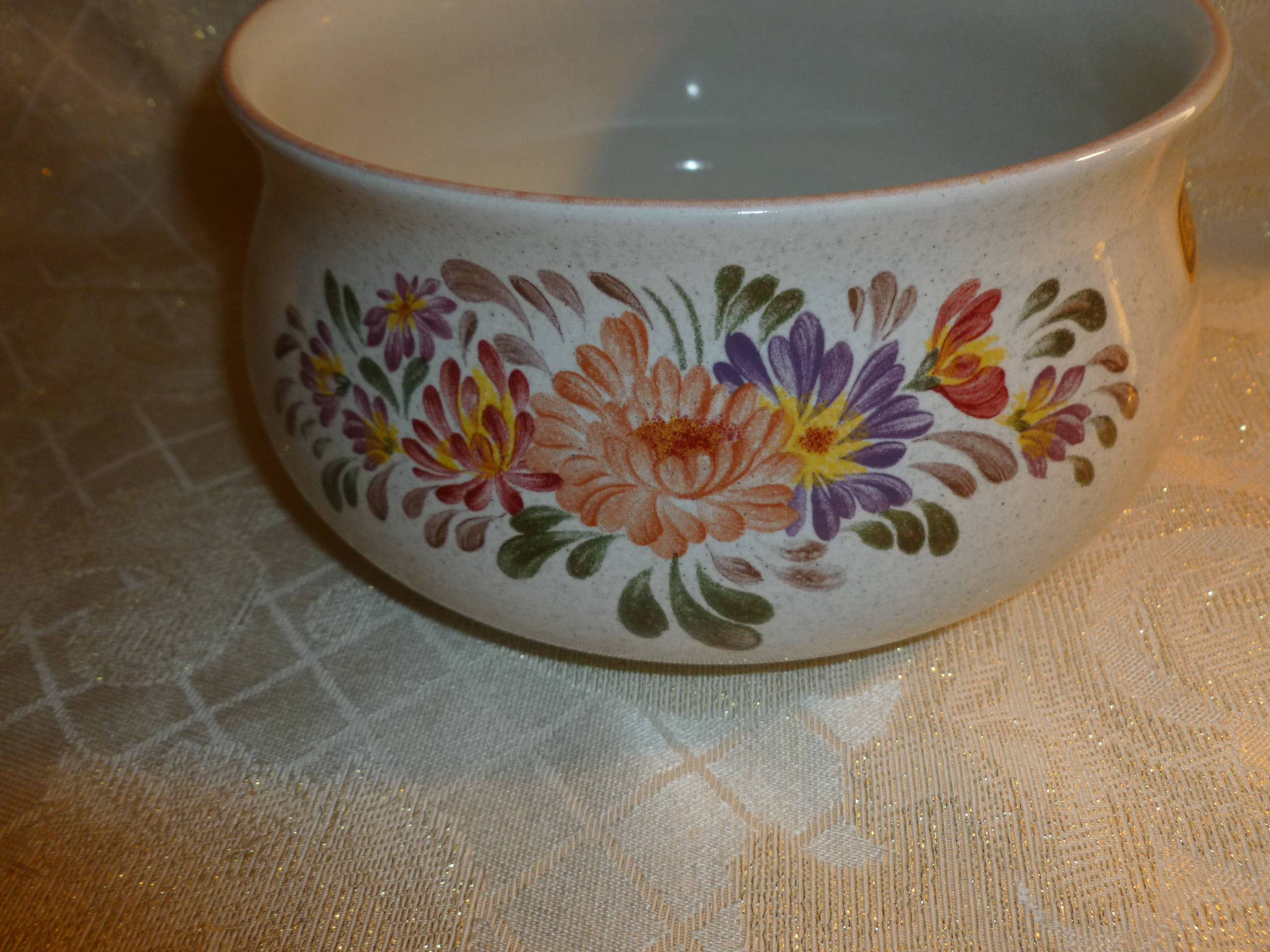 Listed for you here is a beautiful stoneware bowl handcrafted by Denby, made in England. Fine Denby quality. White sand glaze and perfect colorful design of floral pattern entitled Summer Fields. Compliments most settings. Elegant floral designs with a slight difference on front and back. Excellent unused condition no signs of wear and original sticker. Measurements are 3 3/4"tall 7"wide. Pretty display.
