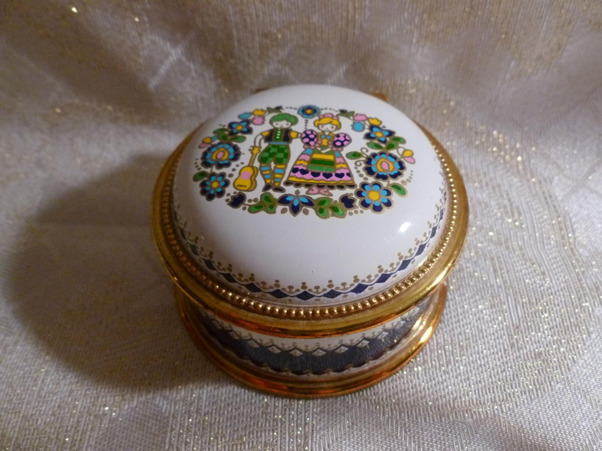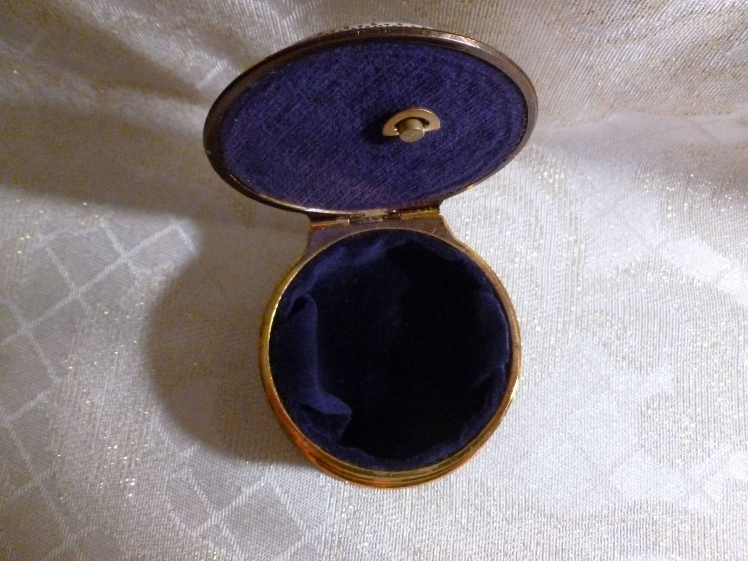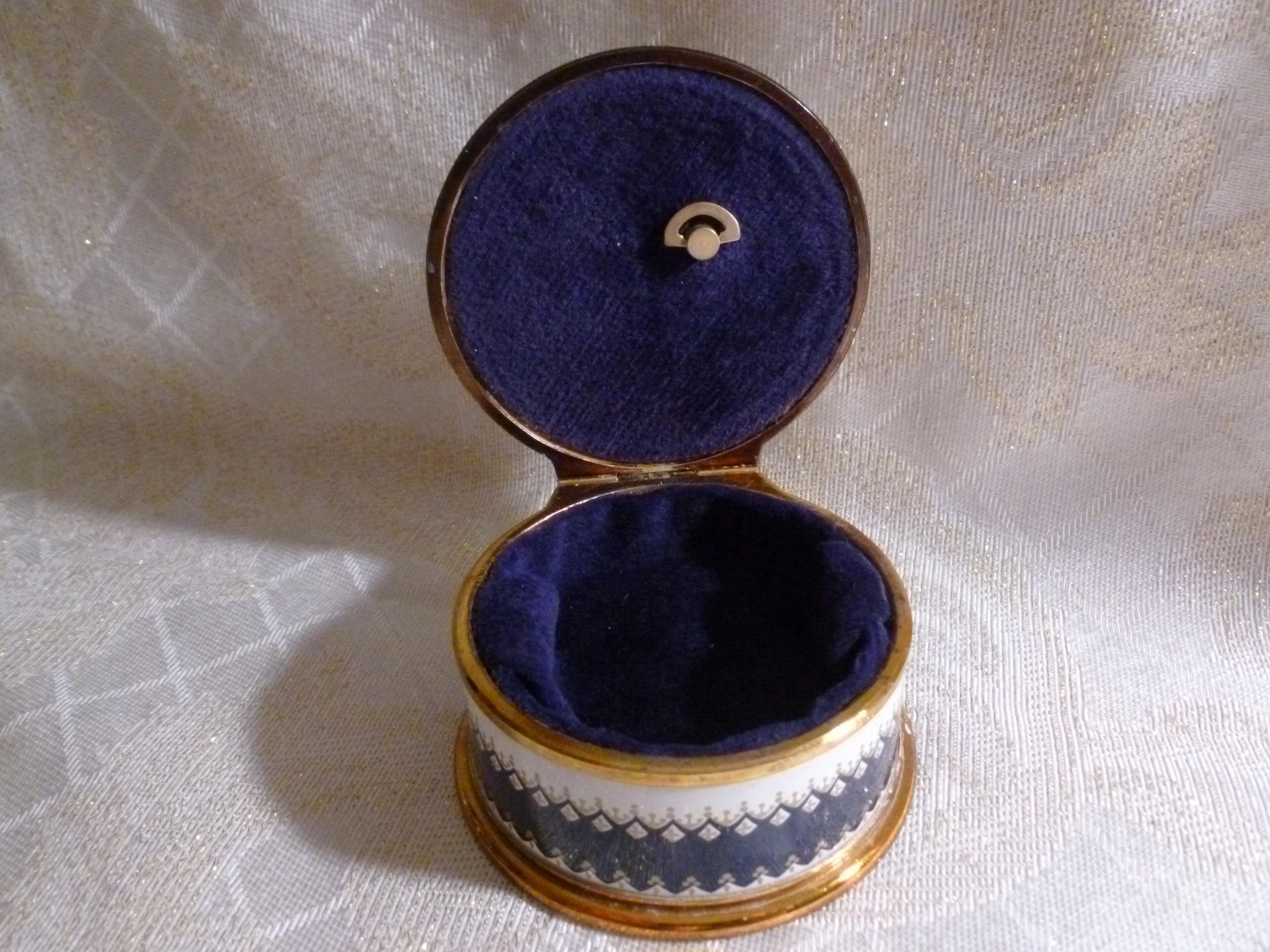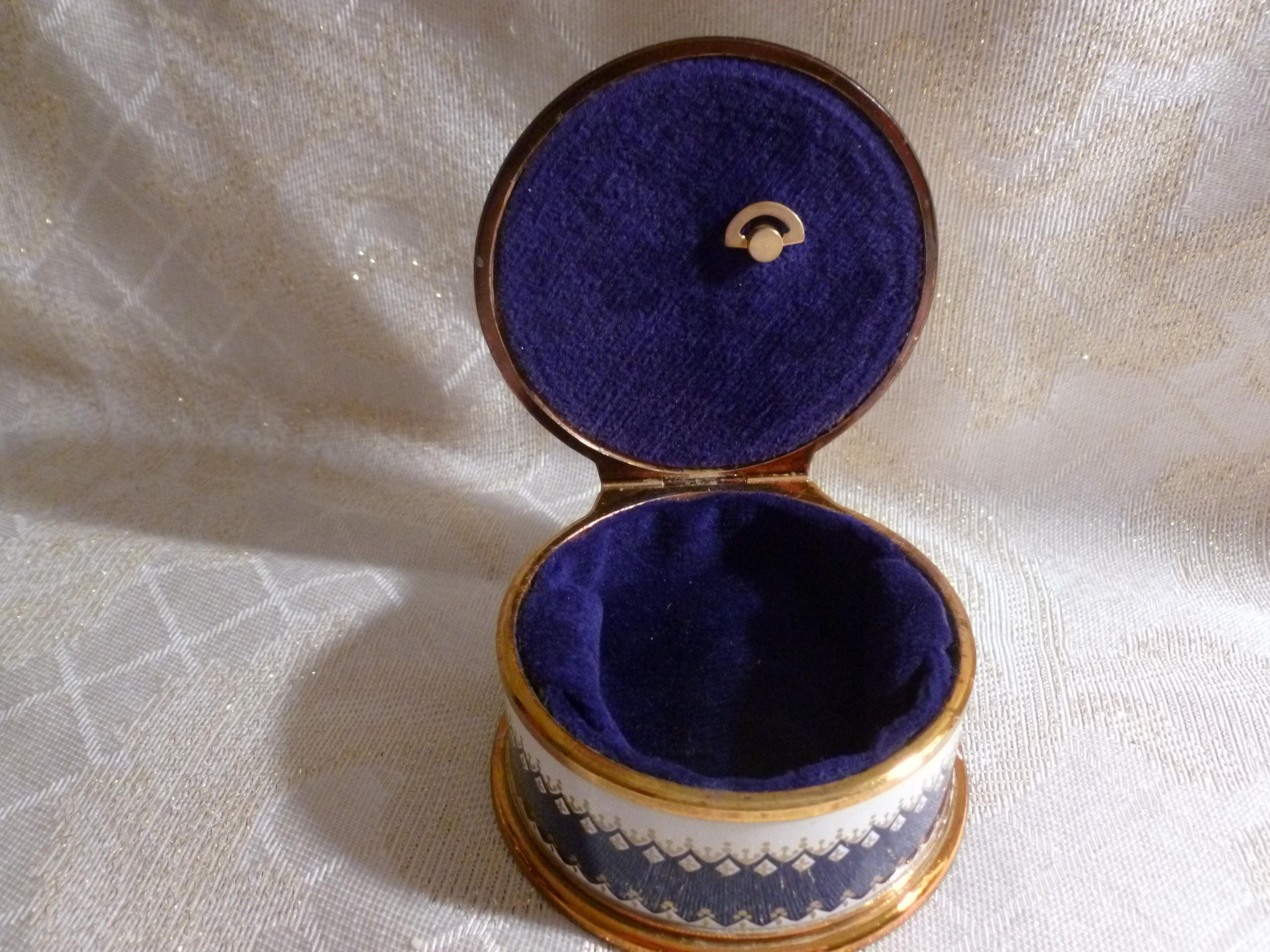 Listed for you here is an adorable ring presentation box that is musical and lined with blue velvet. Very cute for gift with jewelry, makes an ideal presentation. Measurements are 3"wide 1 3/4"tall. Vintage collectible keepsake.