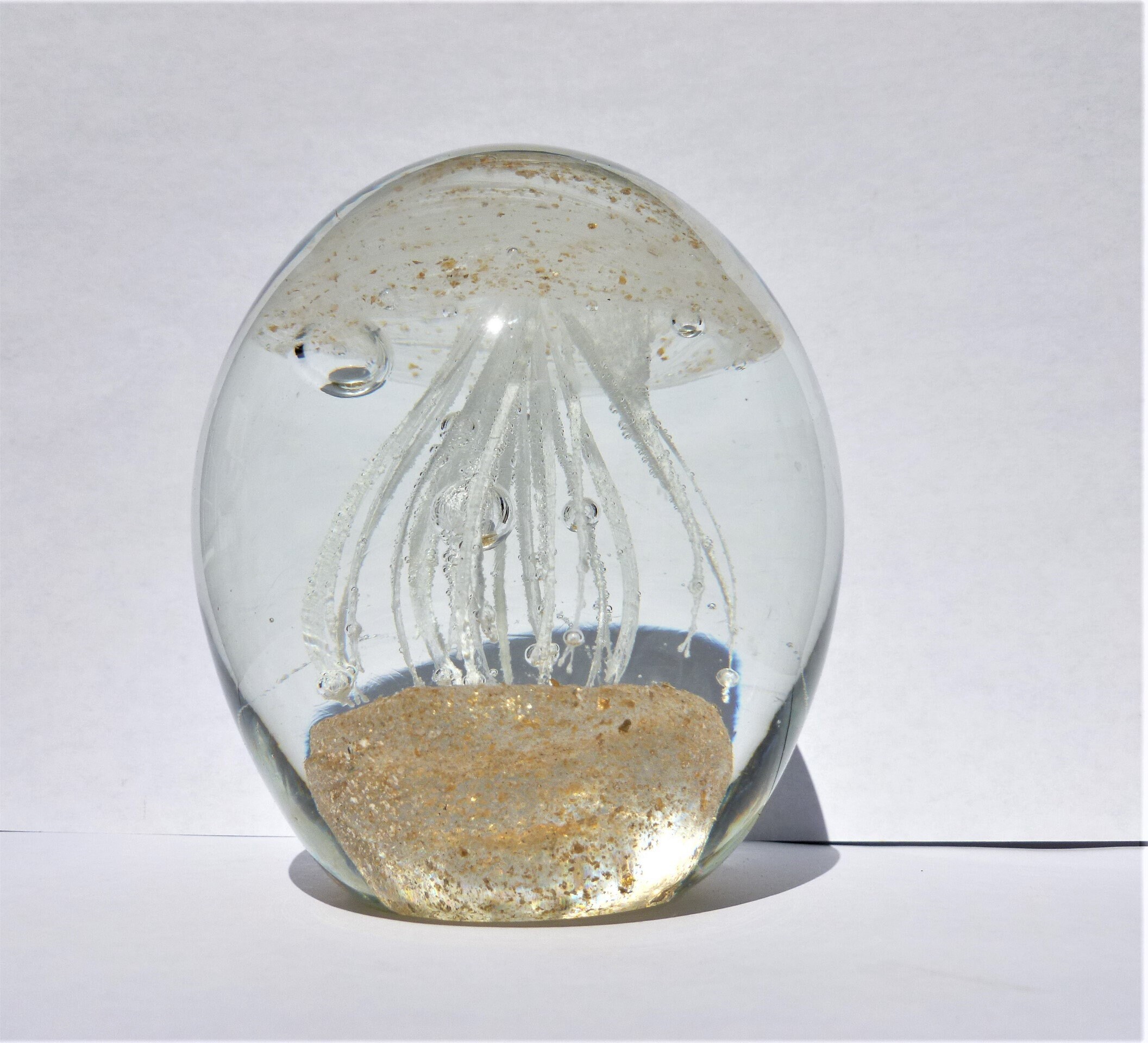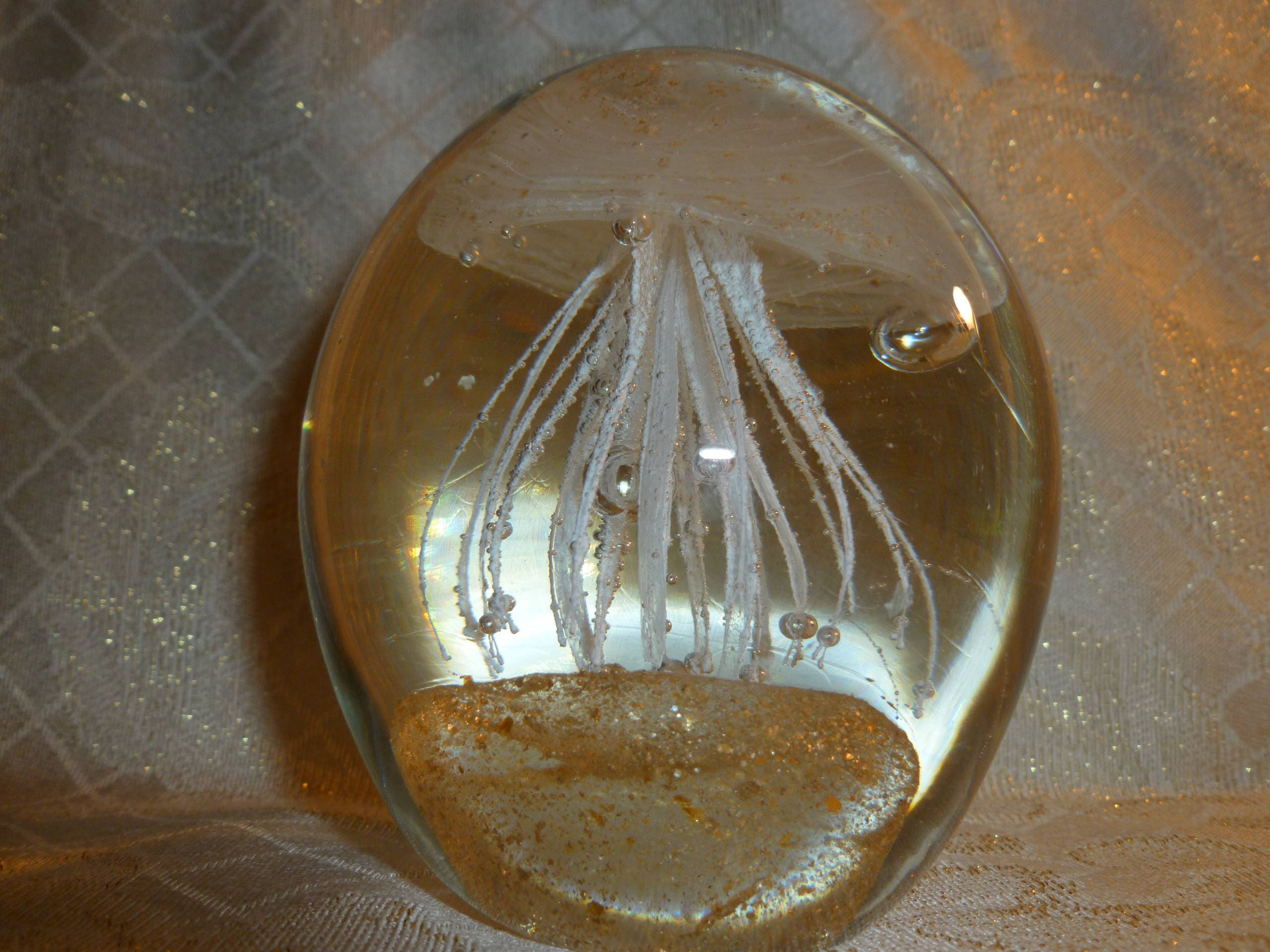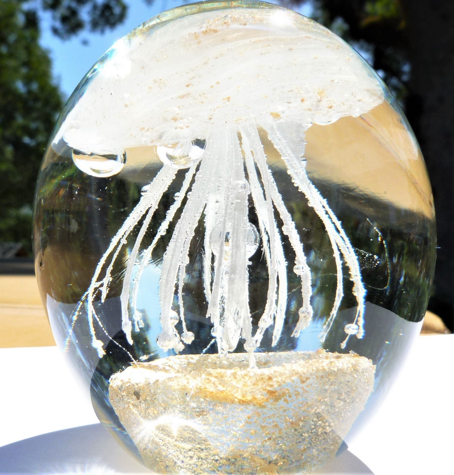 Listed for you here is an exceptional life like display of a handmade jellyfish under glass, with a sprinkle of golden sand. This handmade paperweight is an excellent conversation piece. Elegant with lighting, showing the jellyfish and golden sand. Ideal office shelf display or home library. Interesting detailed design. Measurements are