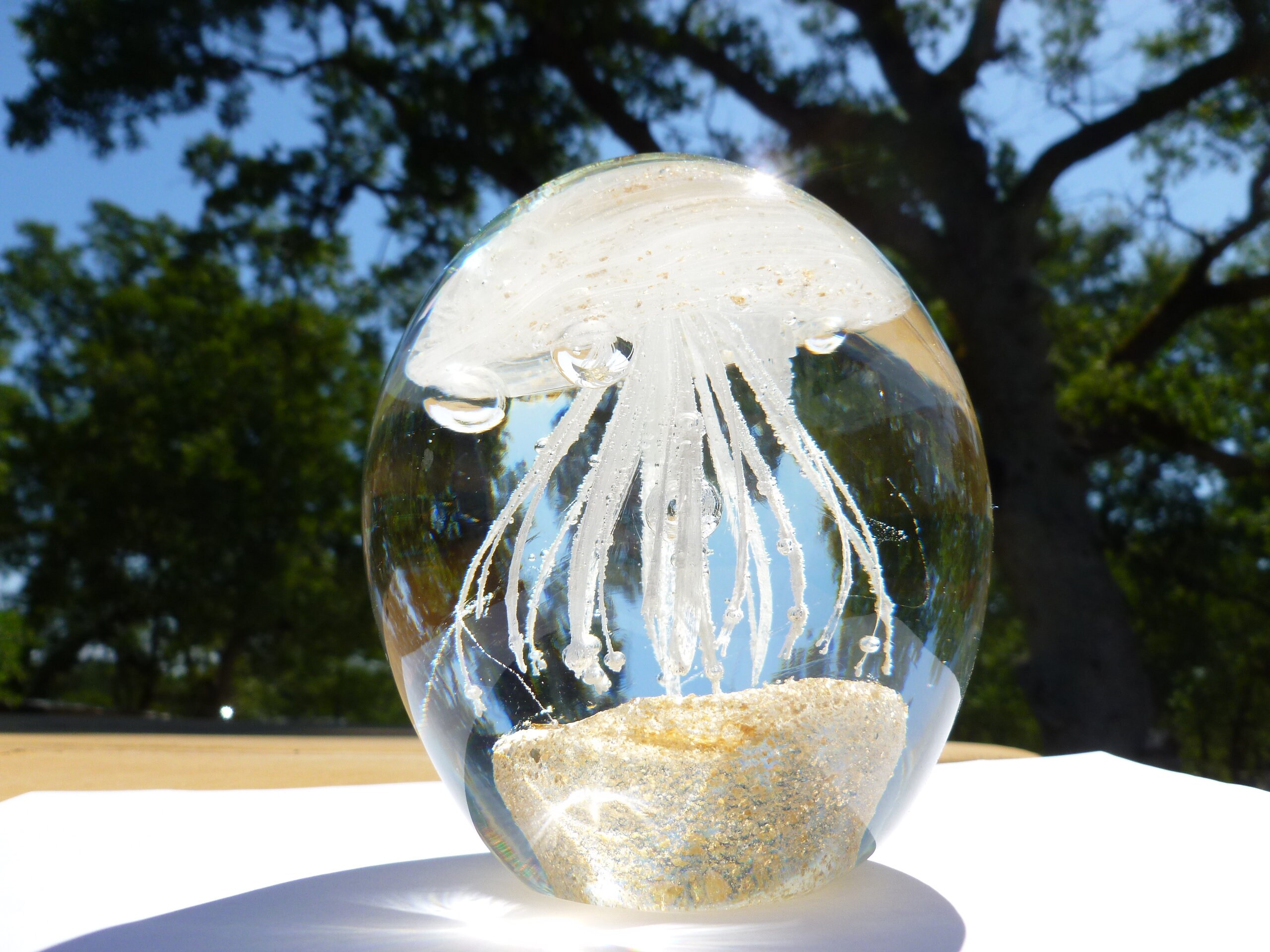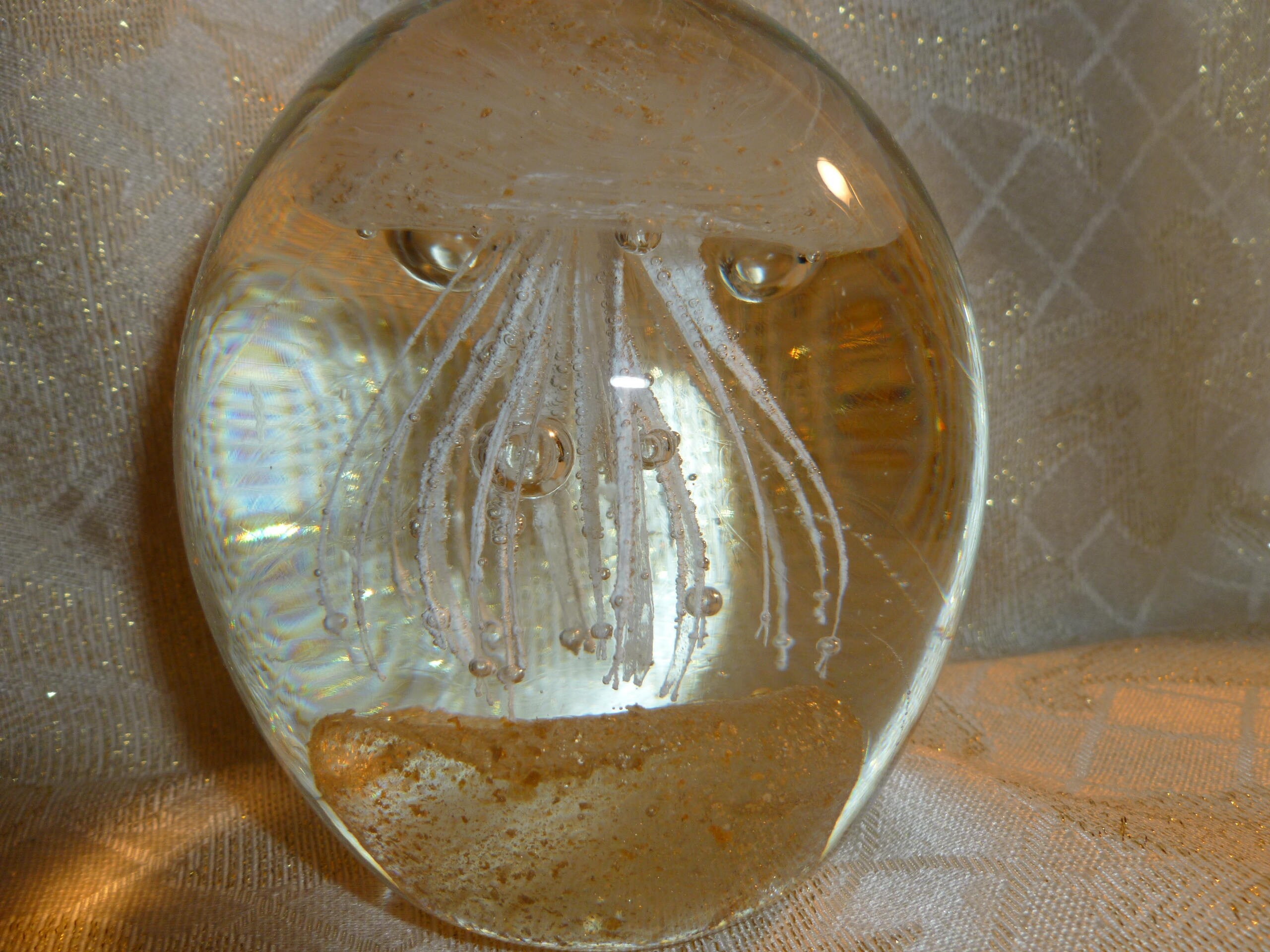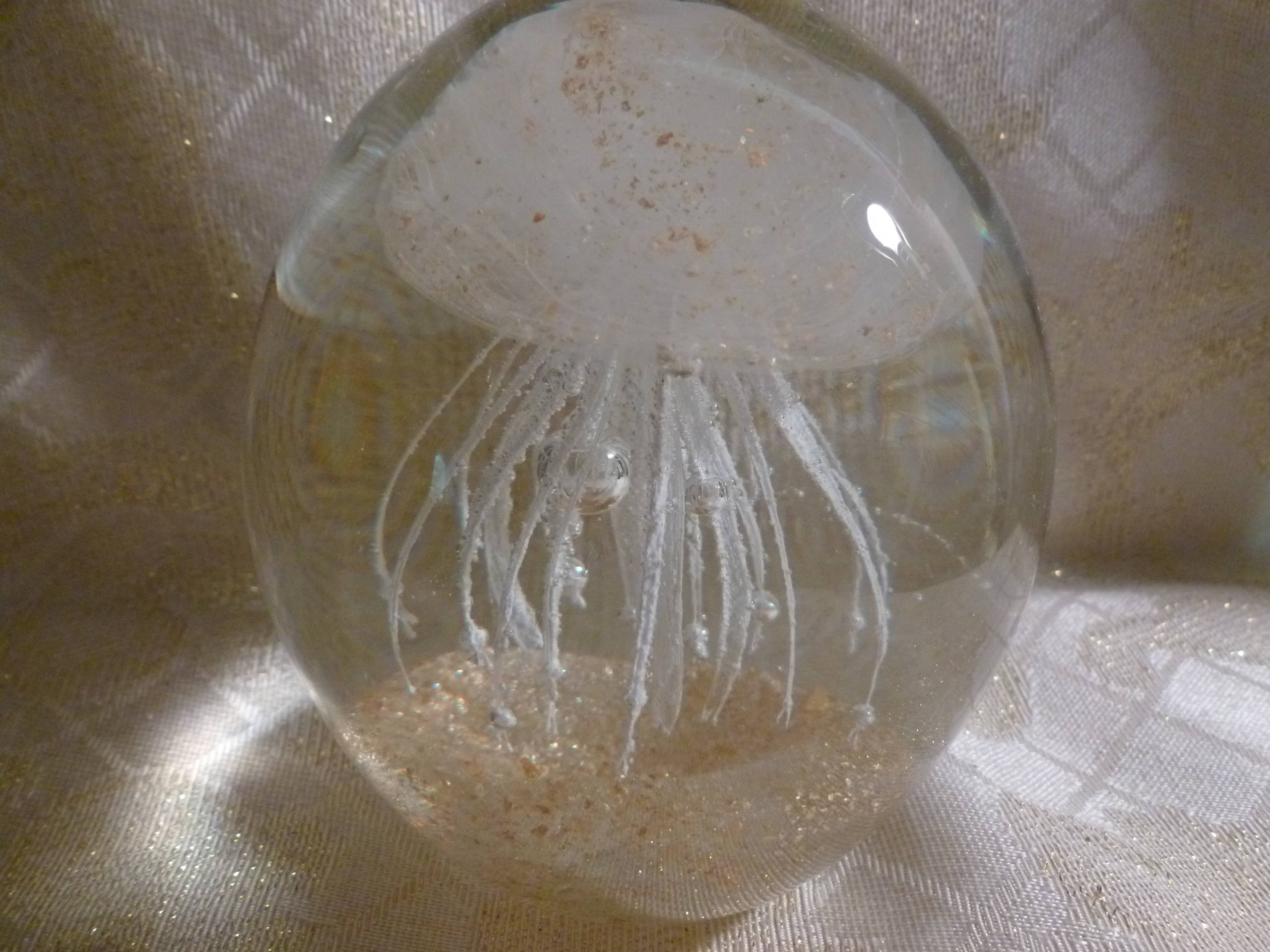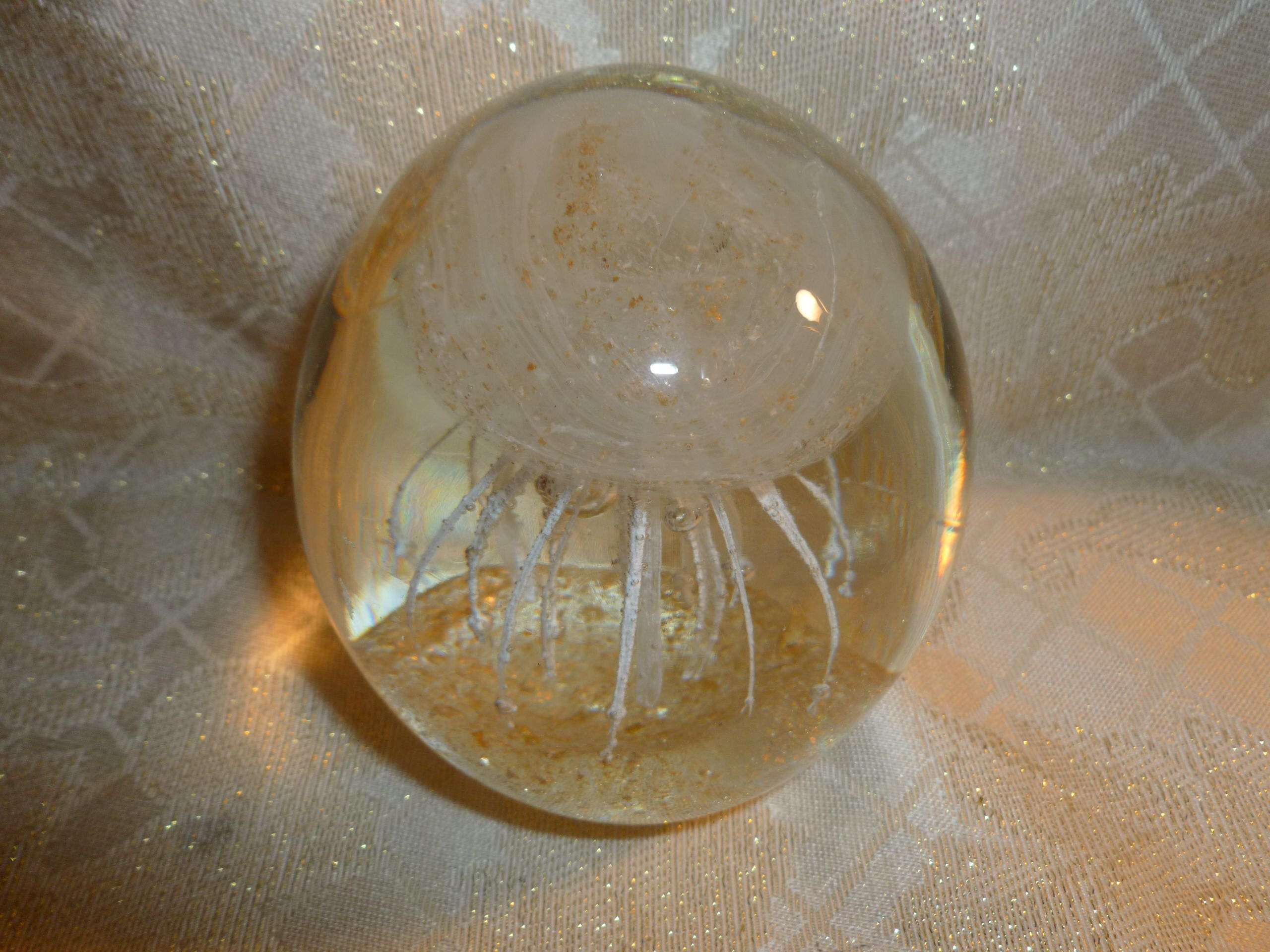 Listed for you here is an exceptional life like display of a handmade jellyfish under glass, with a sprinkle of golden sand. This handmade paperweight is an excellent conversation piece. Elegant with lighting, showing the jellyfish and golden sand. Ideal office shelf display or home library. Interesting detailed design. Measurements are