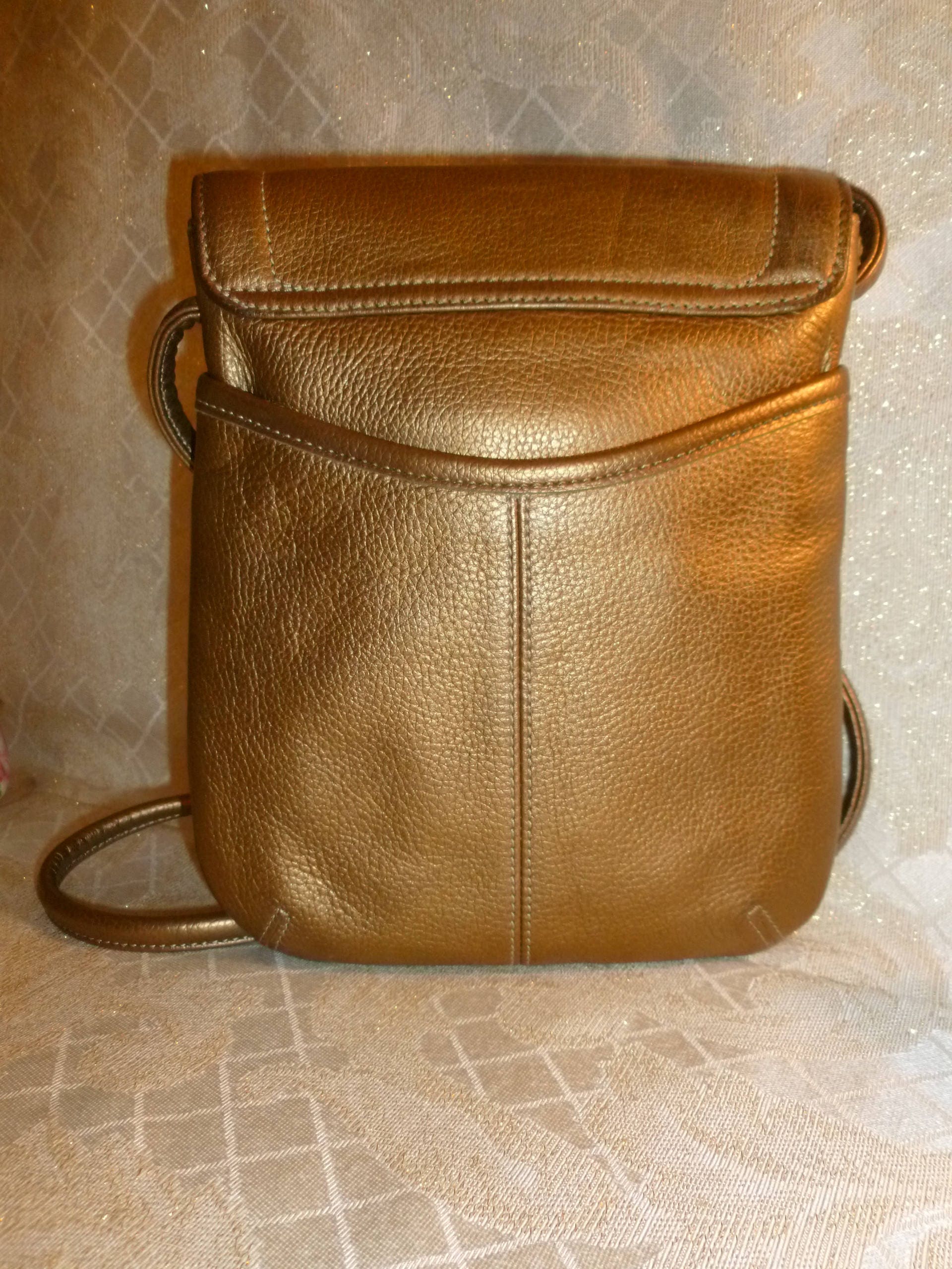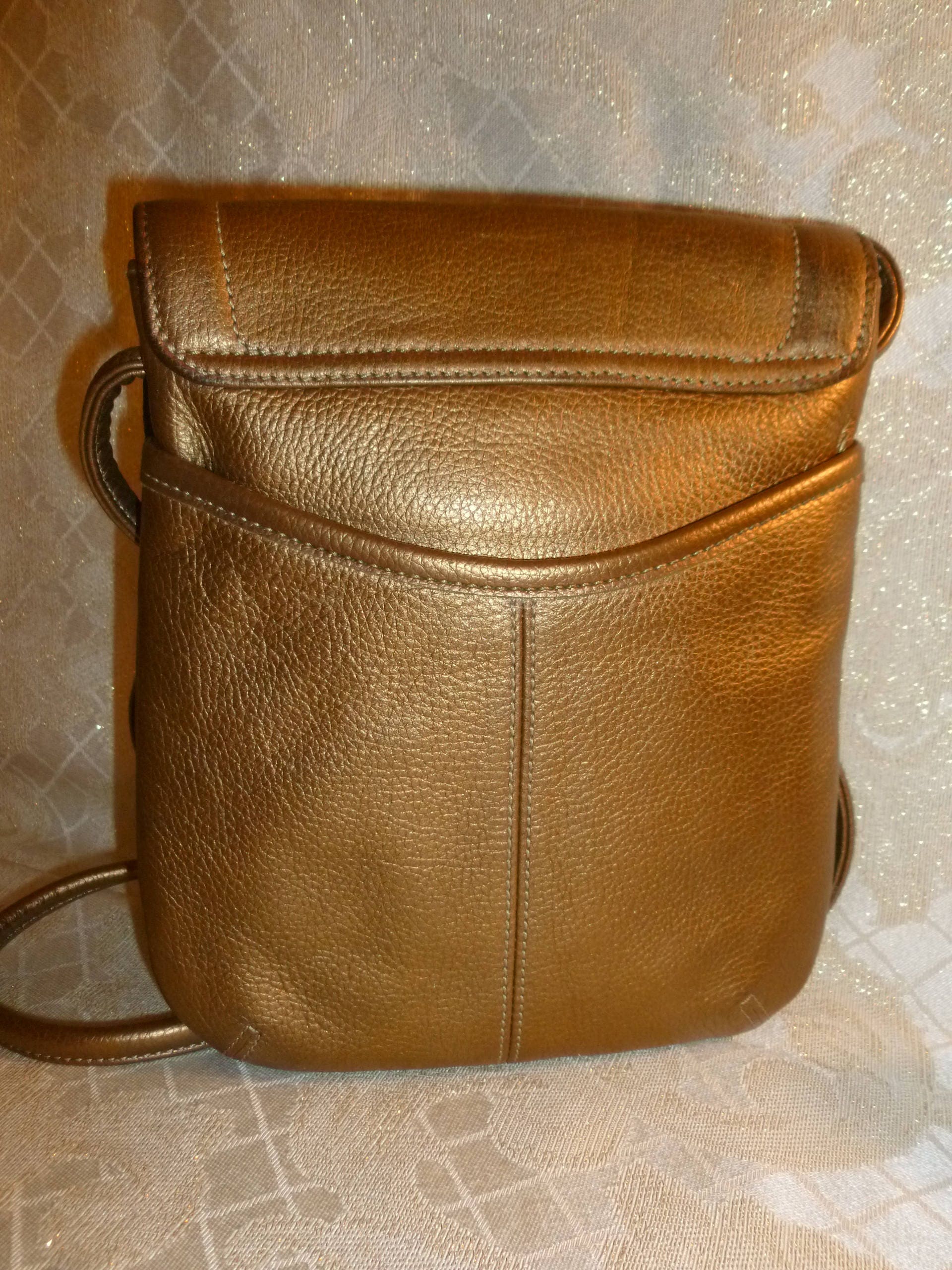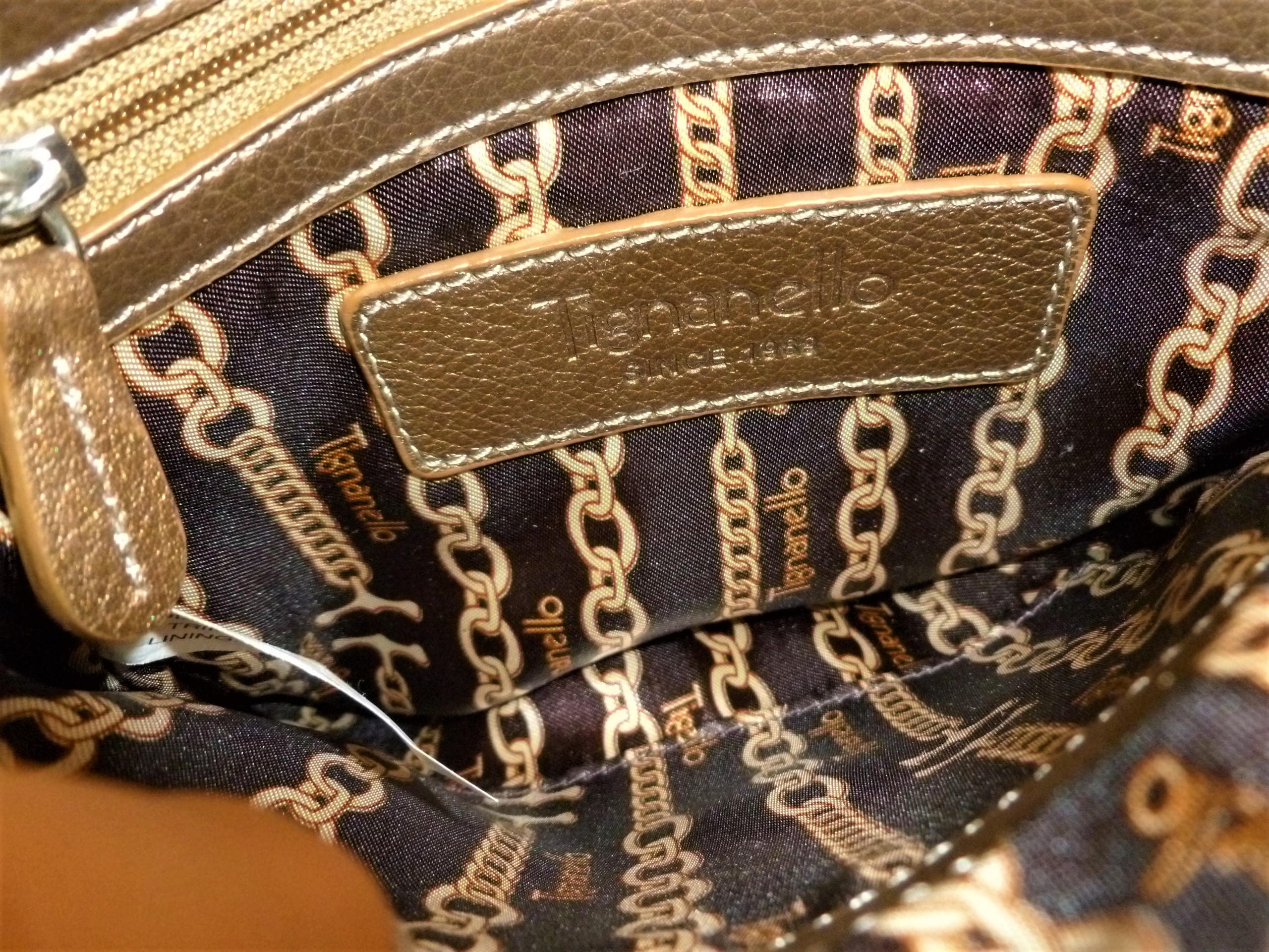Listed for you here is an exceptional quality handbag by Tignanello. Beautiful honey golden leather with a very pretty classic style fabric with the Tignanello name. Exquisite design with no spare to detail. Perfect for day use or an evening accessory. There is slight wear at the end on one side of the strap, there are two pictures showing it, please look carefully before purchase, it is hardly noticeable, just want you to know of it. This strap will still provide excellent use. Measurements are 9 1/2"tall 8"wide with a 23"drop strap.