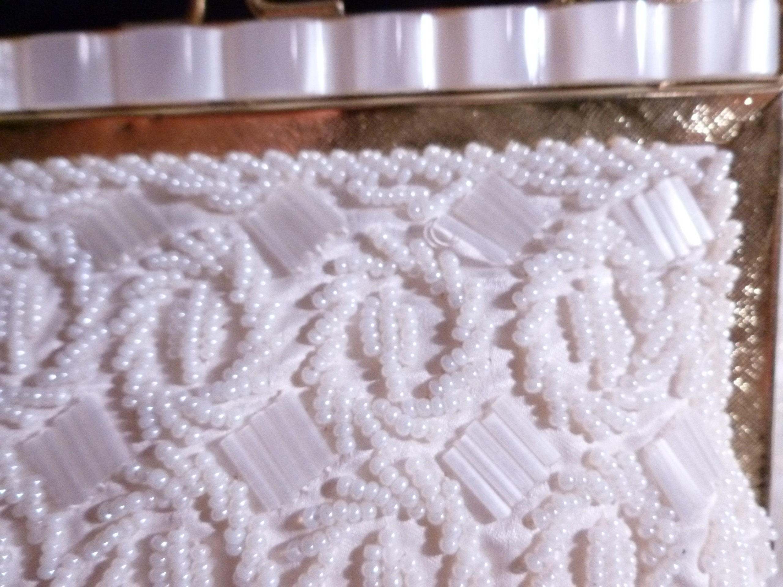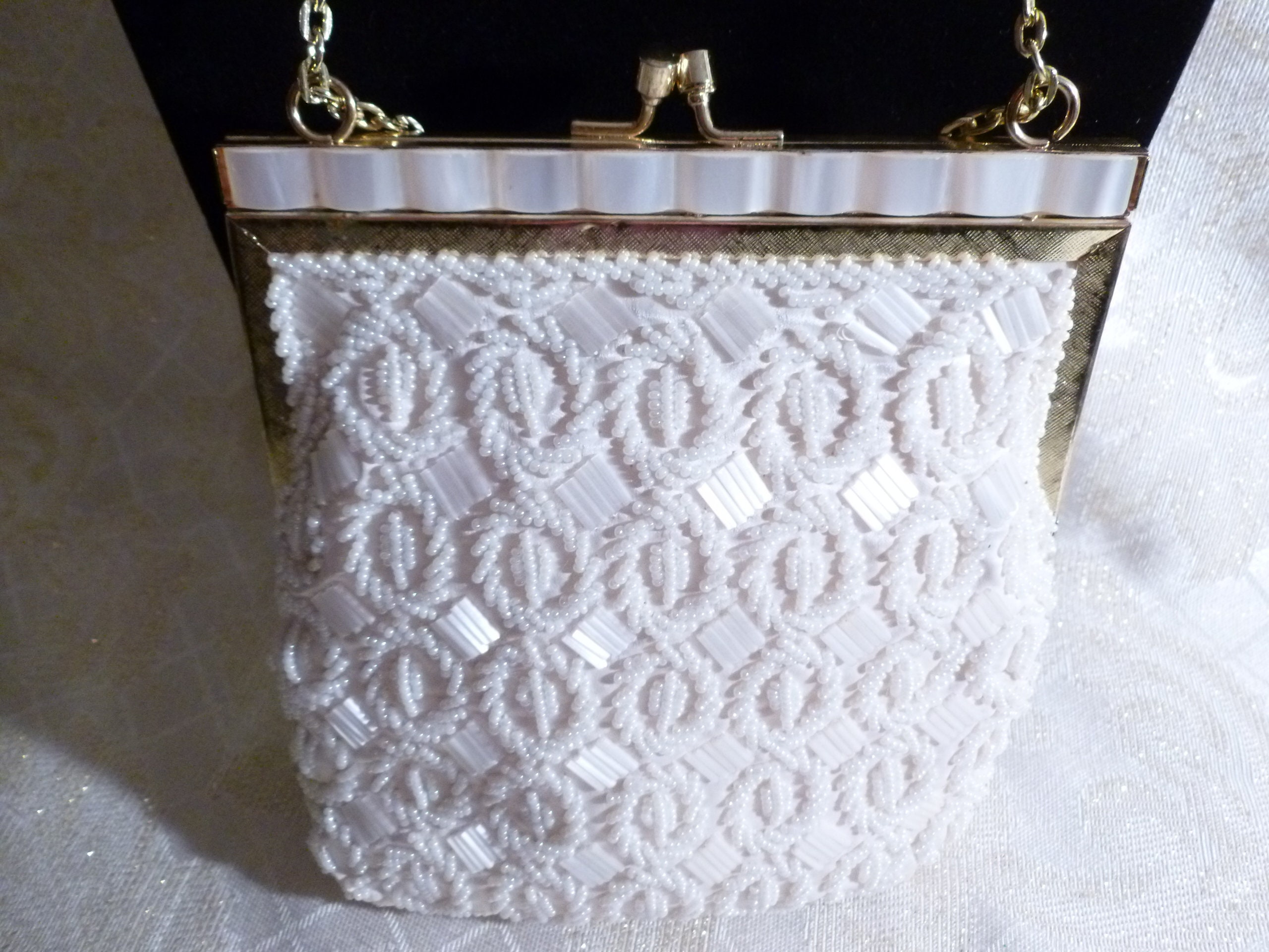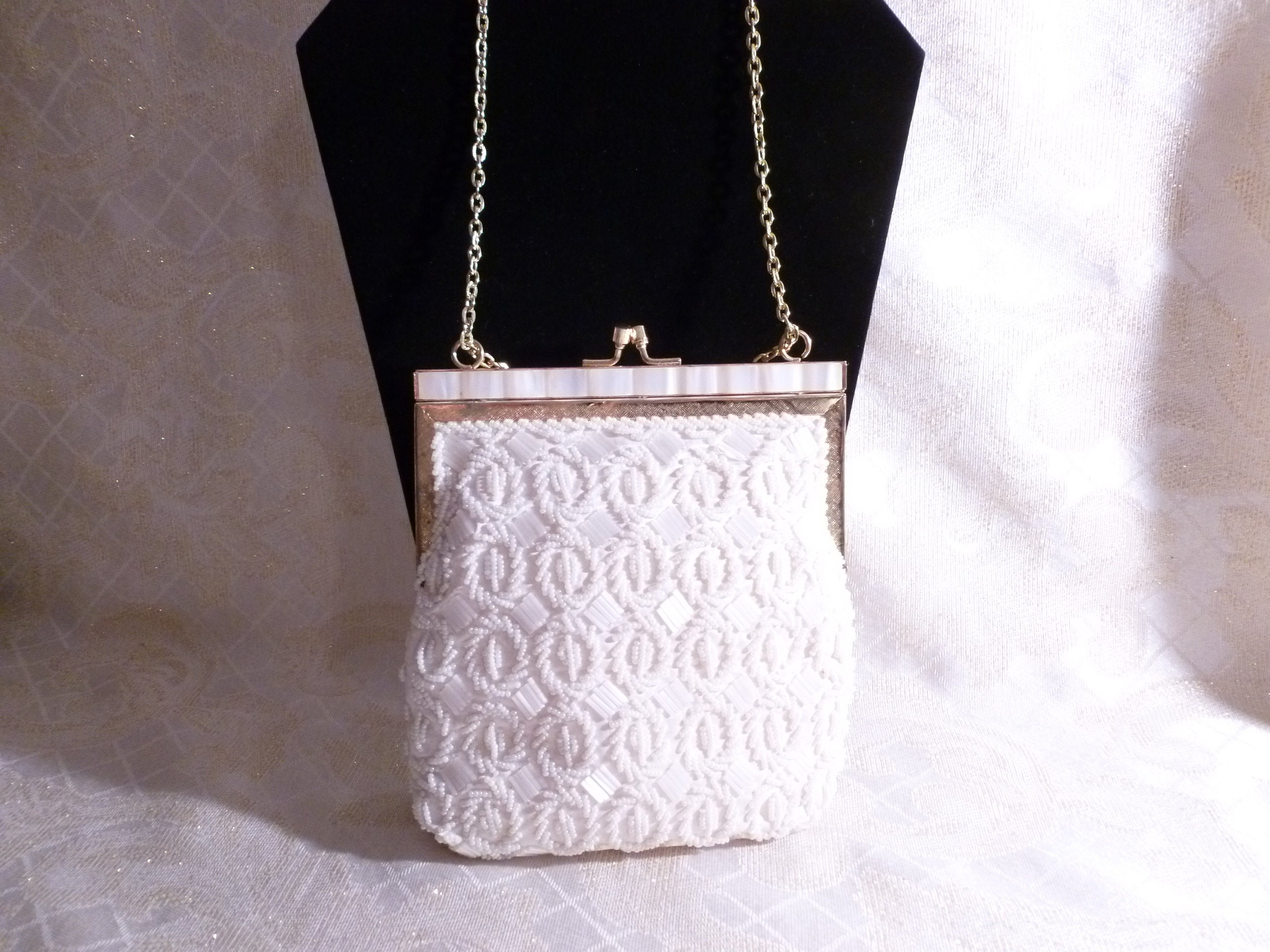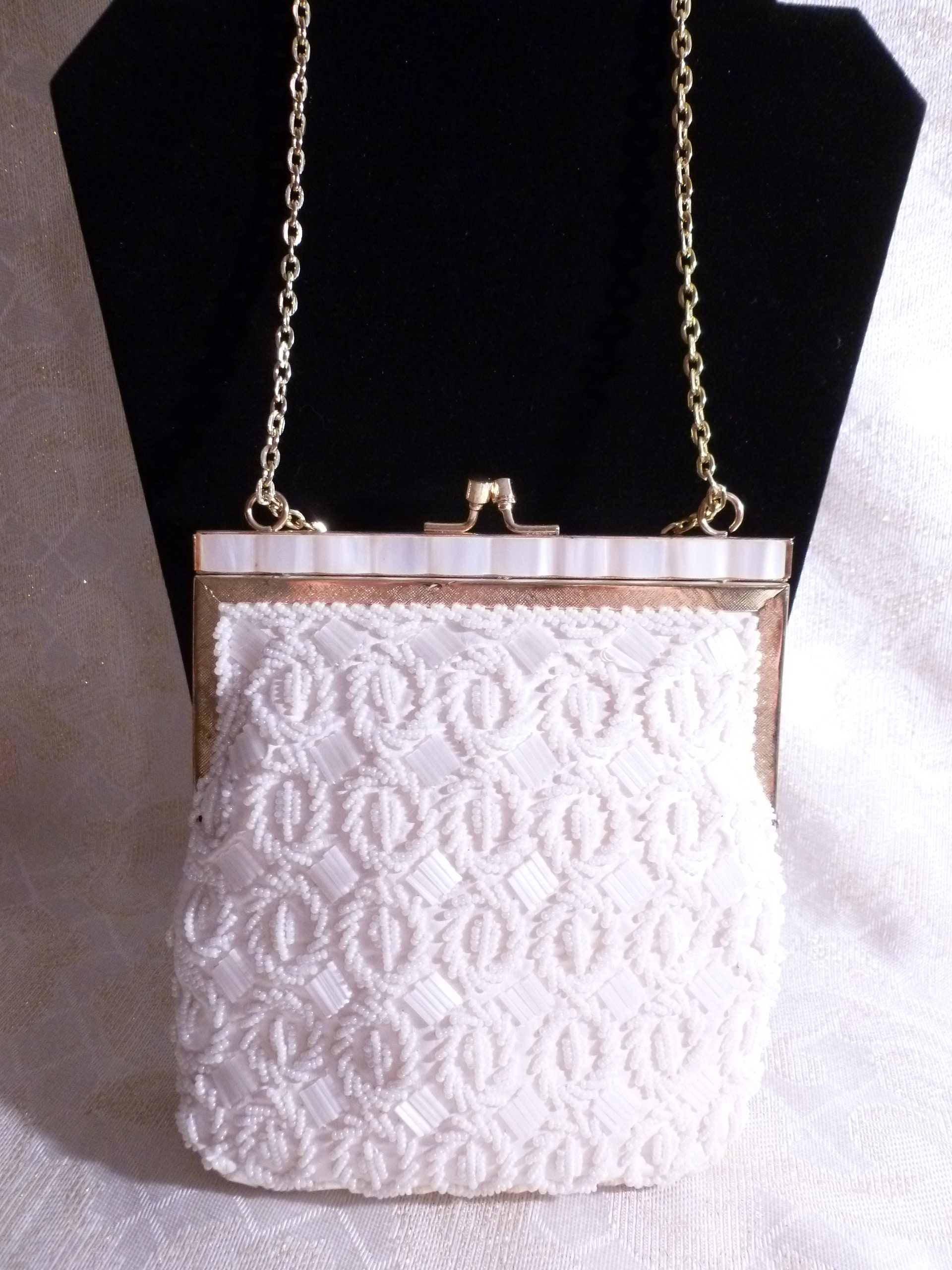 Listed for you here is an exceptional vintage white beaded handbag. Made with vintage white seed beads, bugal beads, scalloped edge at top, gold tone metal closure and chain handle. Ivory satin lining. Very elegant with an exquisite detailed design. Perfect for a Wedding Or Special Occasion. Excellent condition. Original tag inside. Measurements are 6"long 7"tall with a 12"drop chain handle. Sweet, sophisticated, and very elegant.