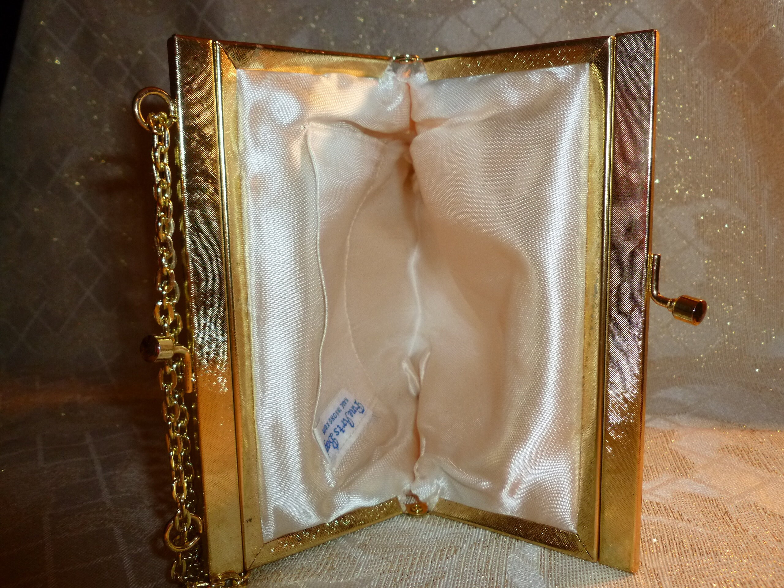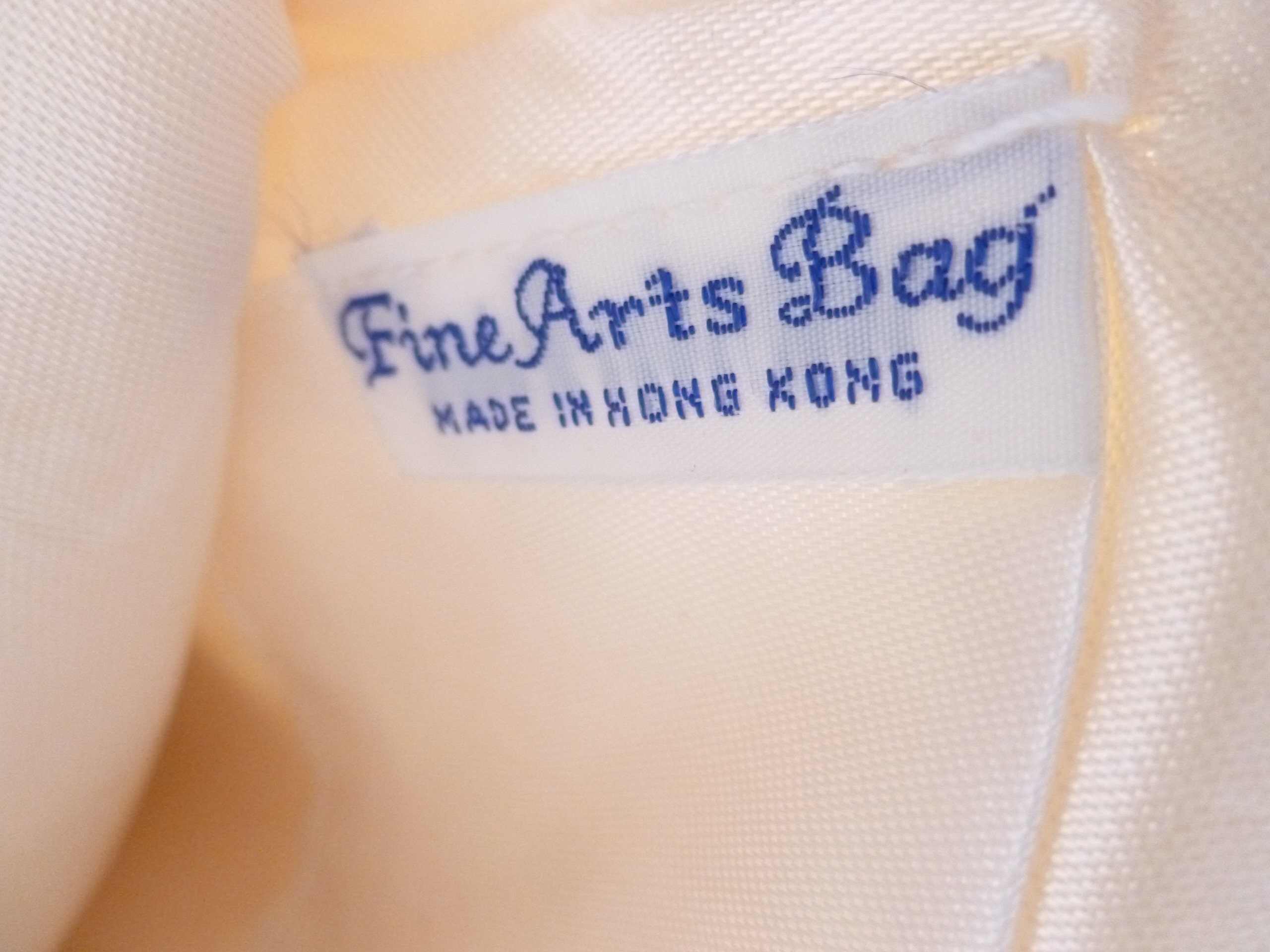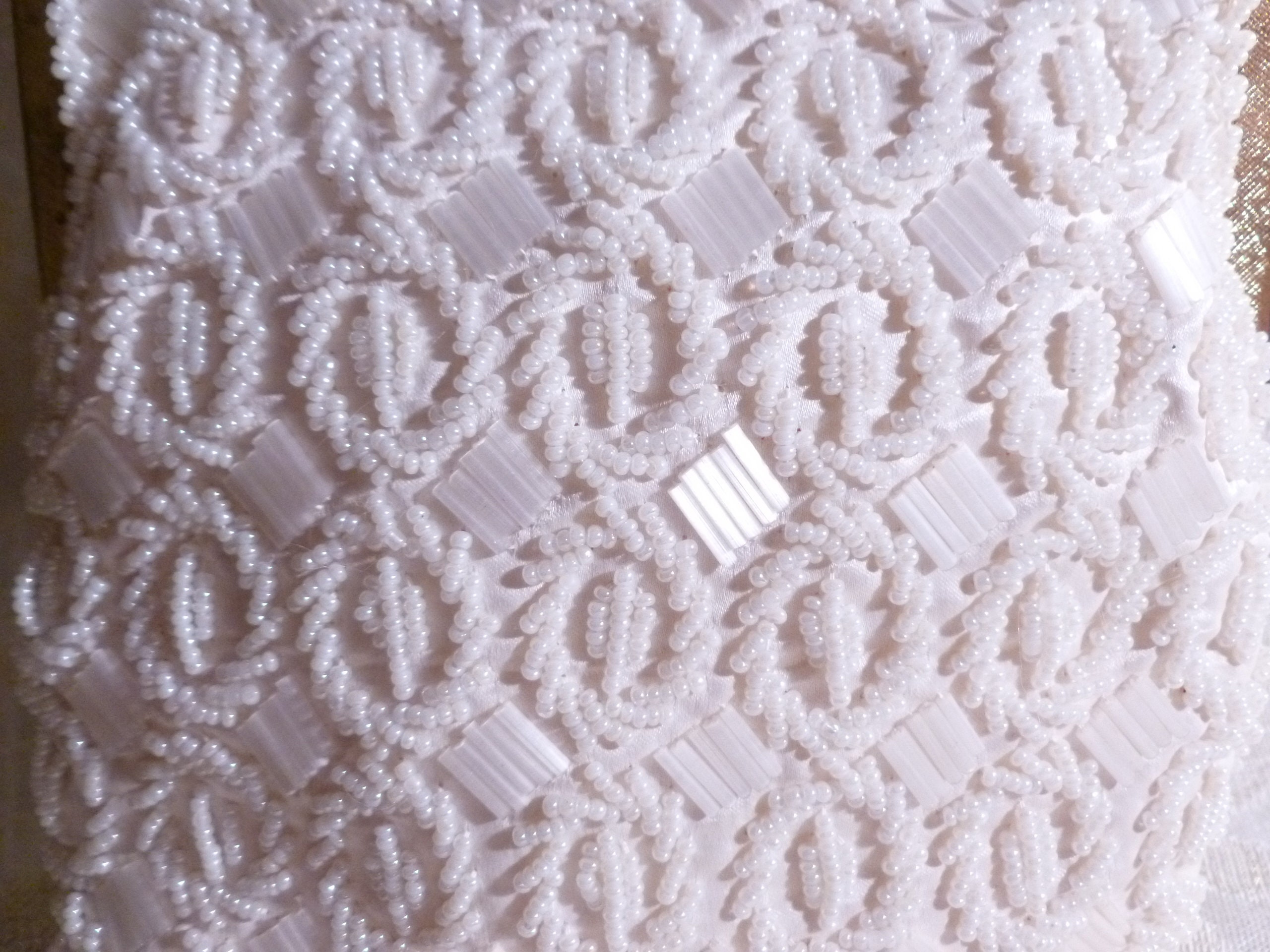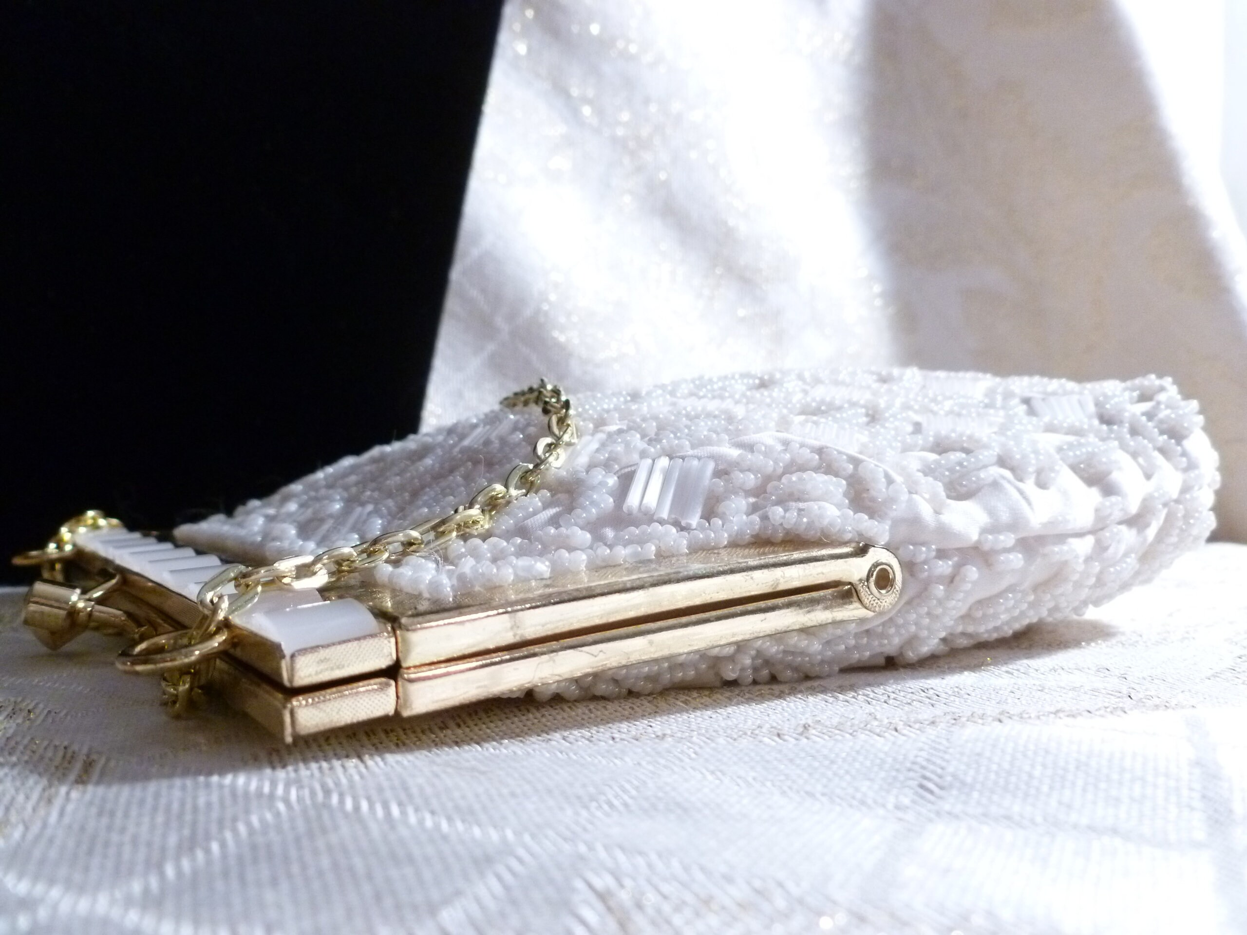 Listed for you here is an exceptional vintage white beaded handbag. Made with vintage white seed beads, bugal beads, scalloped edge at top, gold tone metal closure and chain handle. Ivory satin lining. Very elegant with an exquisite detailed design. Perfect for a Wedding Or Special Occasion. Excellent condition. Original tag inside. Measurements are 6"long 7"tall with a 12"drop chain handle. Sweet, sophisticated, and very elegant.