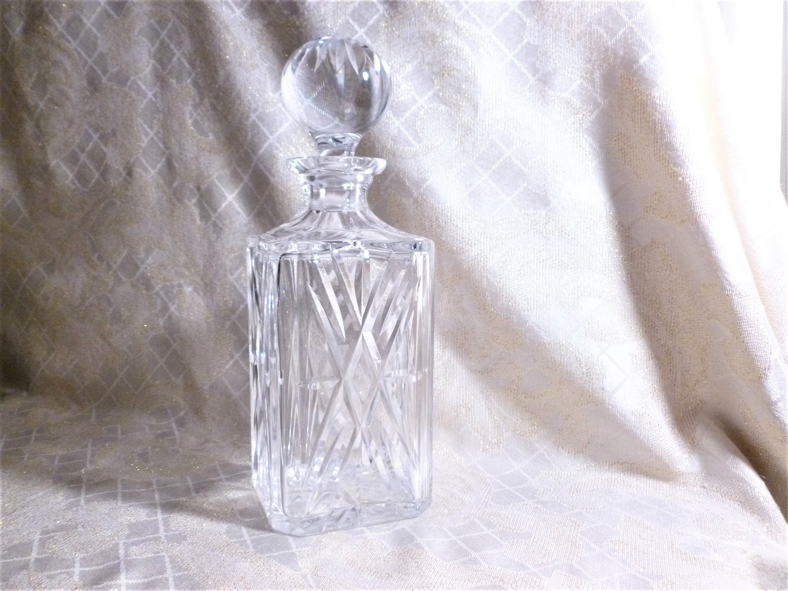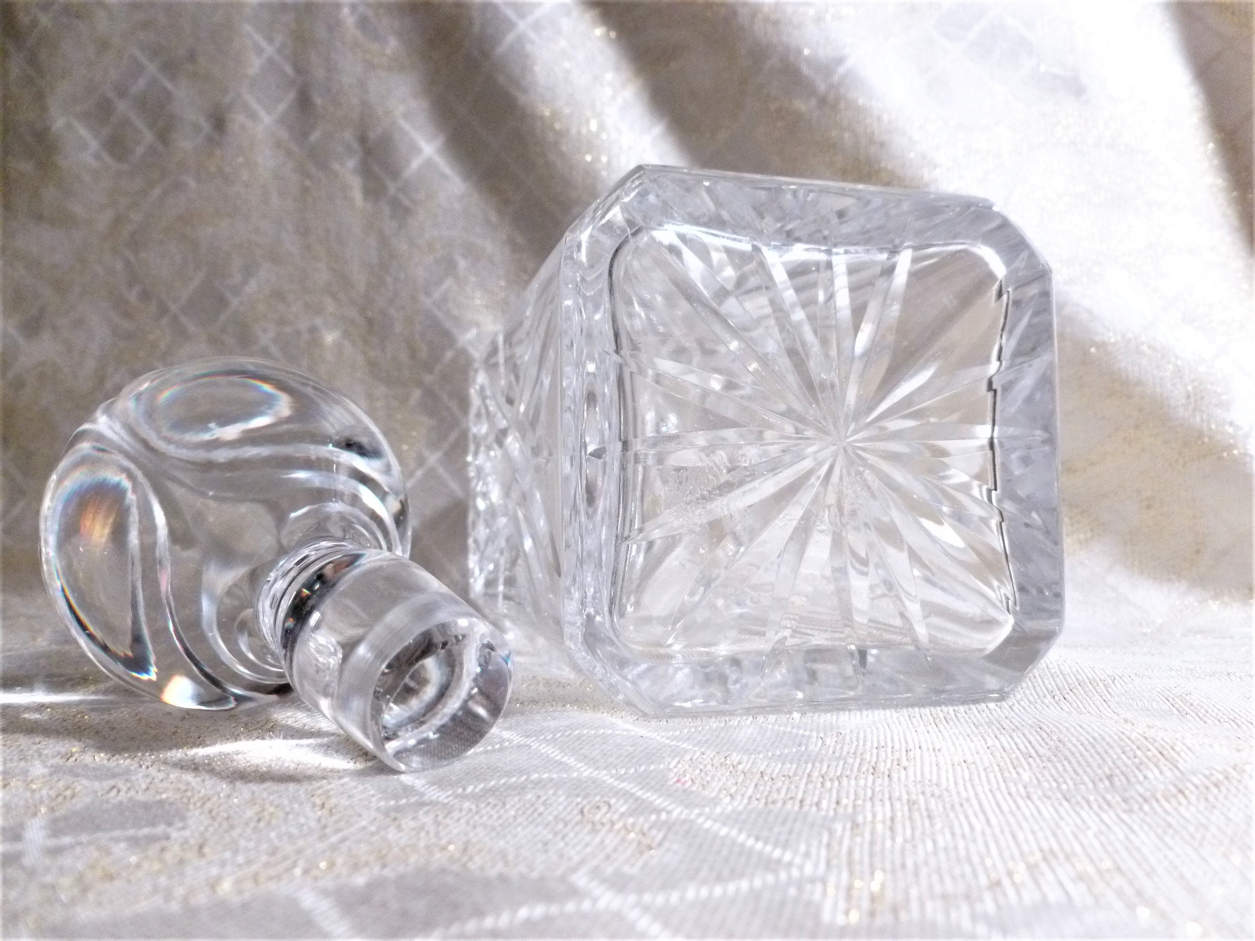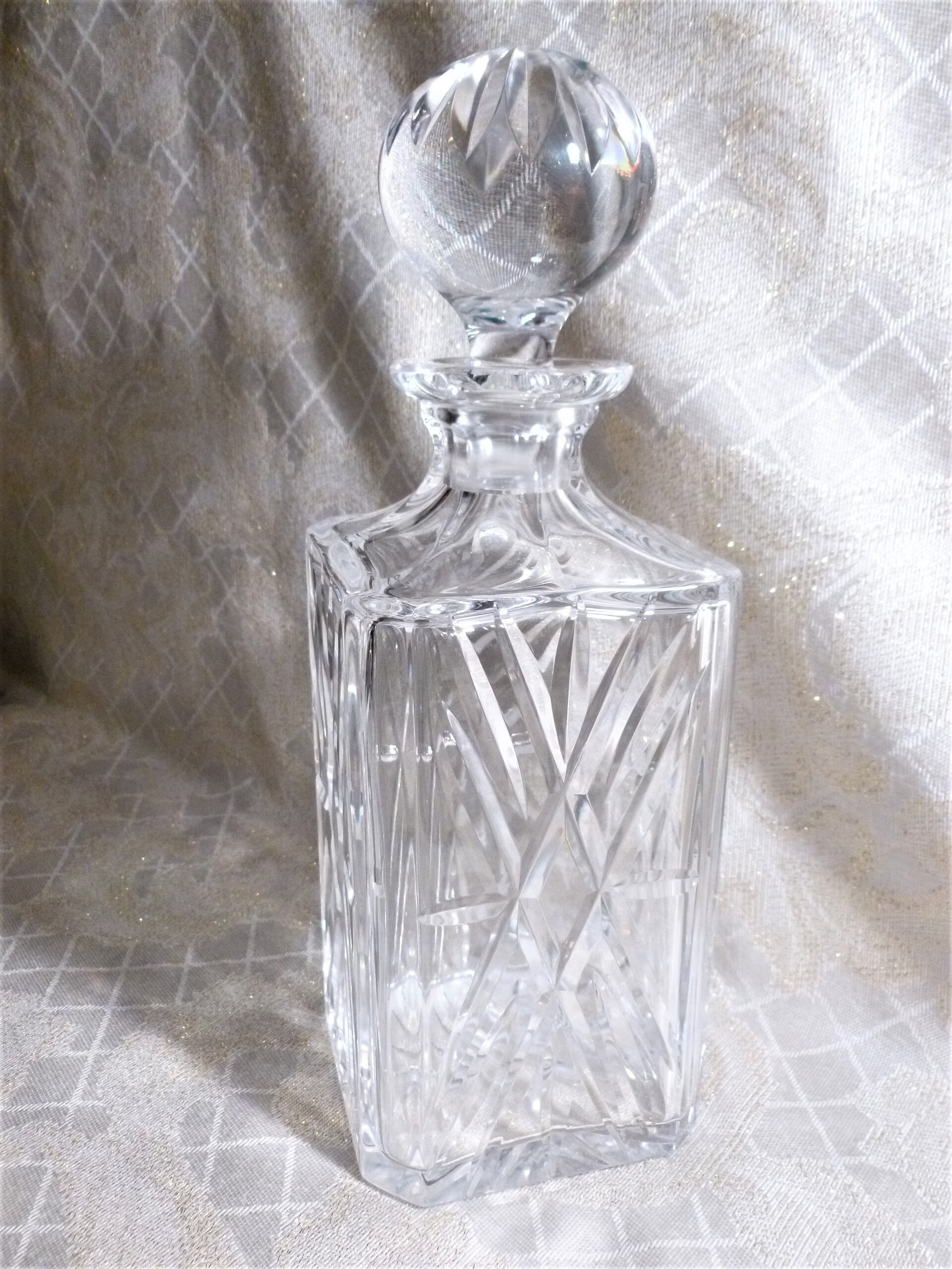 Listed for you here is a beautiful crystal decanter with stopper in an elegant design. Ideal for your favorite spirits or bubble bath display. Perfect gift. Measurements are 10 1/2"tall 3 1/2"wide stopper is 4"tall 2 1/2"wide at top.