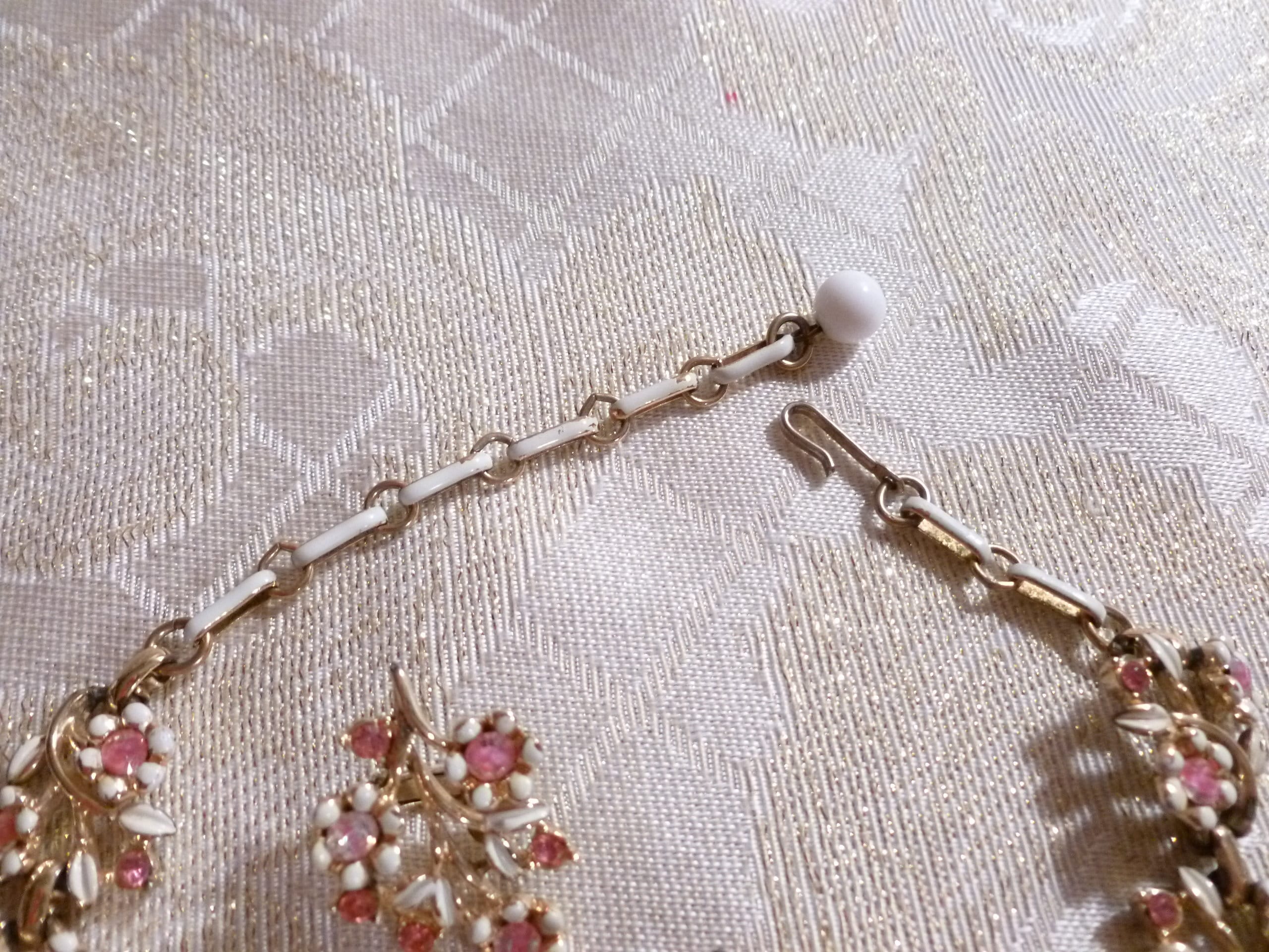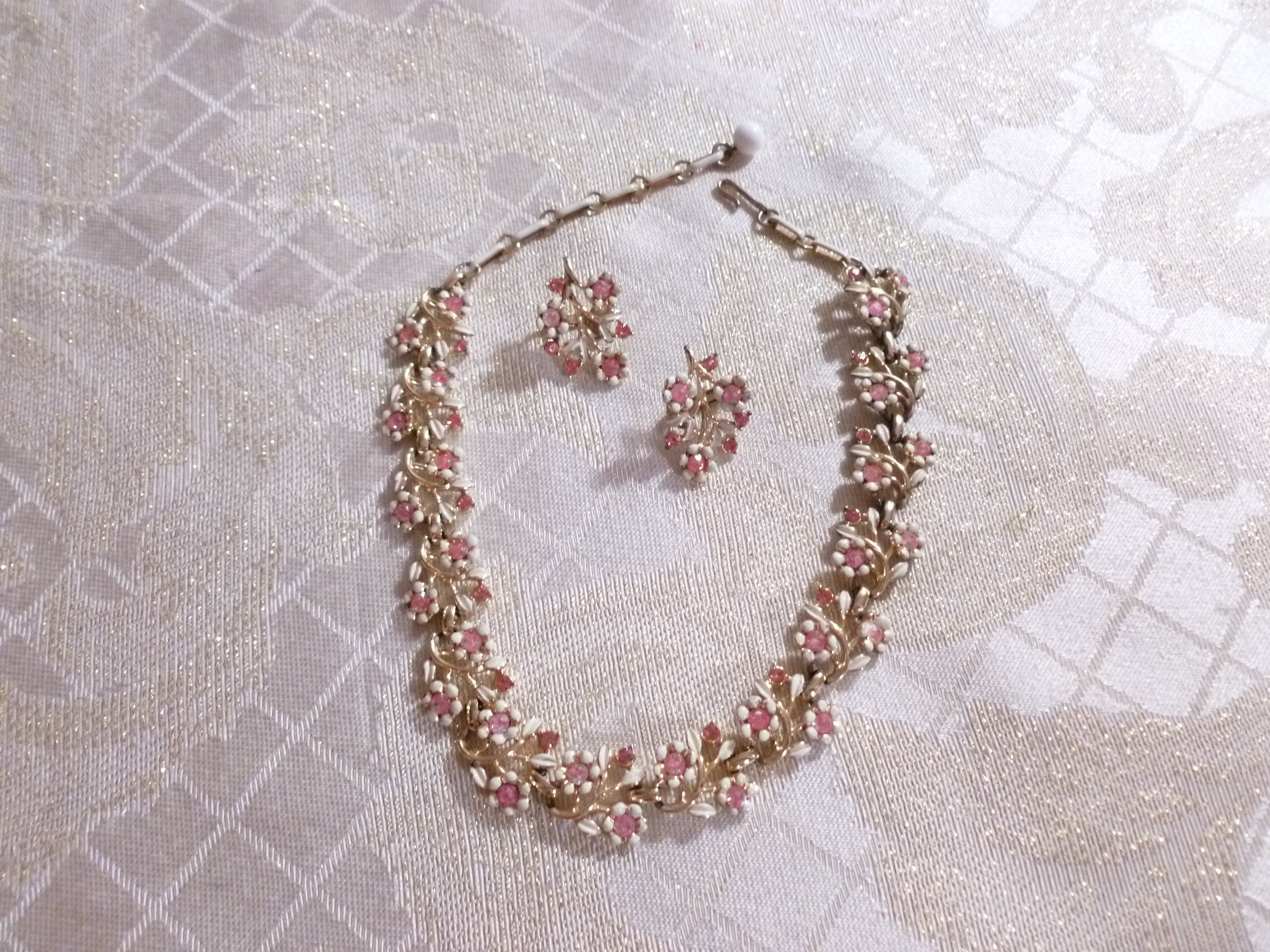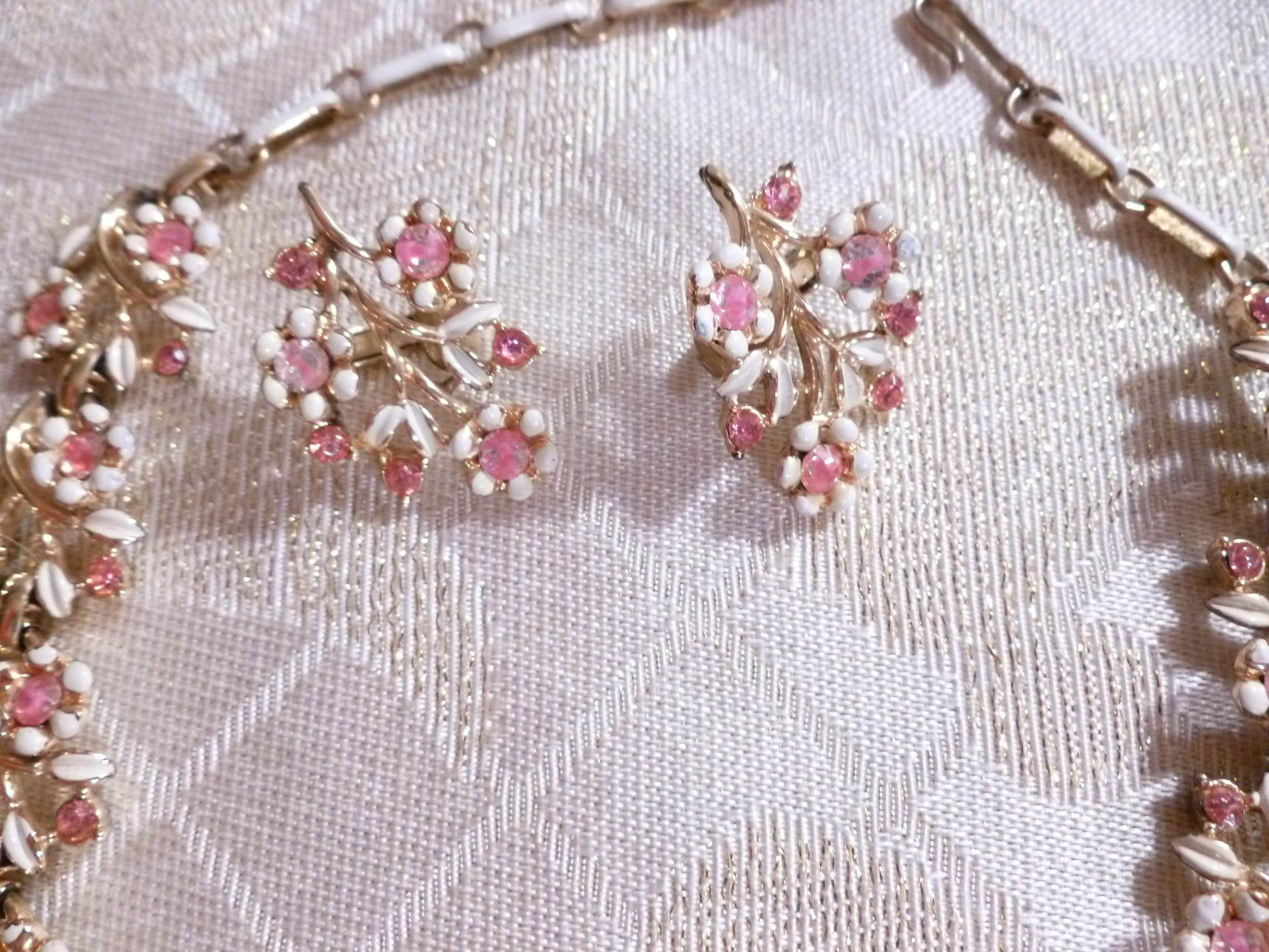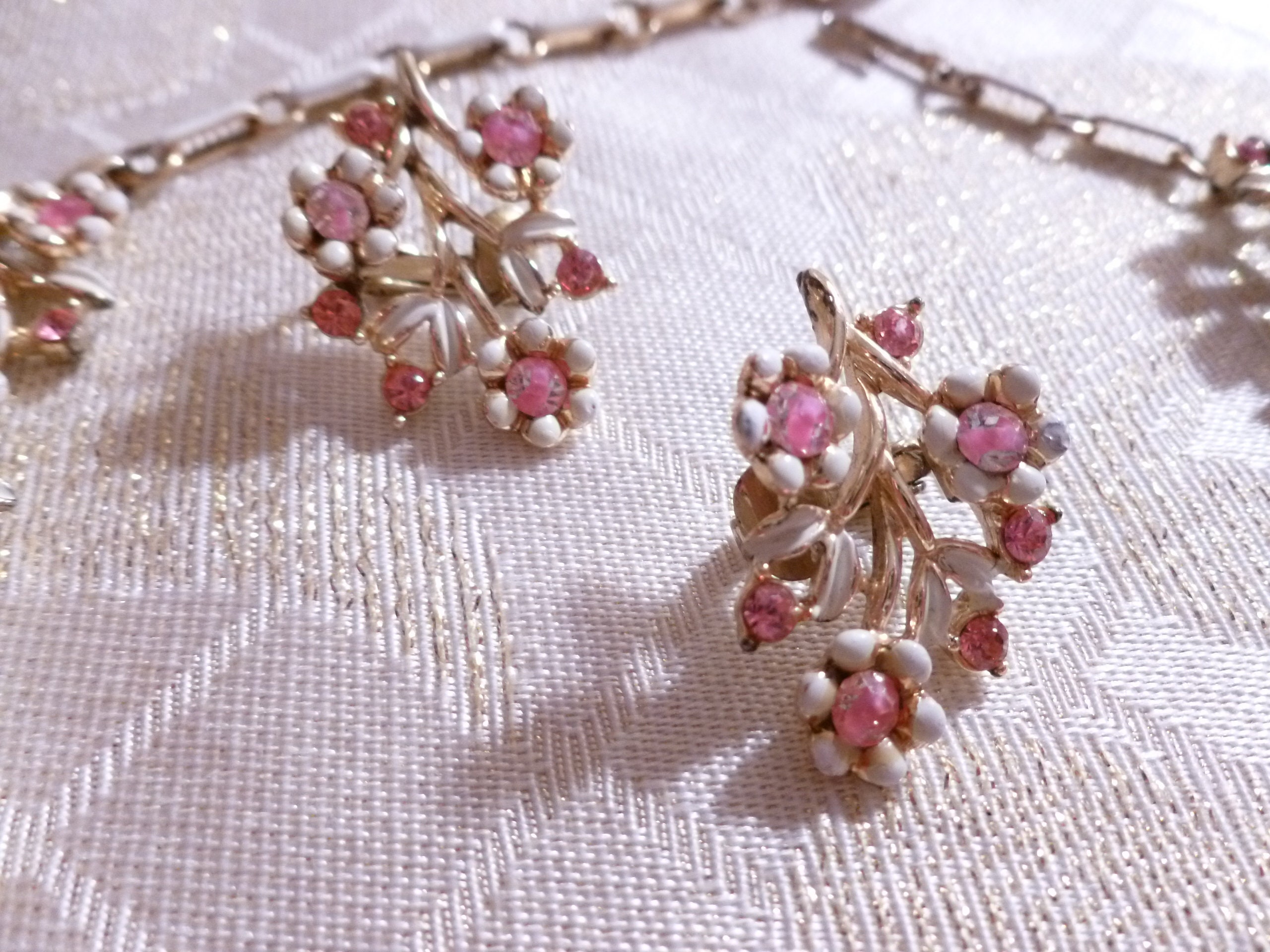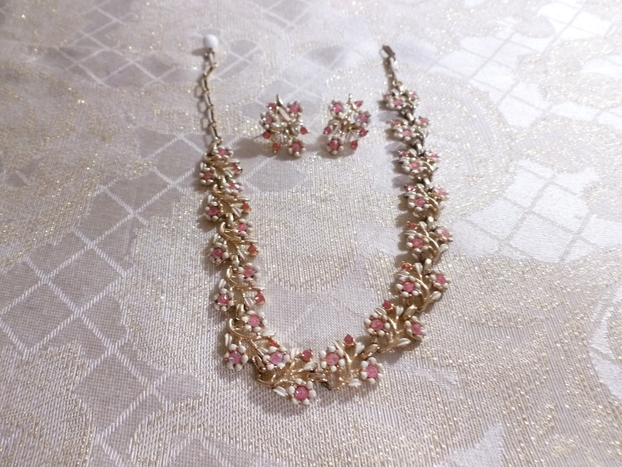 Listed for you here is a beautiful vintage pink rhinestone and white enameled, necklace and earring set. Manufactured in USA. The pretty floral design is an exceptional accessory for casual or vintage formal attire. The Necklace has an adjustable chain and hook back. The stylish clip on earrings are 1" in length and the necklace is 15"long, from end to end. Very good condition, no missing rhinestones. Pretty gift.