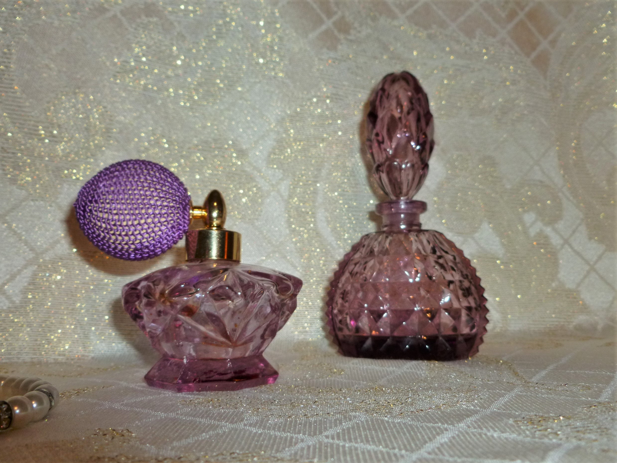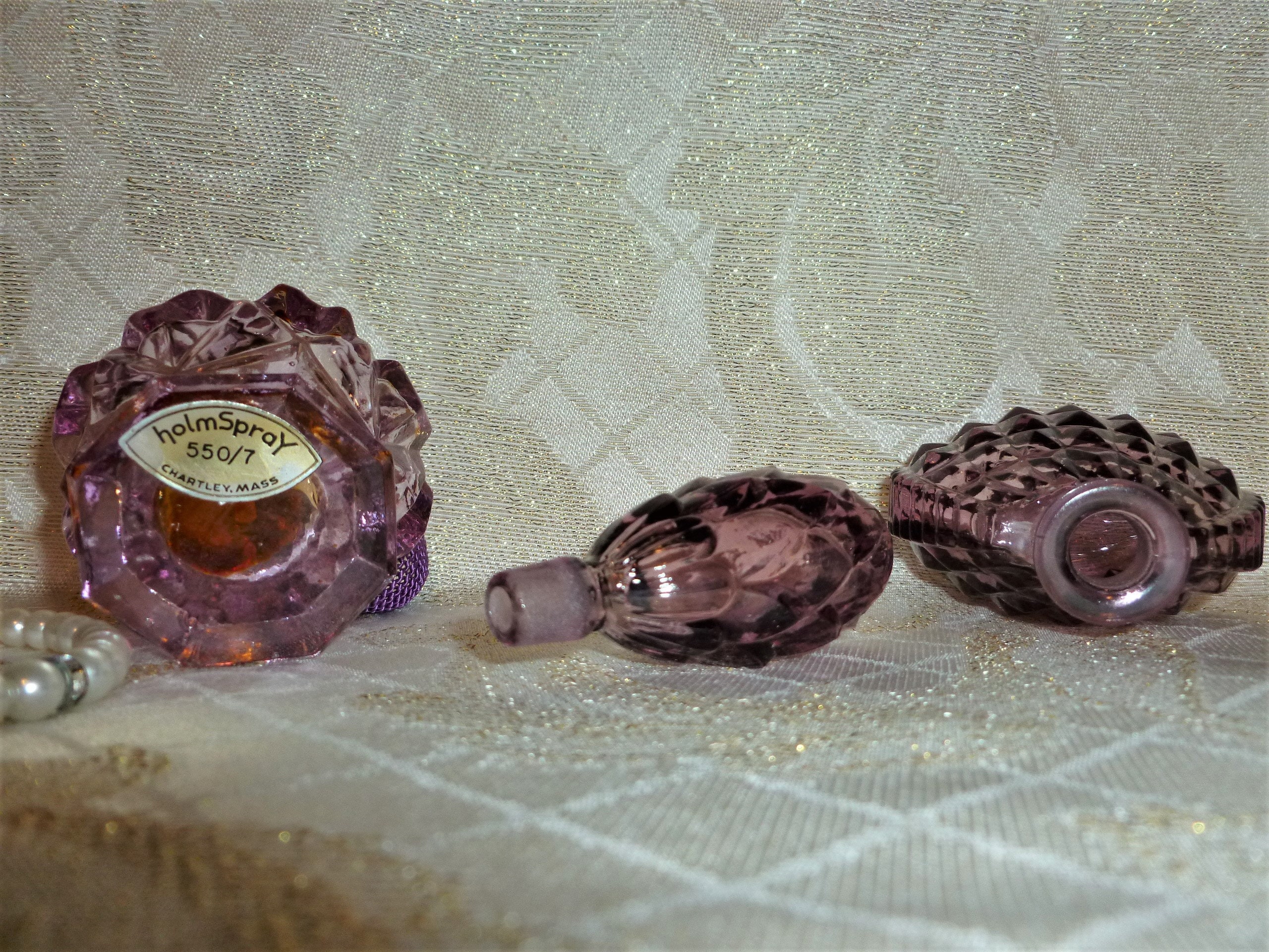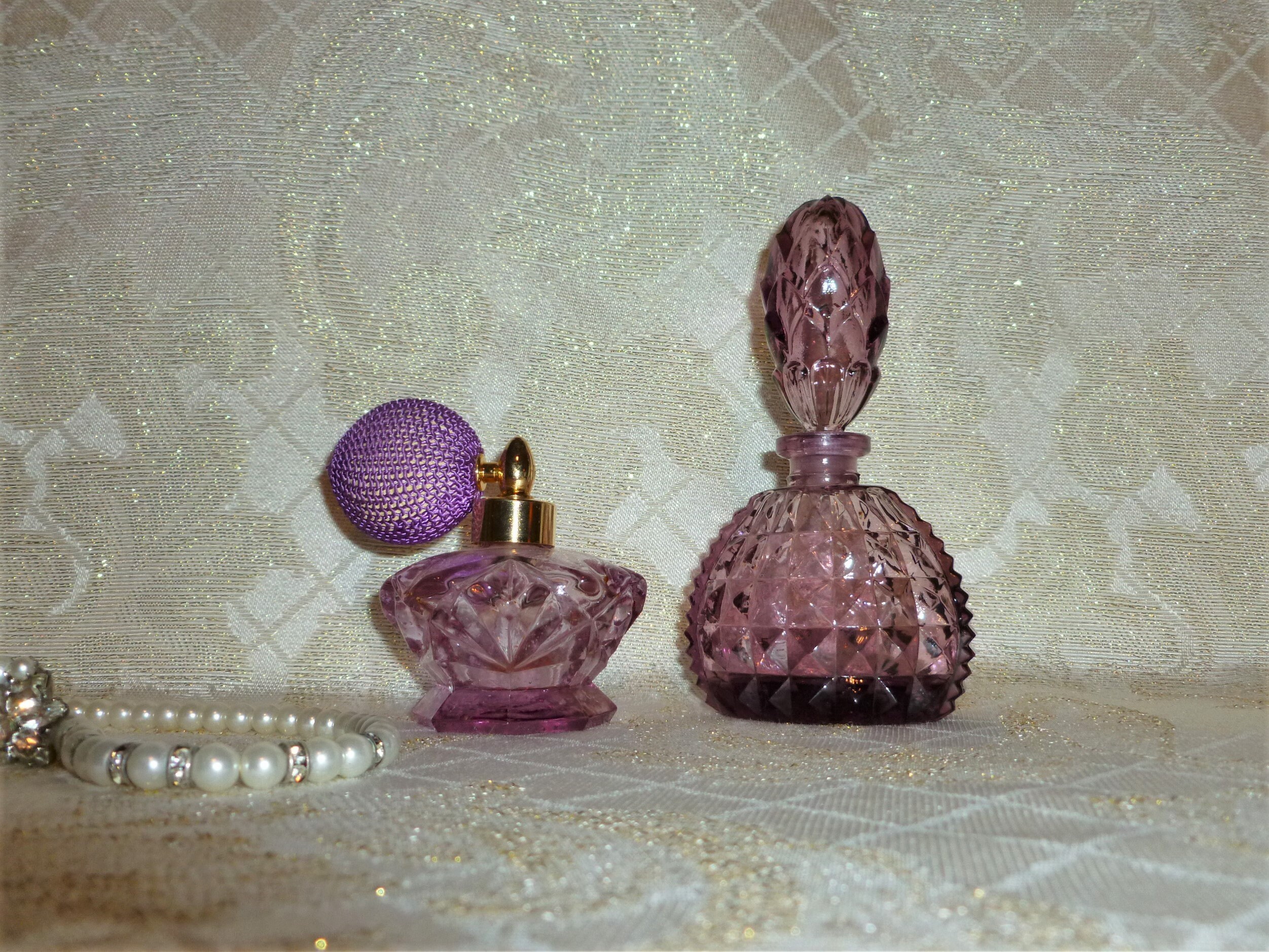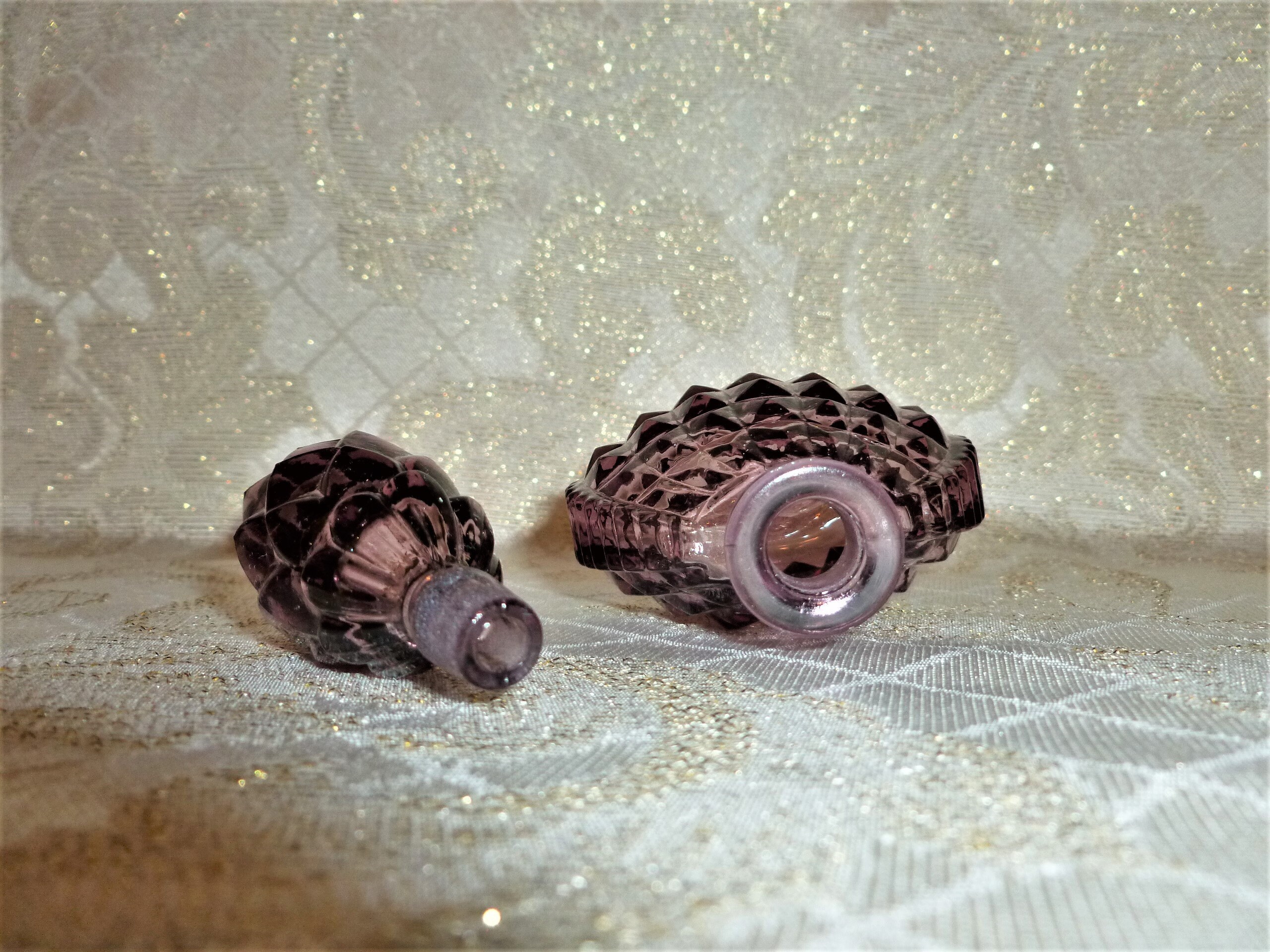 Listed for you here is a lovely pair of vintage perfume bottles, both in elegant purple color. Exceptional display. Vintage collectibles. The tall one has a flower bud stopper with a detailed bottle with an intricate design, very pretty. The smaller one is adorable. Holmspray USA created this one and it is #7 of only 550 made. This little bottle has a lavender net pump. The two bottles are in excellent condition with only slight wear to the stopper on the larger bottle from twisting it into the bottle. Measurements are tall bottle 5"tall 2 1/2"long 1 1/2"wide approximately 3ounce size and the smaller bottle is 3"tall 2 1/2"wide and holds approximately 2ounces of your favorite perfume oil. Both make excellent gifts.