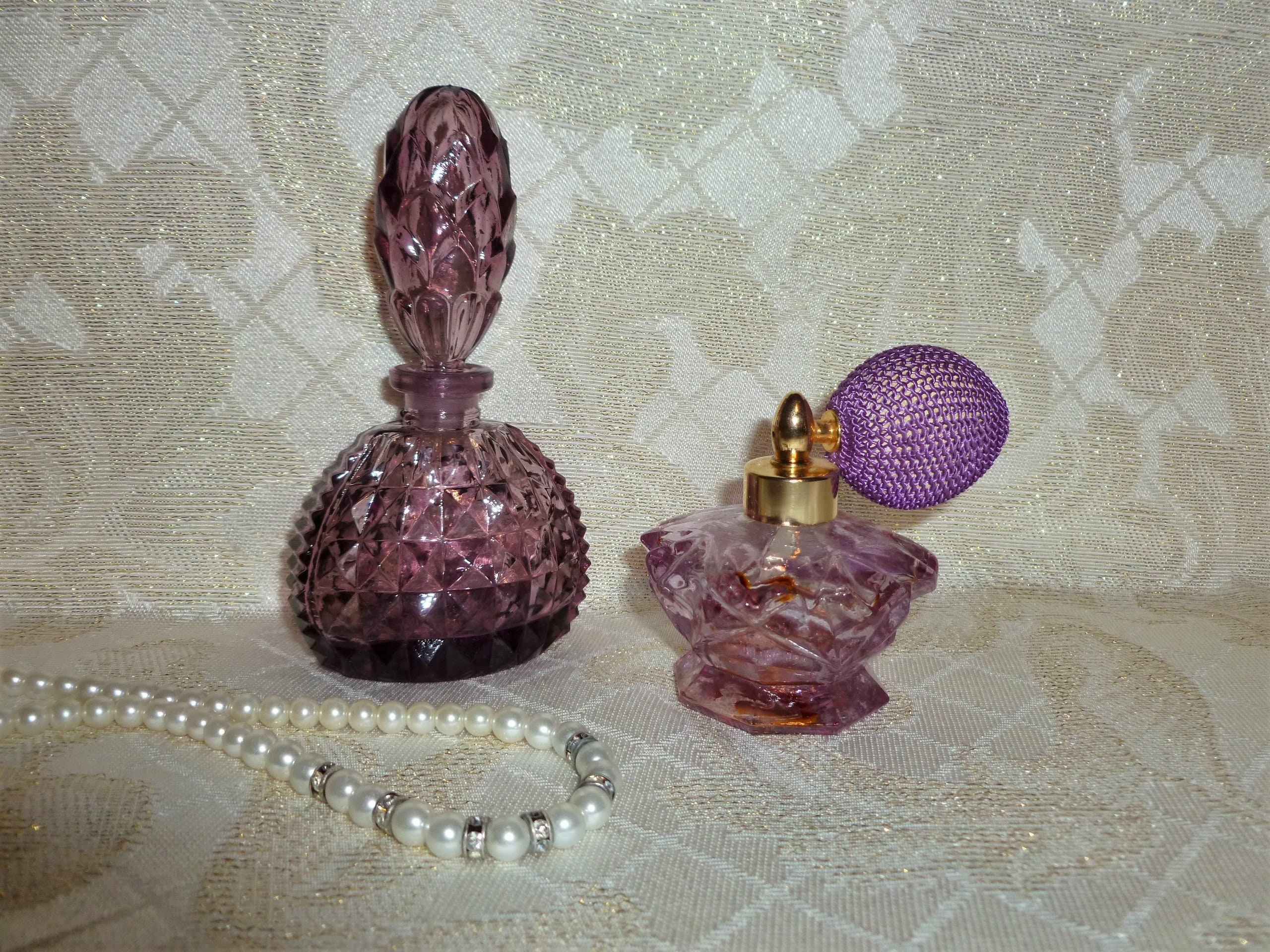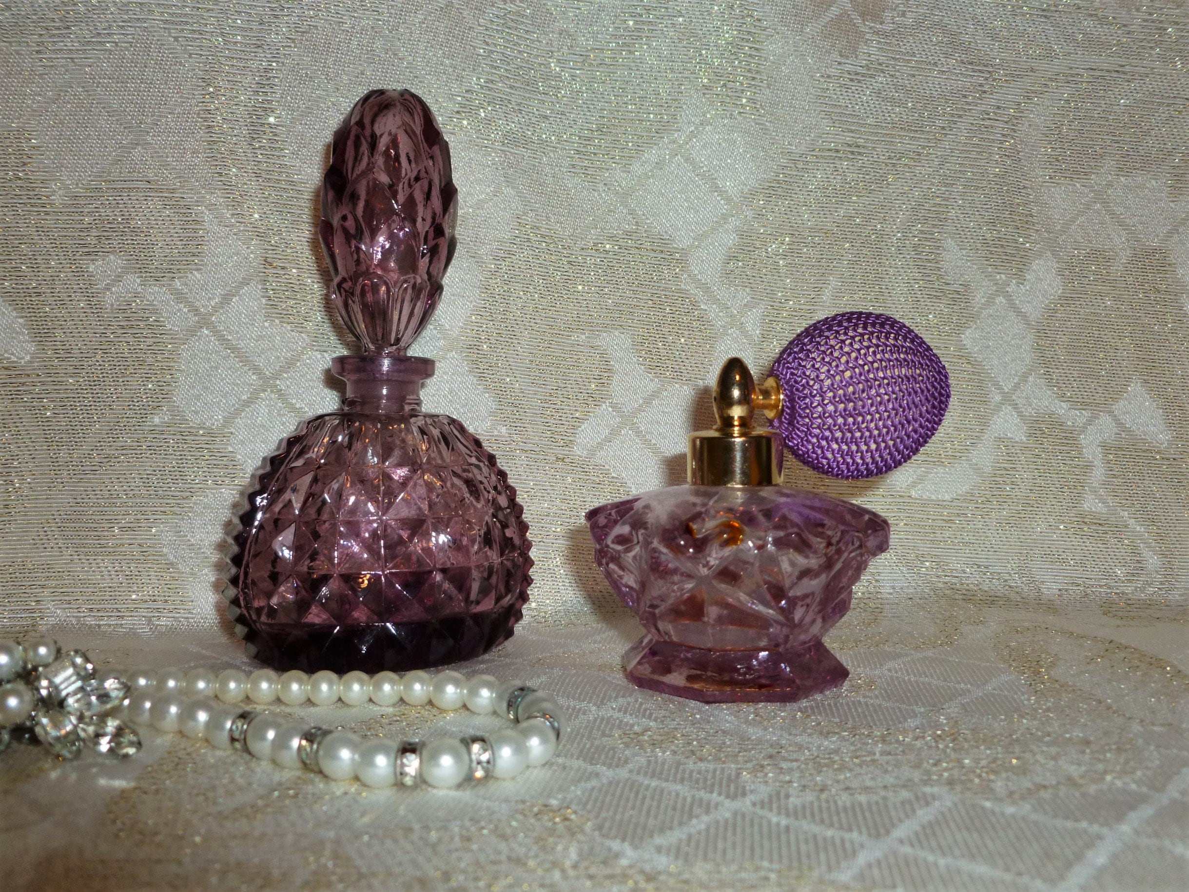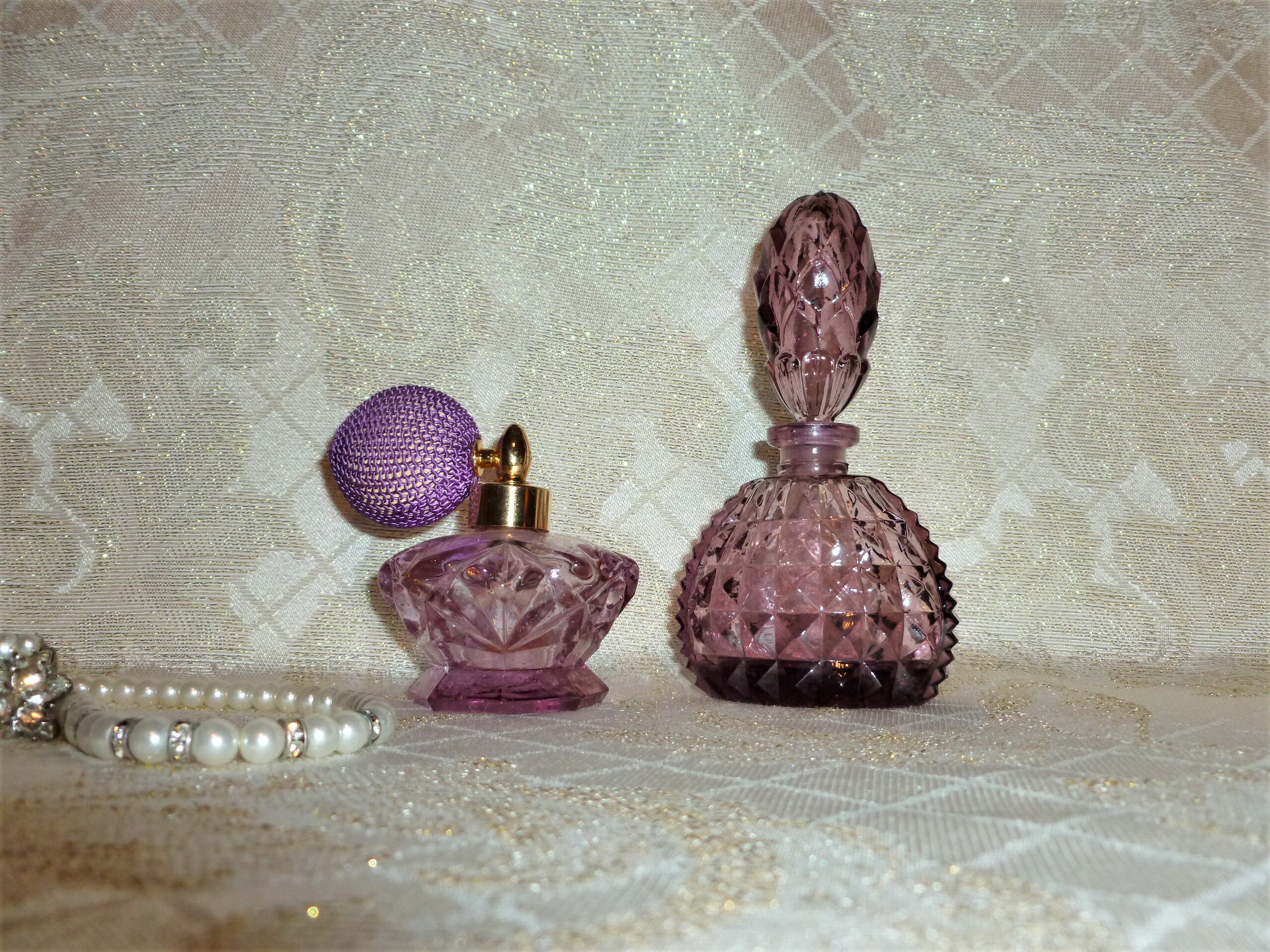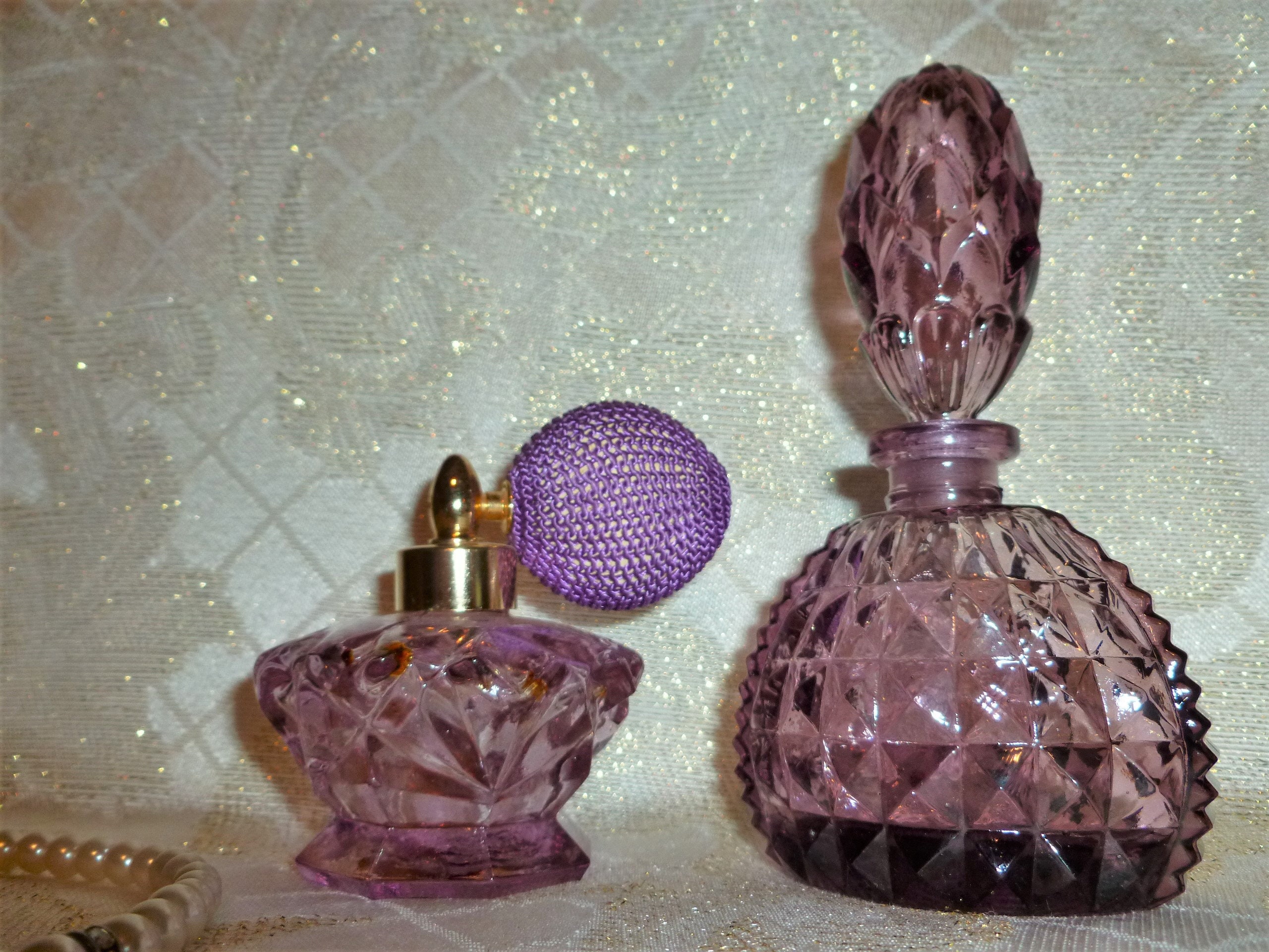 Listed for you here is a lovely pair of vintage perfume bottles, both in elegant purple color. Exceptional display. Vintage collectibles. The tall one has a flower bud stopper with a detailed bottle with an intricate design, very pretty. The smaller one is adorable. Holmspray USA created this one and it is #7 of only 550 made. This little bottle has a lavender net pump. The two bottles are in excellent condition with only slight wear to the stopper on the larger bottle from twisting it into the bottle. Measurements are tall bottle 5"tall 2 1/2"long 1 1/2"wide approximately 3ounce size and the smaller bottle is 3"tall 2 1/2"wide and holds approximately 2ounces of your favorite perfume oil. Both make excellent gifts.