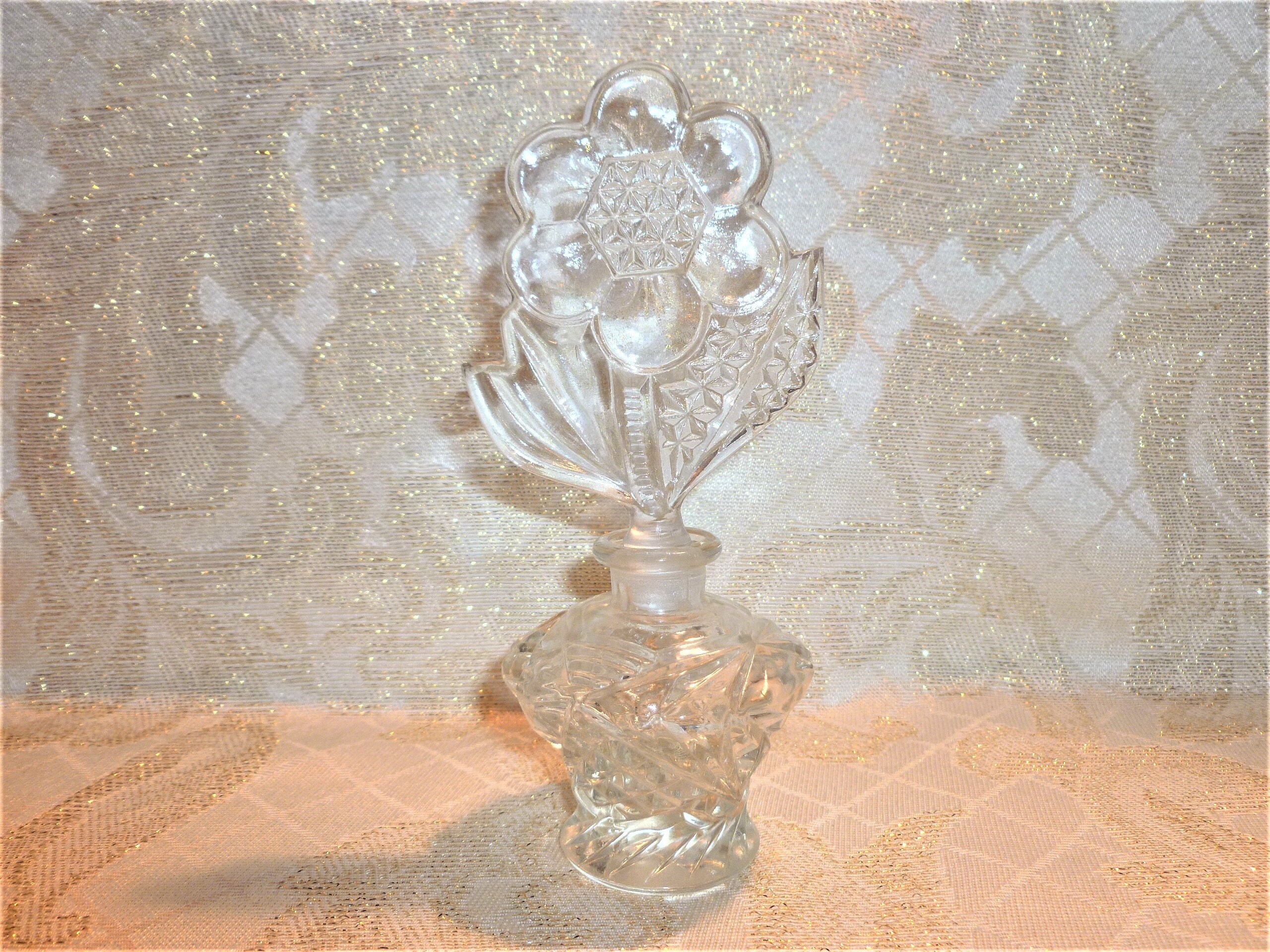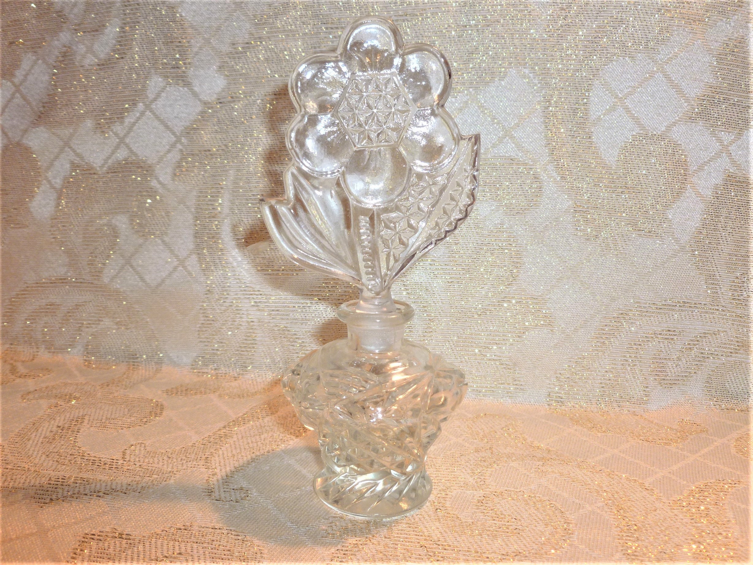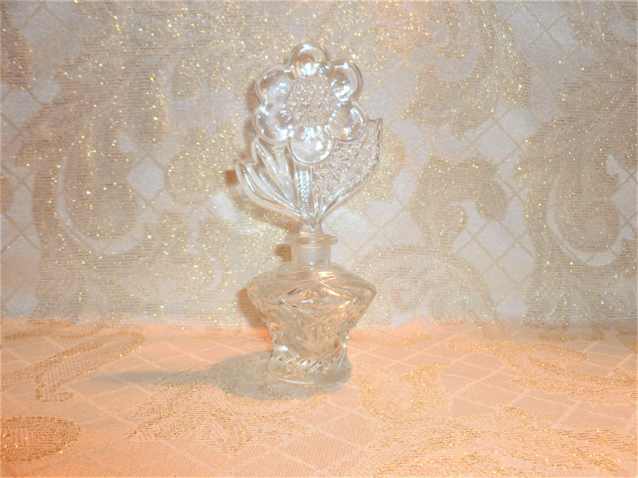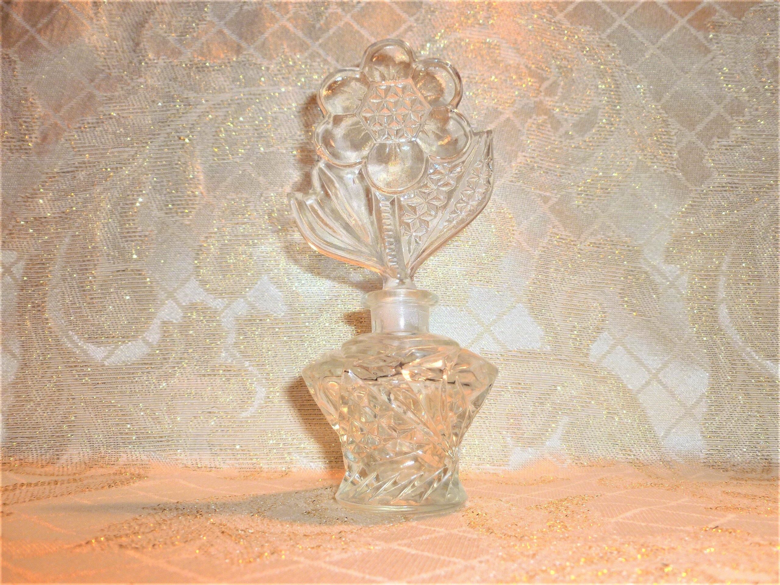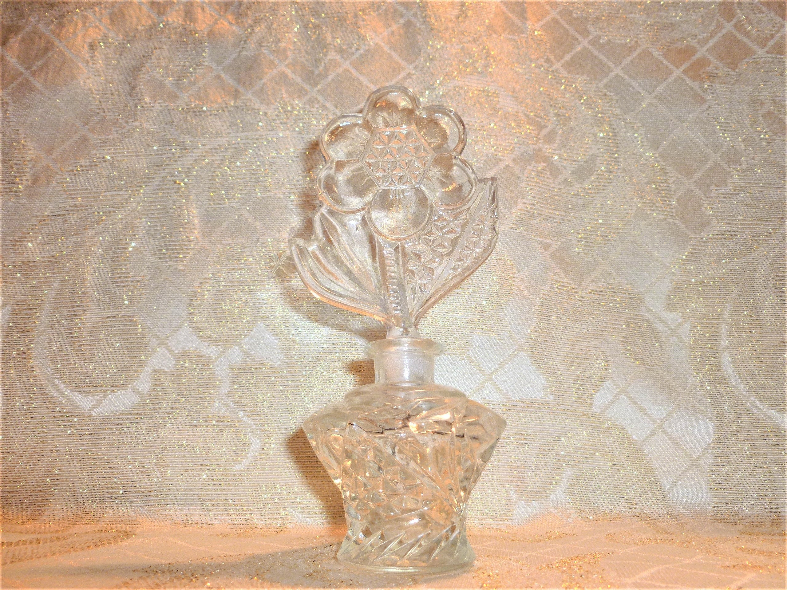 Listed for you here is a beautiful vintage perfume bottle. Elegant glass floral design on stopper with an exceptional display of cut glass style design in the bottom. Sophisticated display in perfume bottle vintage collectibles. Very slight wear to bottom of the stopper. Measurements are 6" tall and 2 1/2" wide and will hold approximately 2-3 ounces of your favorite perfume or oil. Perfect gift.