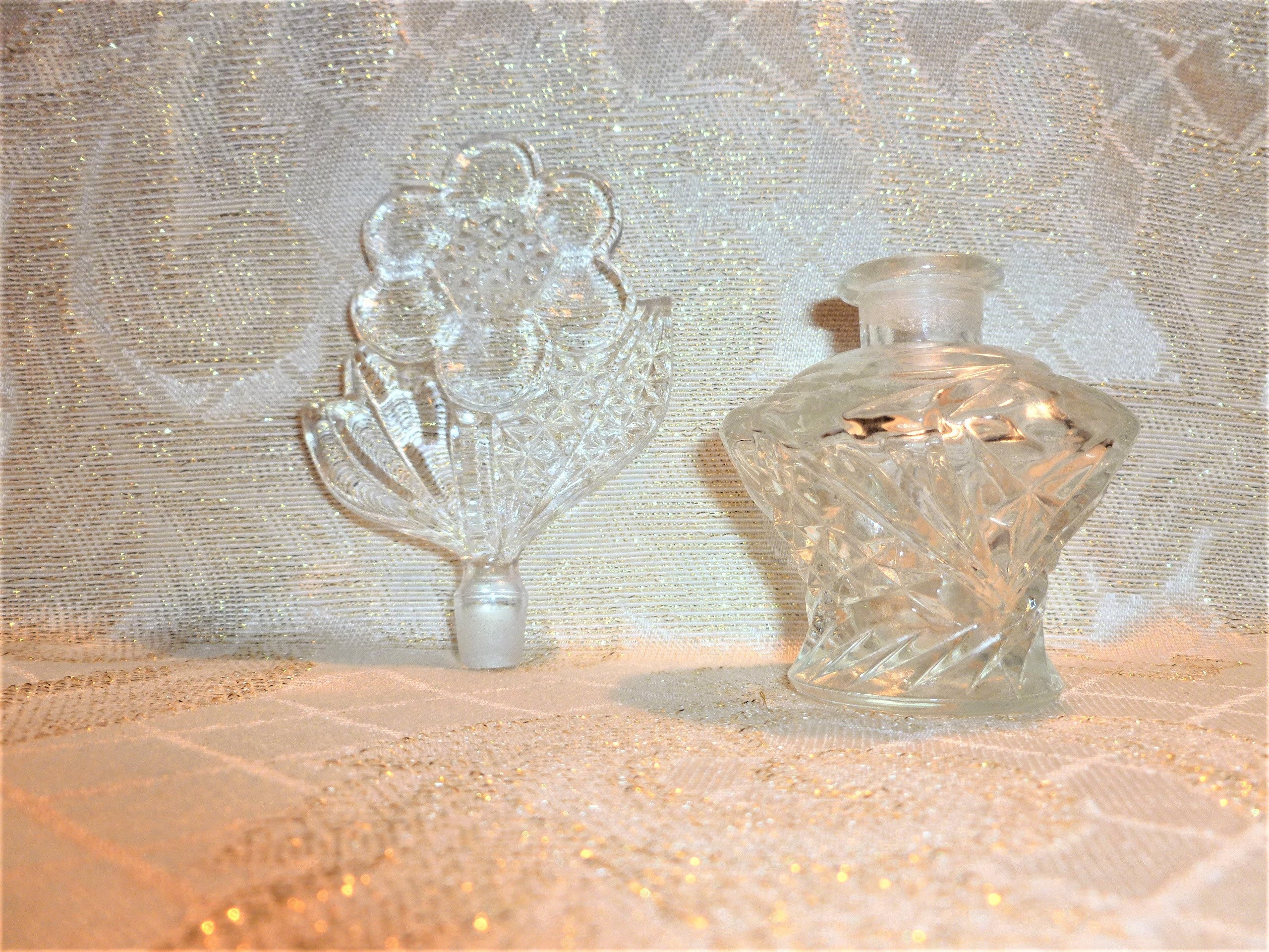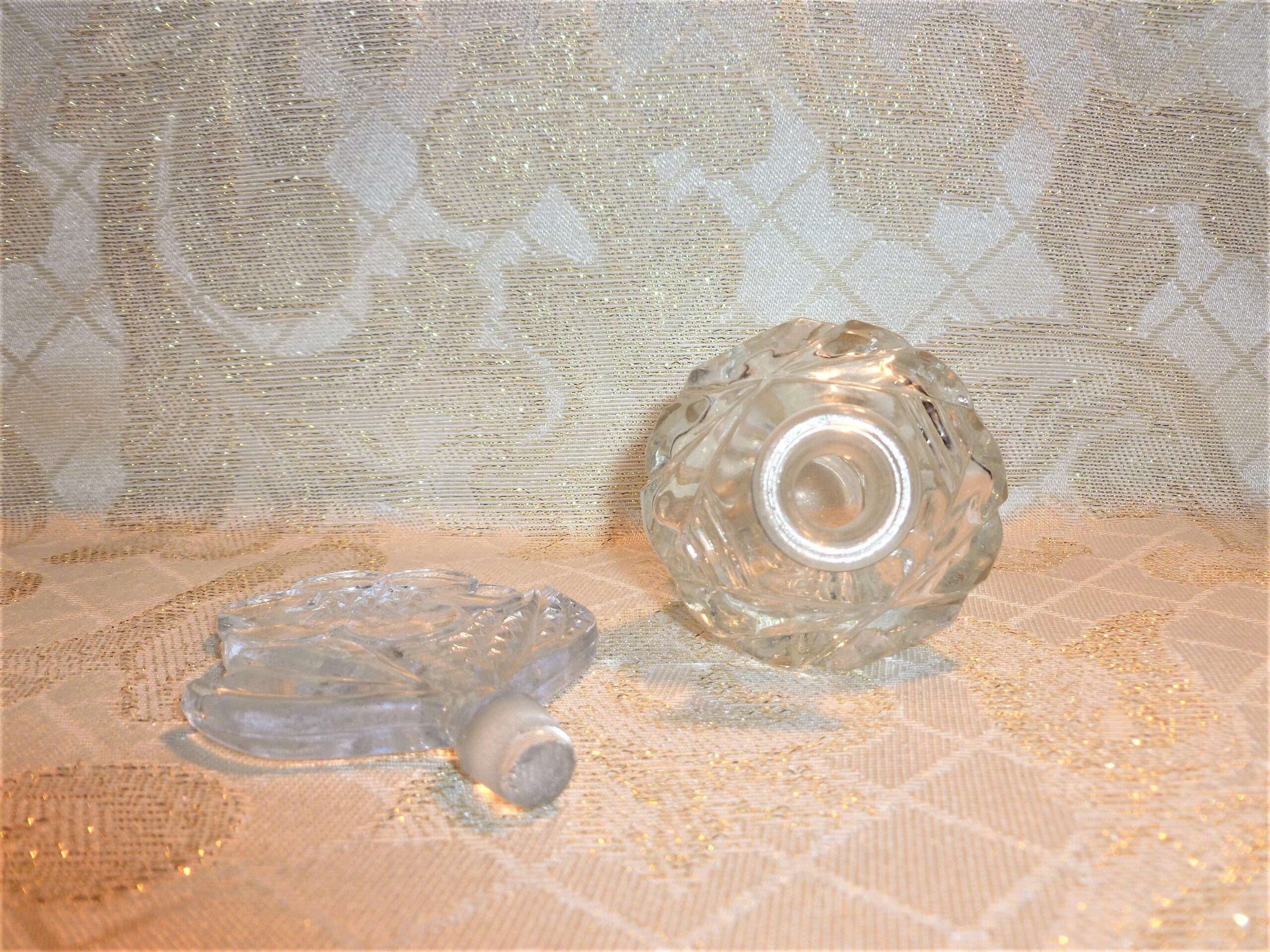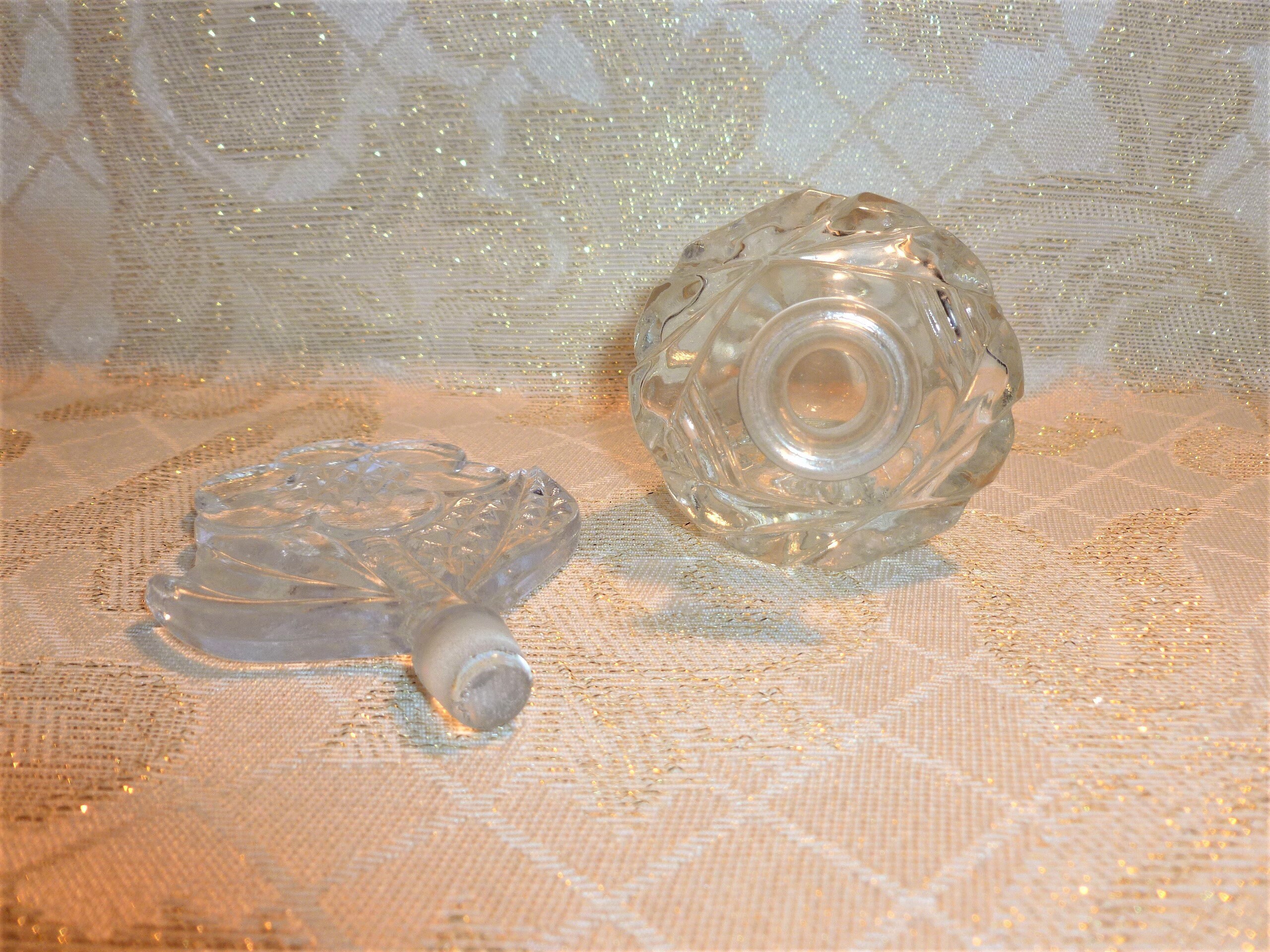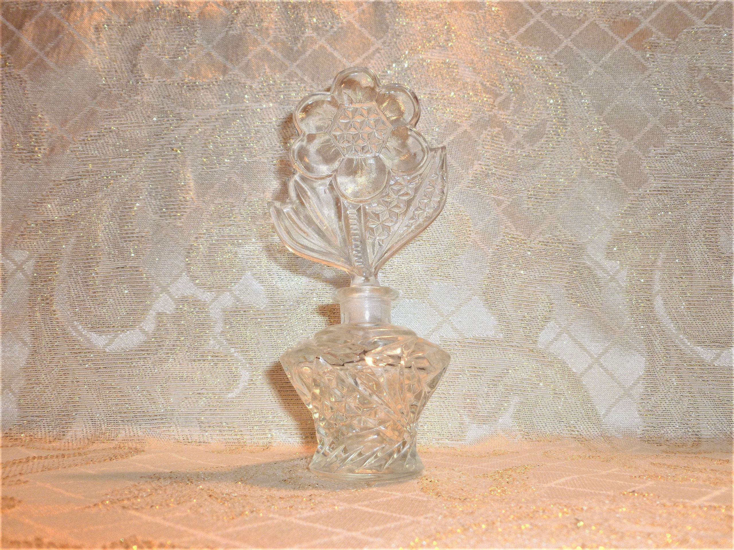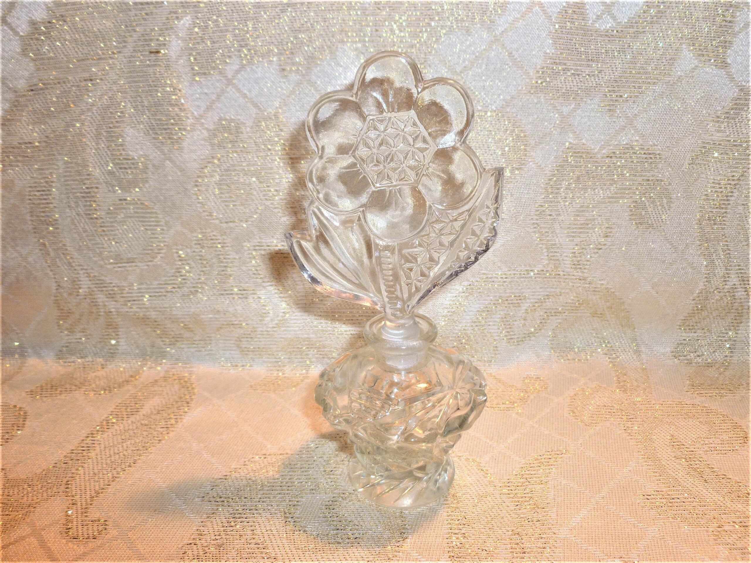 Listed for you here is a beautiful vintage perfume bottle. Elegant glass floral design on stopper with an exceptional display of cut glass style design in the bottom. Sophisticated display in perfume bottle vintage collectibles. Very slight wear to bottom of the stopper. Measurements are 6" tall and 2 1/2" wide and will hold approximately 2-3 ounces of your favorite perfume or oil. Perfect gift.