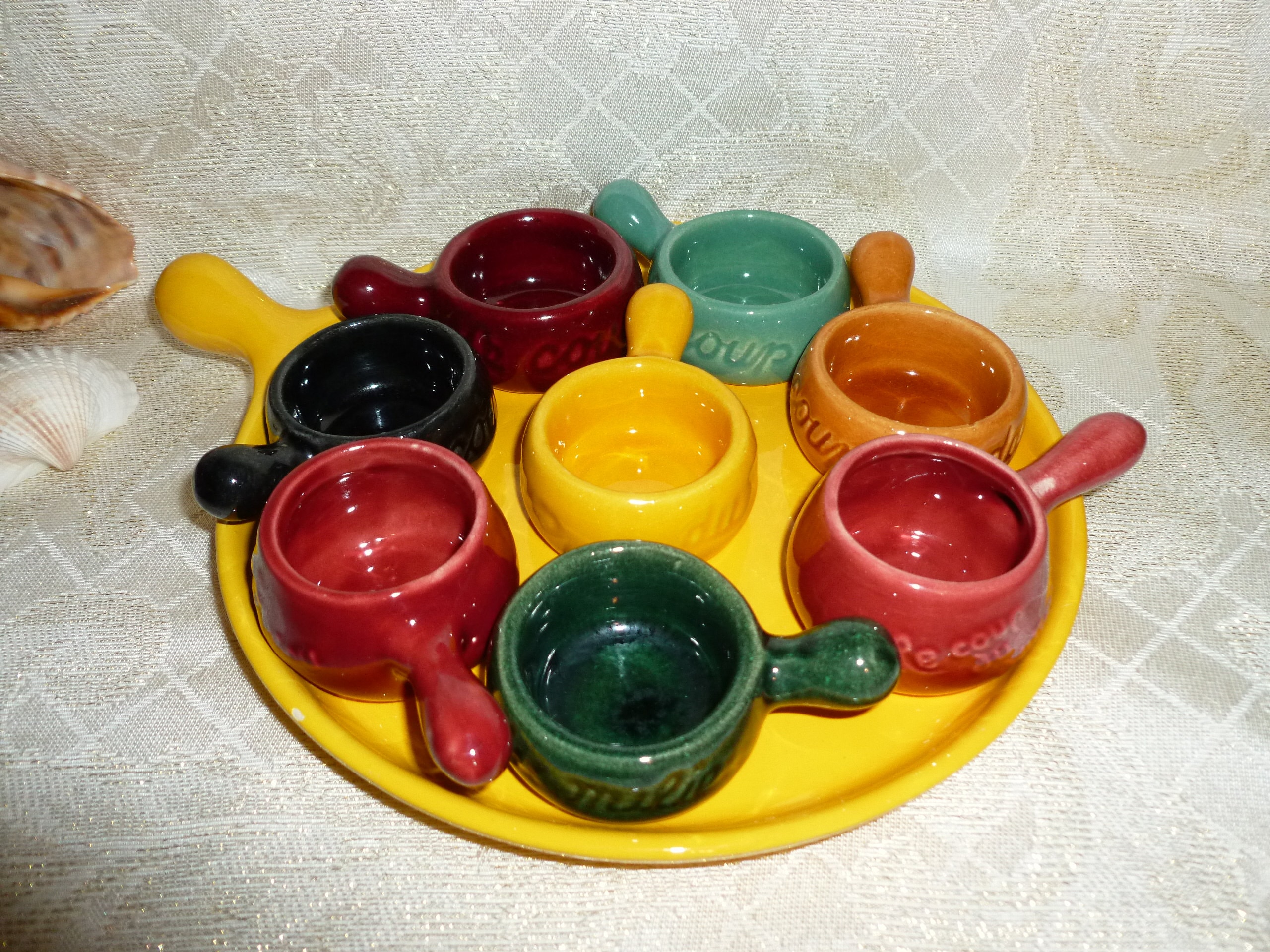 Colorful individual Escargot dishes or clarified butter cups set of eight with one serving tray. Ideal for appetizers or hors d' oeuvres. Pretty display. Measurements are for each small cup 1" tall and 2" wide and for the serving tray measurements are 1" tall and 8" wide.