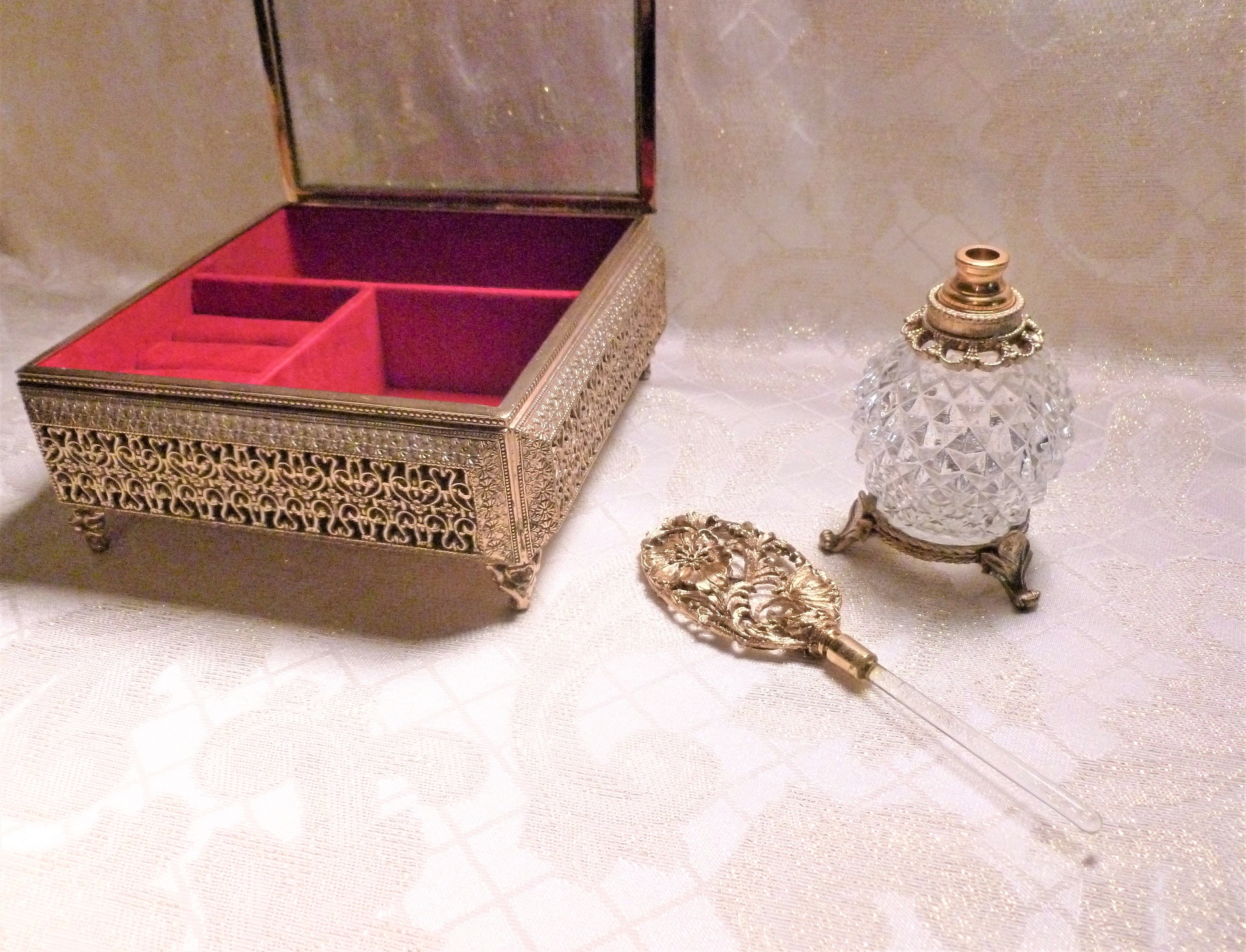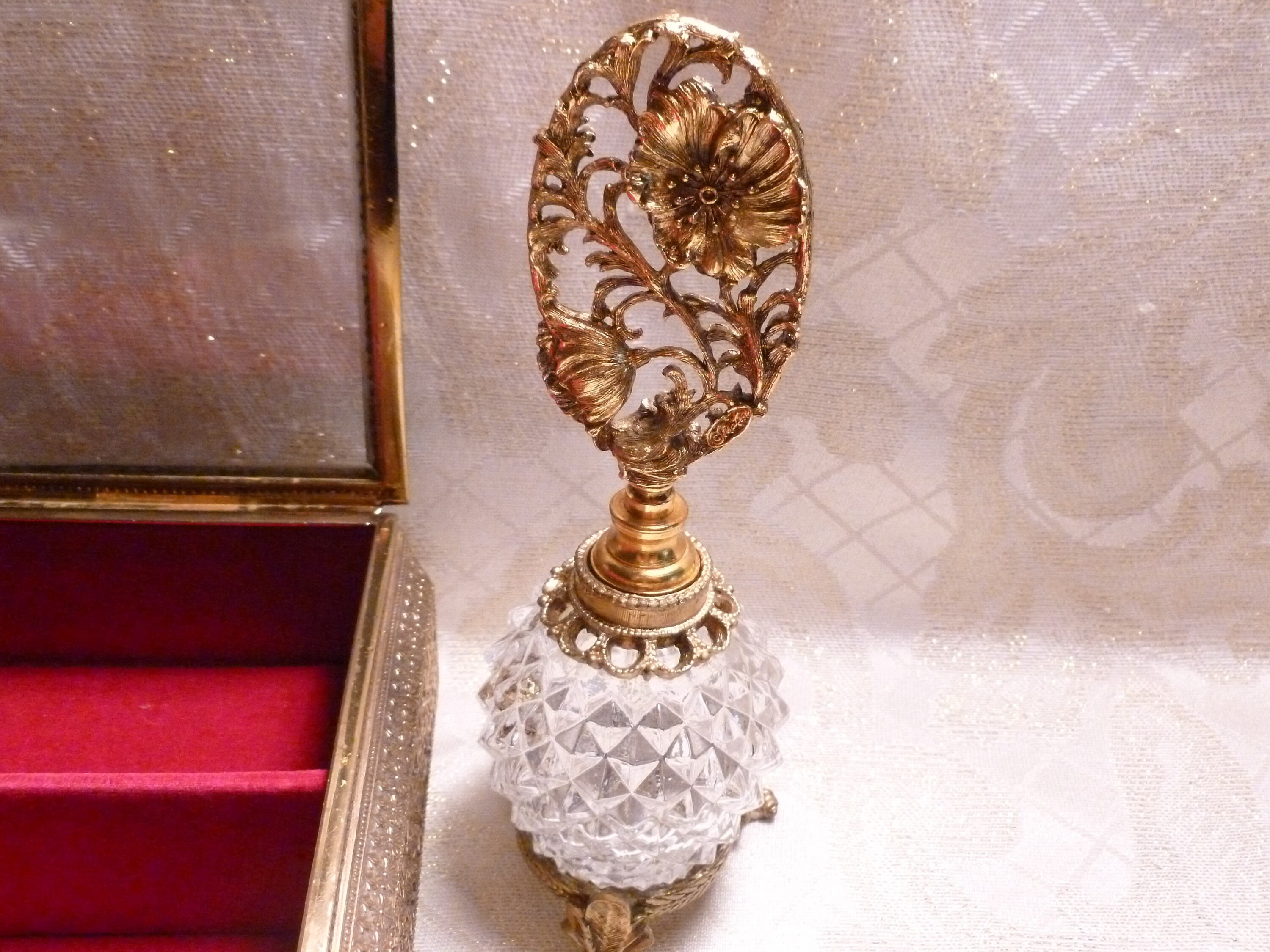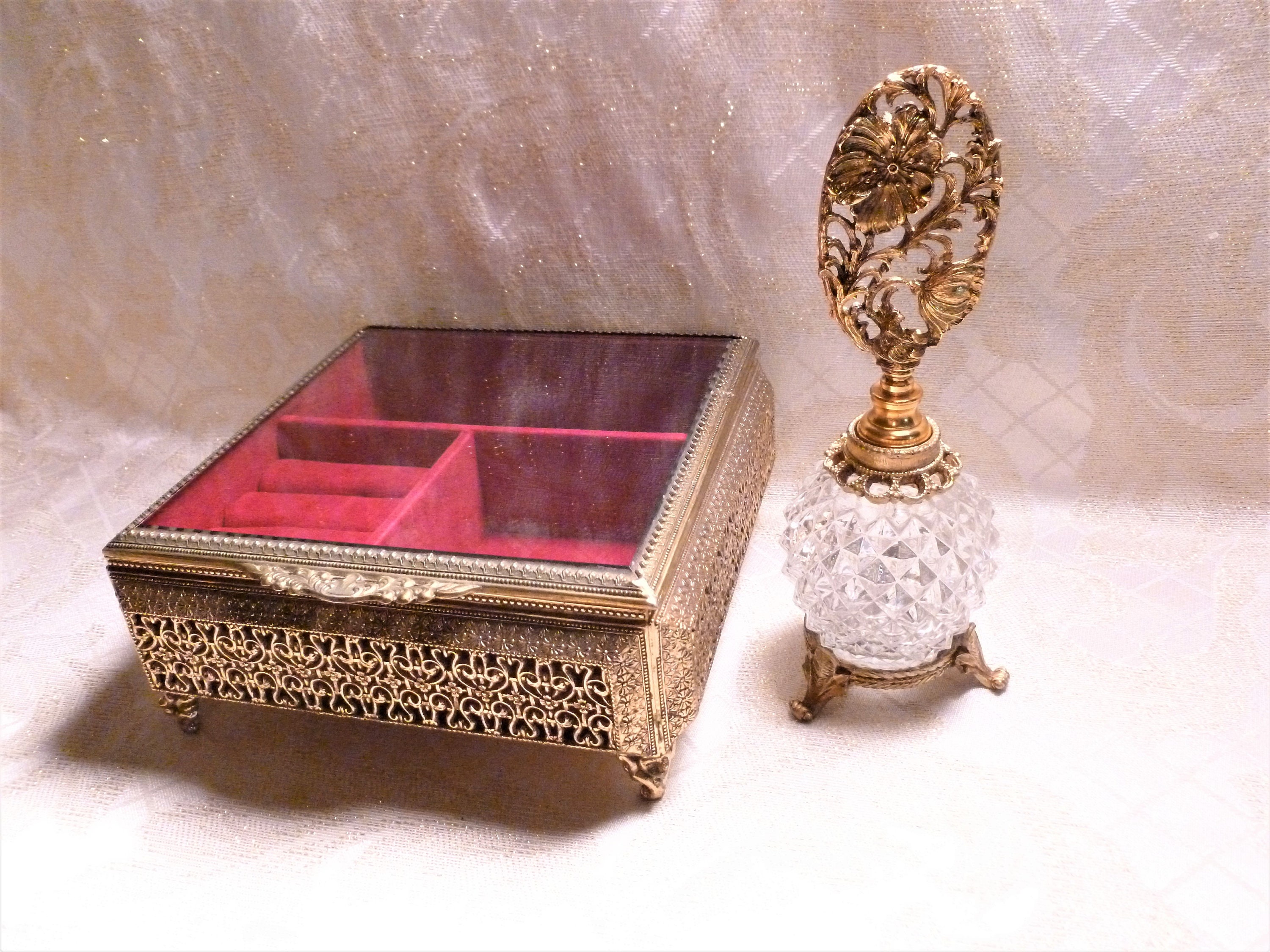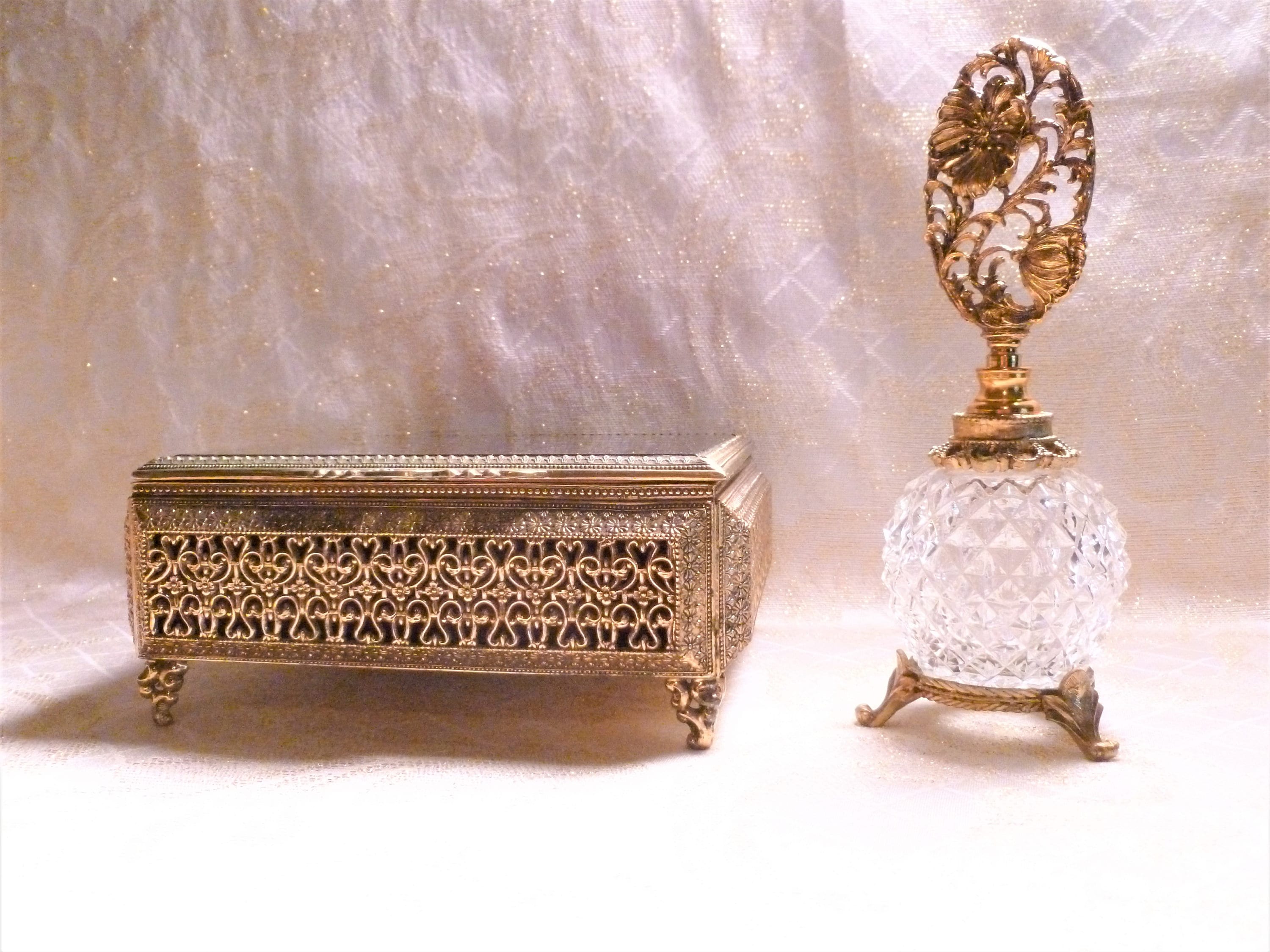 Vintage golden floral filigree jewelry box with little feet, red velvet lining and hinged glass lid. Beautiful display. Also a vintage english hobnail perfume bottle perched on three little feet and put together with a Matson dauber in a gorgeous dogwood flower design. Exceptional display, as is and in excellent condition. Was never sold together as a set but looks beautiful together. Measurements are jewelry box 7 1/2 inches long 7 1/4 inches wide and 3 1/4 inches tall perfume bottle is 7 1/2 inches tall and 3 inches wide at feet. Ideal vintage collectible gifts.
