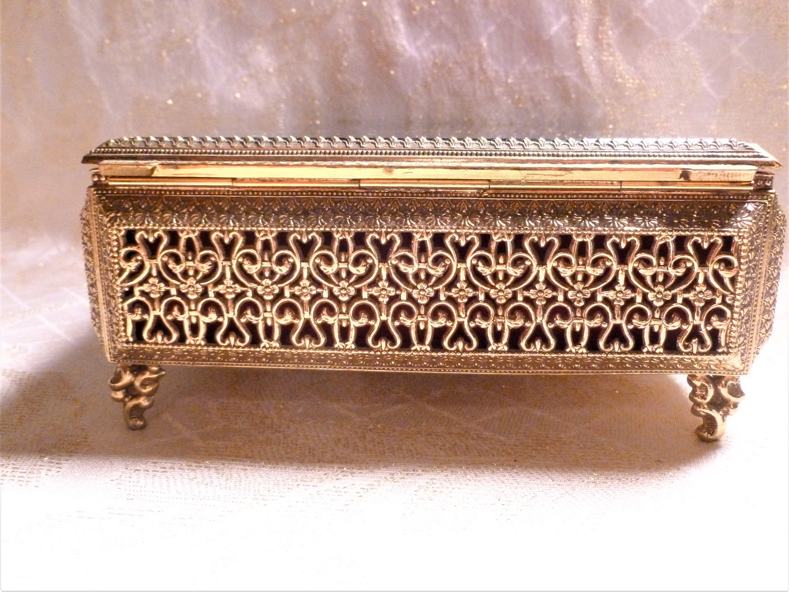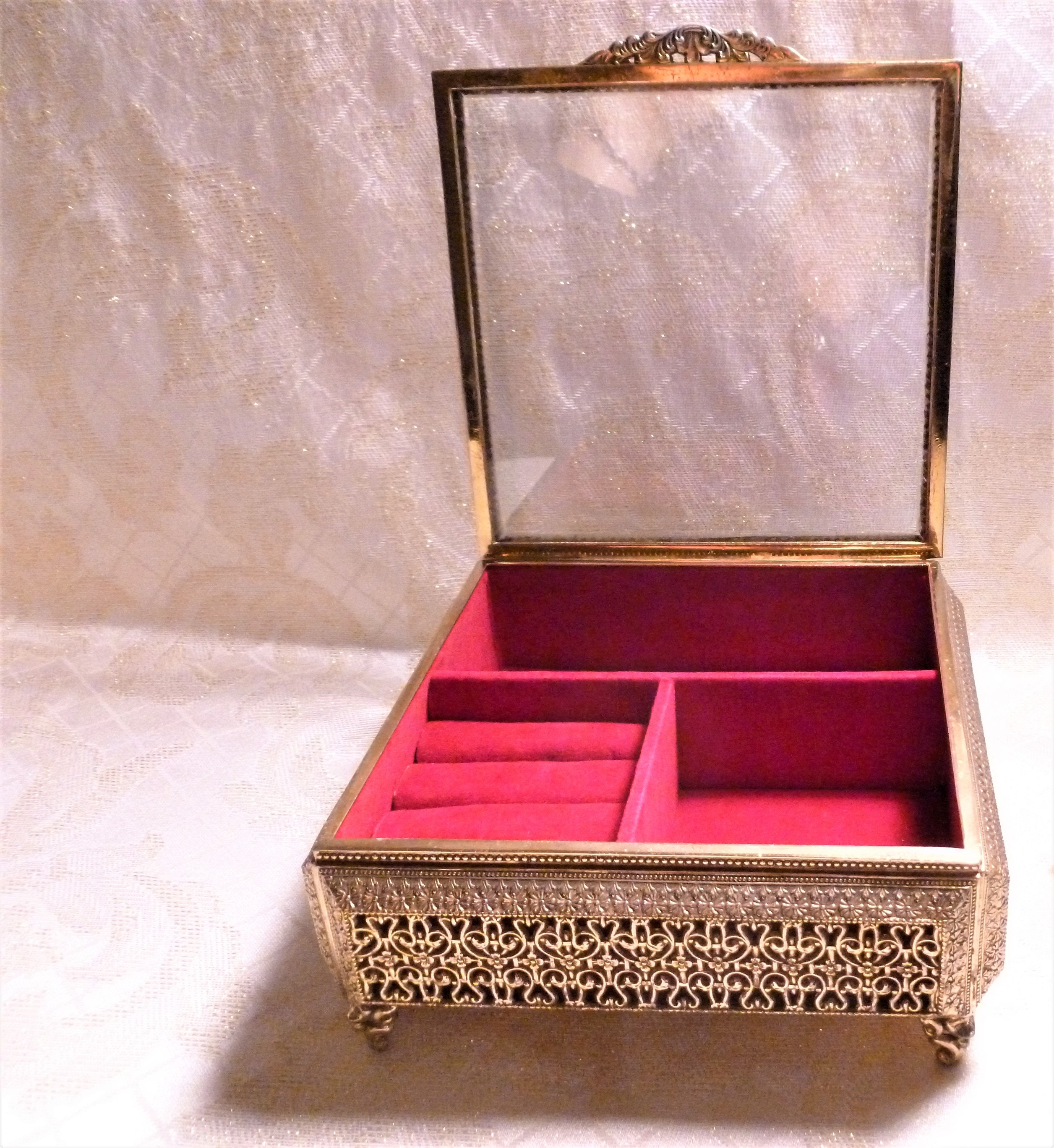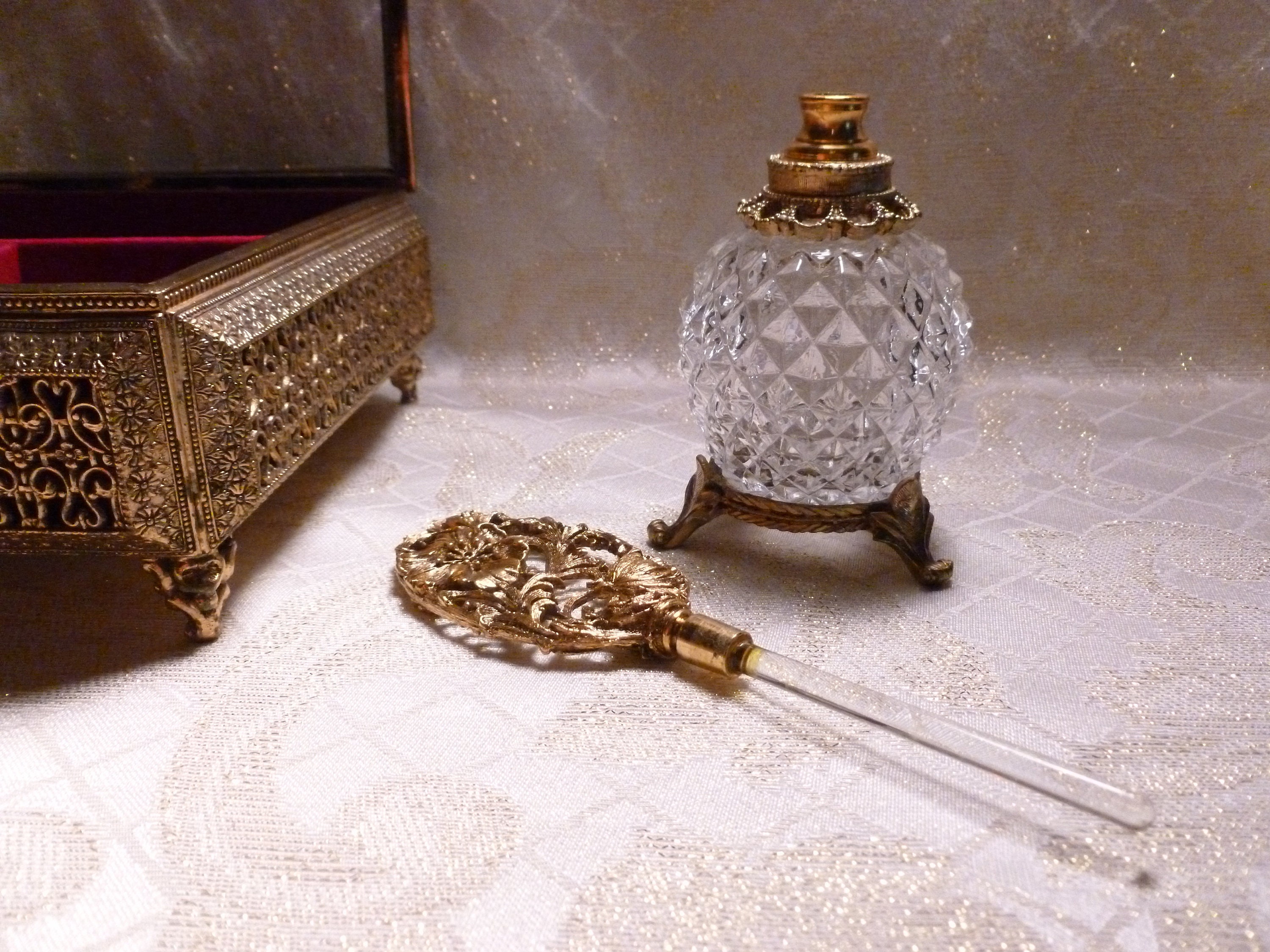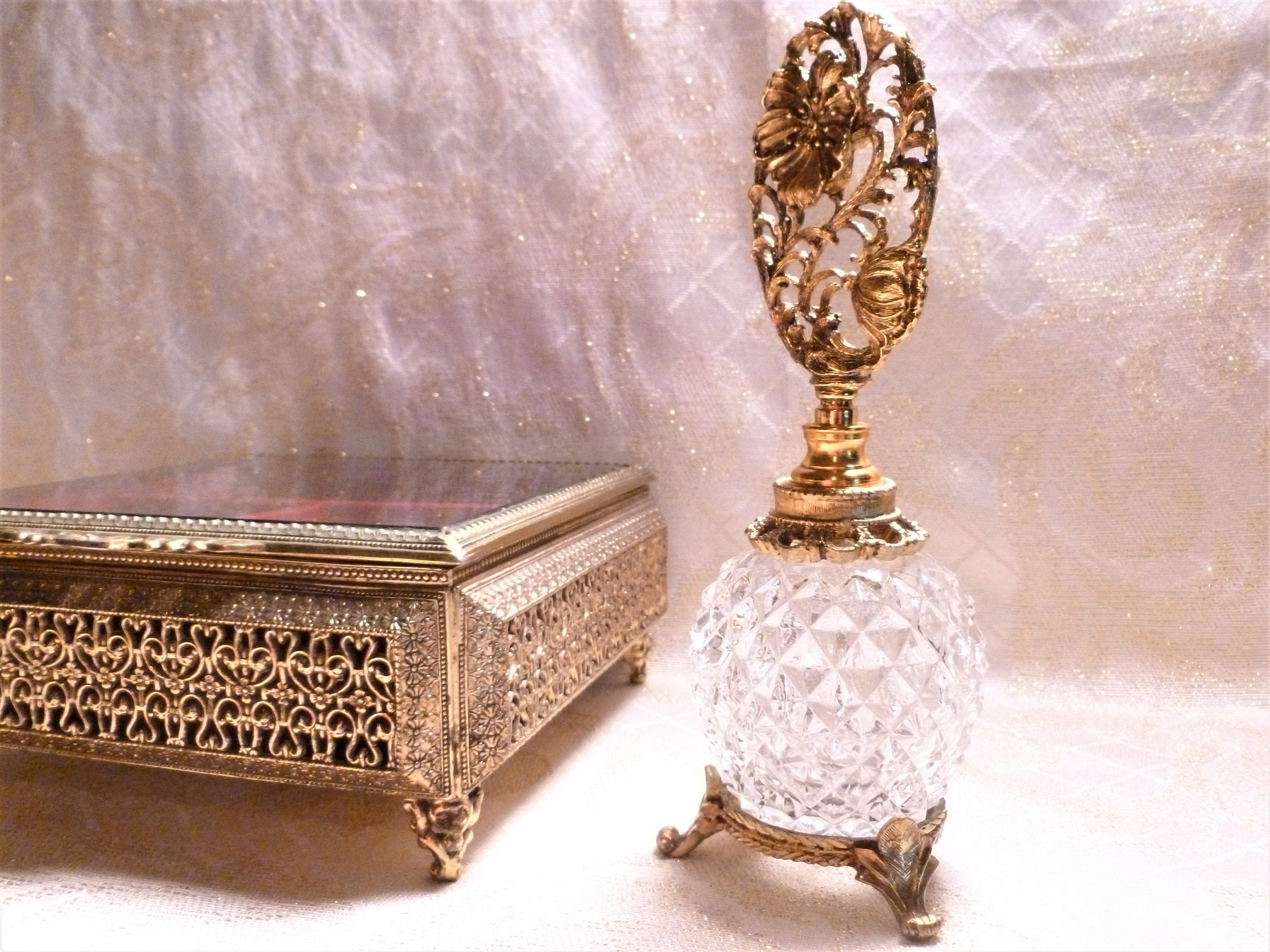 Vintage golden floral filigree jewelry box with little feet, red velvet lining and hinged glass lid. Beautiful display. Also a vintage english hobnail perfume bottle perched on three little feet and put together with a Matson dauber in a gorgeous dogwood flower design. Exceptional display, as is and in excellent condition. Was never sold together as a set but looks beautiful together. Measurements are jewelry box 7 1/2 inches long 7 1/4 inches wide and 3 1/4 inches tall perfume bottle is 7 1/2 inches tall and 3 inches wide at feet. Ideal vintage collectible gifts.